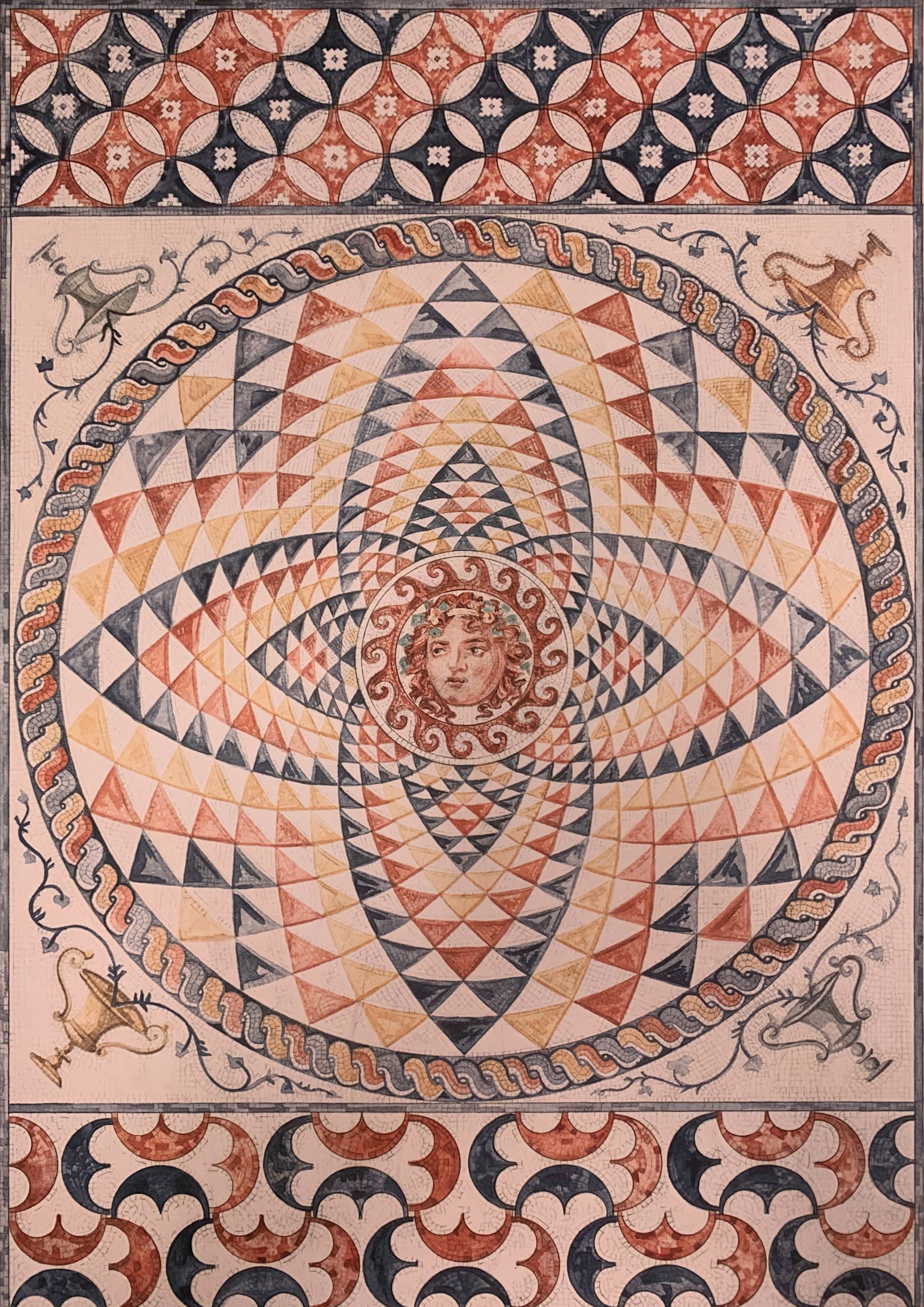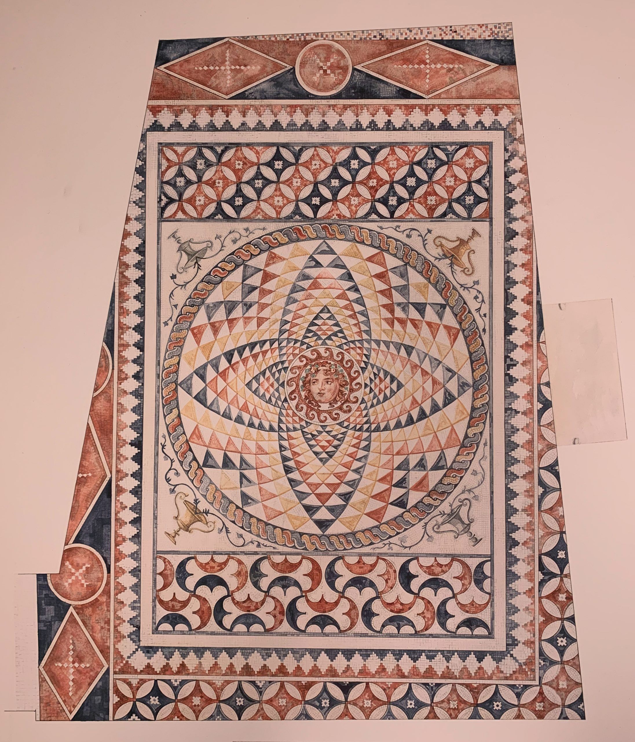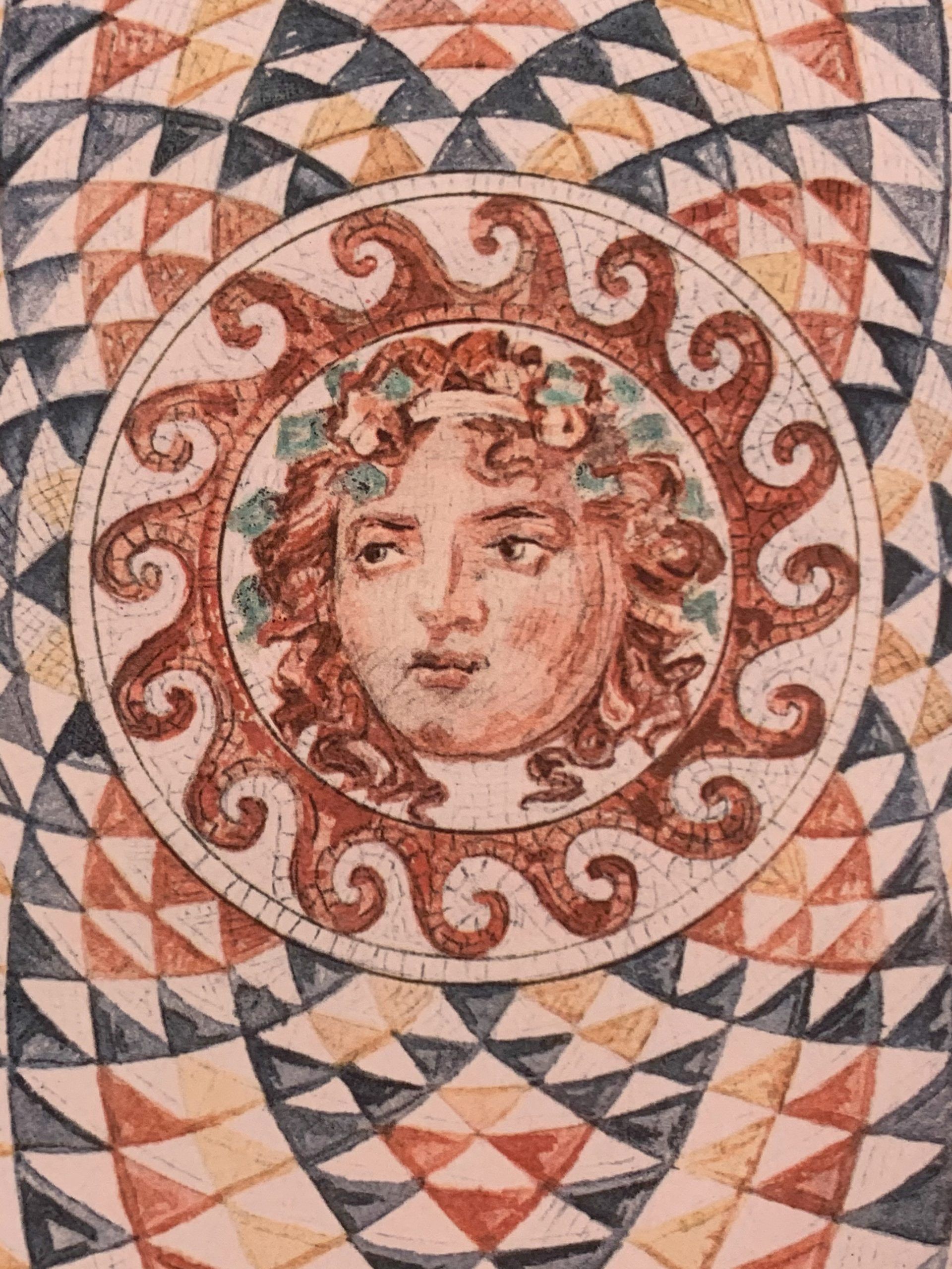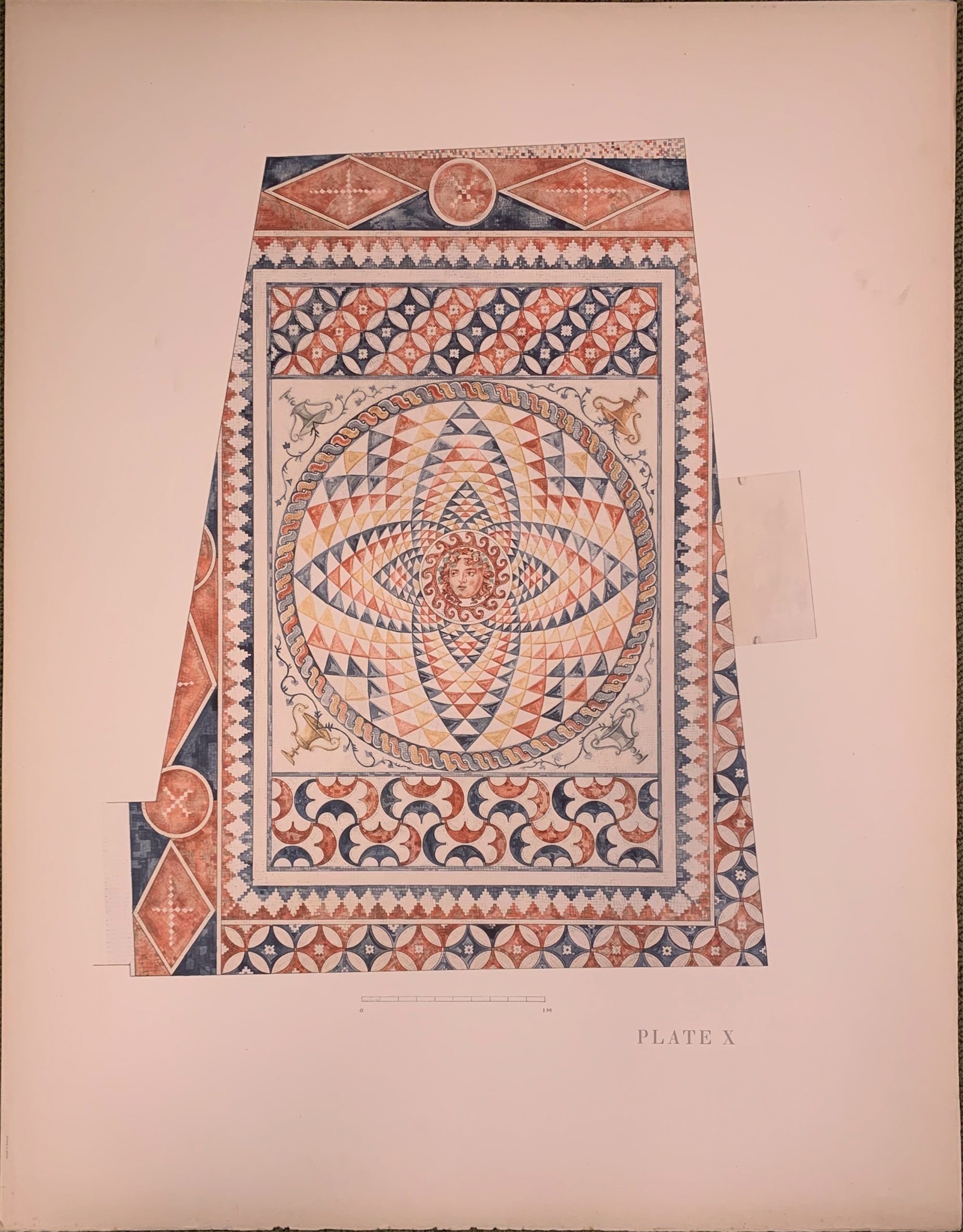 Meanwhile, Jane Norton Grew Morgan visited Corinth in 1924 and was fascinated by it, so she financed the excavation of the villa which the Shears had discovered.  Later, Jane’s husband, J. Pierpont Morgan II, financed the production of a folio to document these magnificent discoveries, Corinth: Results of Excavations Conducted by the American School of Classical Studies at Athens, Volume V:  The Roman Villa.  This folio, written by Dr. Shear, contained a detailed discussion of the excavation and site as well as 13 plates, most made from watercolors which Nora Shear had painted, showing some of the excavated buildings.  The plates in the folio are magnificent in size and content, the size dictated by the participants’ desire to produce the head of Dionysus as a frontispiece in exact facsimile of the size of the mosaic itself.