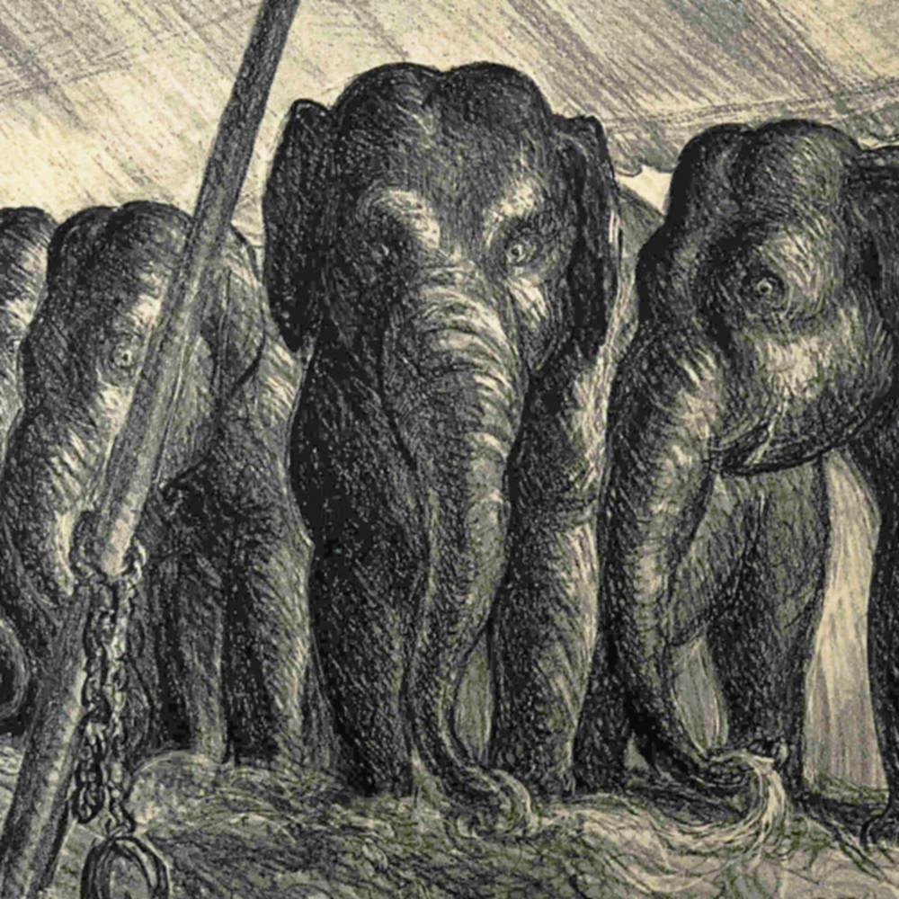 Circus Elephants presents 12 elephants standing in a line under a tent, eating hay. Their massive forms diminish as they recede diagonally into the background, interrupted only by two tent stays that lean toward them and divide the space. The various positions of the elephants’ trunks give the scene a sense of gentle undulation. The artist captured the figures and expressions of the two elephants on the right very effectively, with the result that they have a greater sense of individual personality than their companions and seem to converse with one another. The small head of the zebra in the left foreground accentuates the elephants’ enormous bulk.