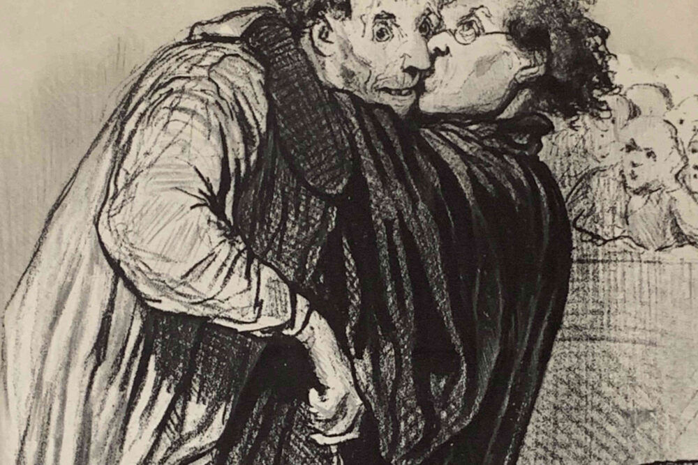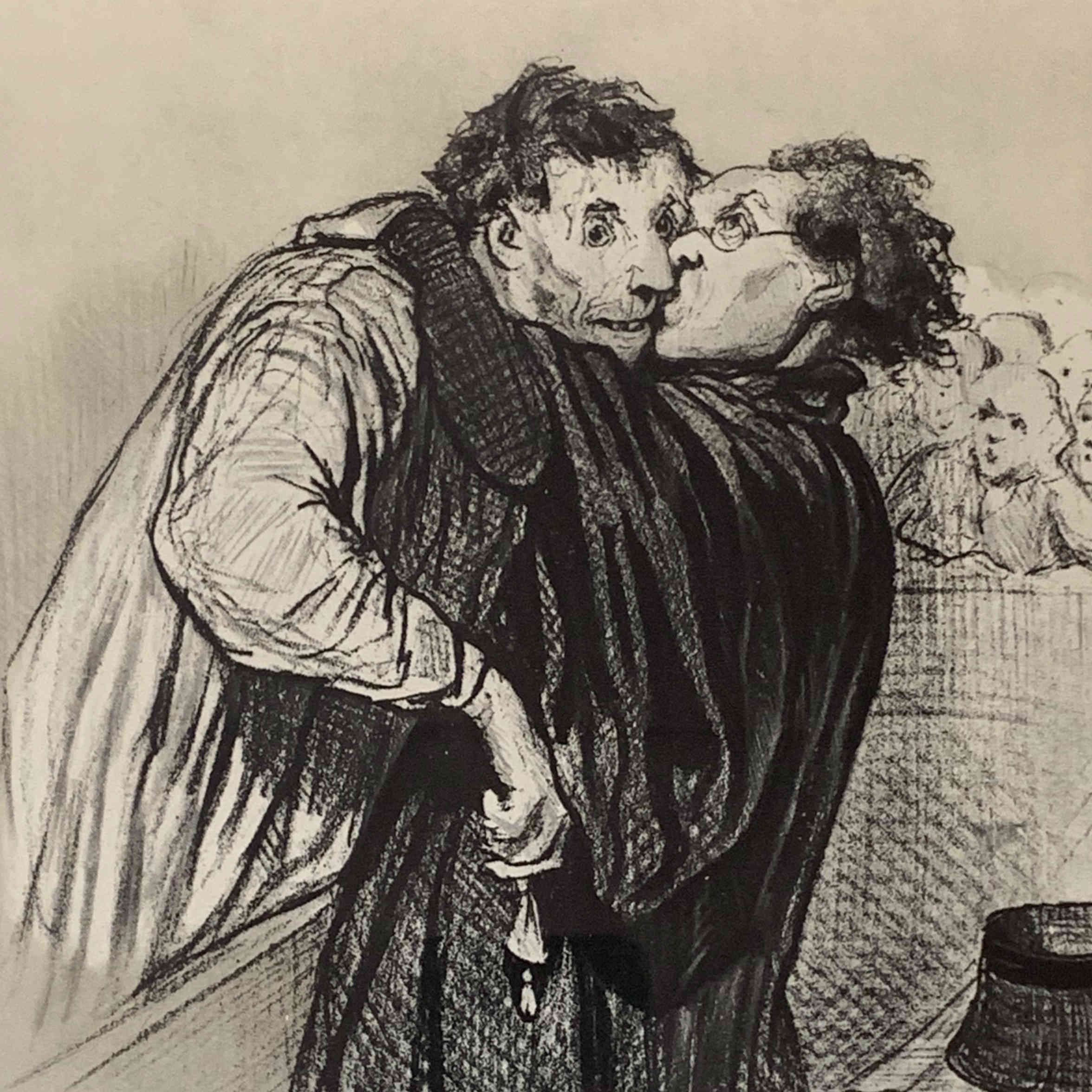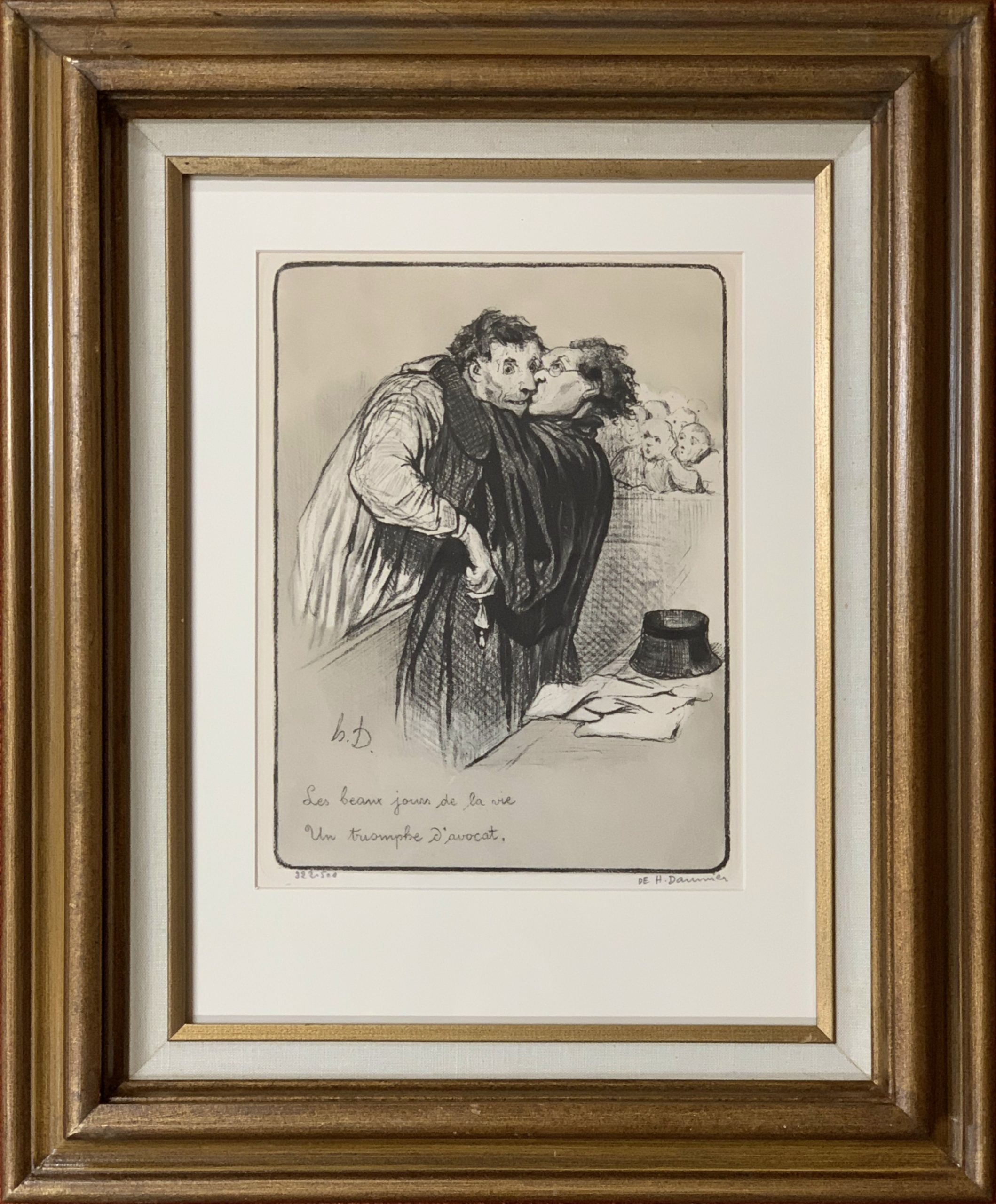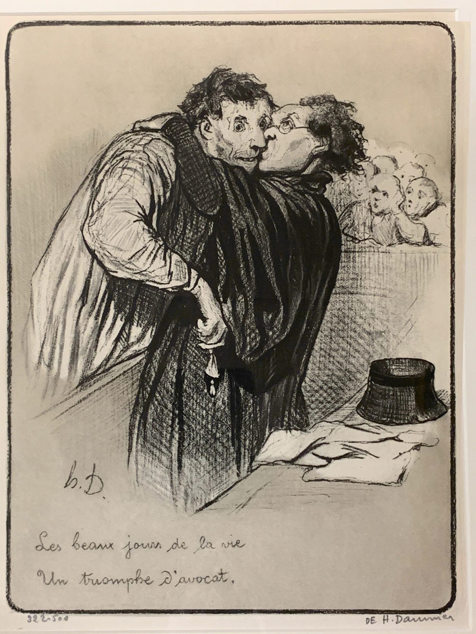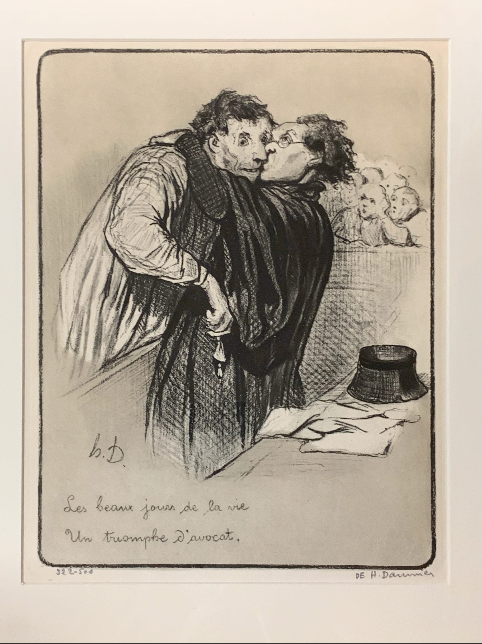 This lithograph, Plate 42 of the Les Beaux Jours de la Vie series, was published in Le Charivari on February 23, 1845. Titled, ”Un Triomphe d’Avocat” [The Triumph of a Lawyer], is commentary on the job of the lawyer. The text tells the story: