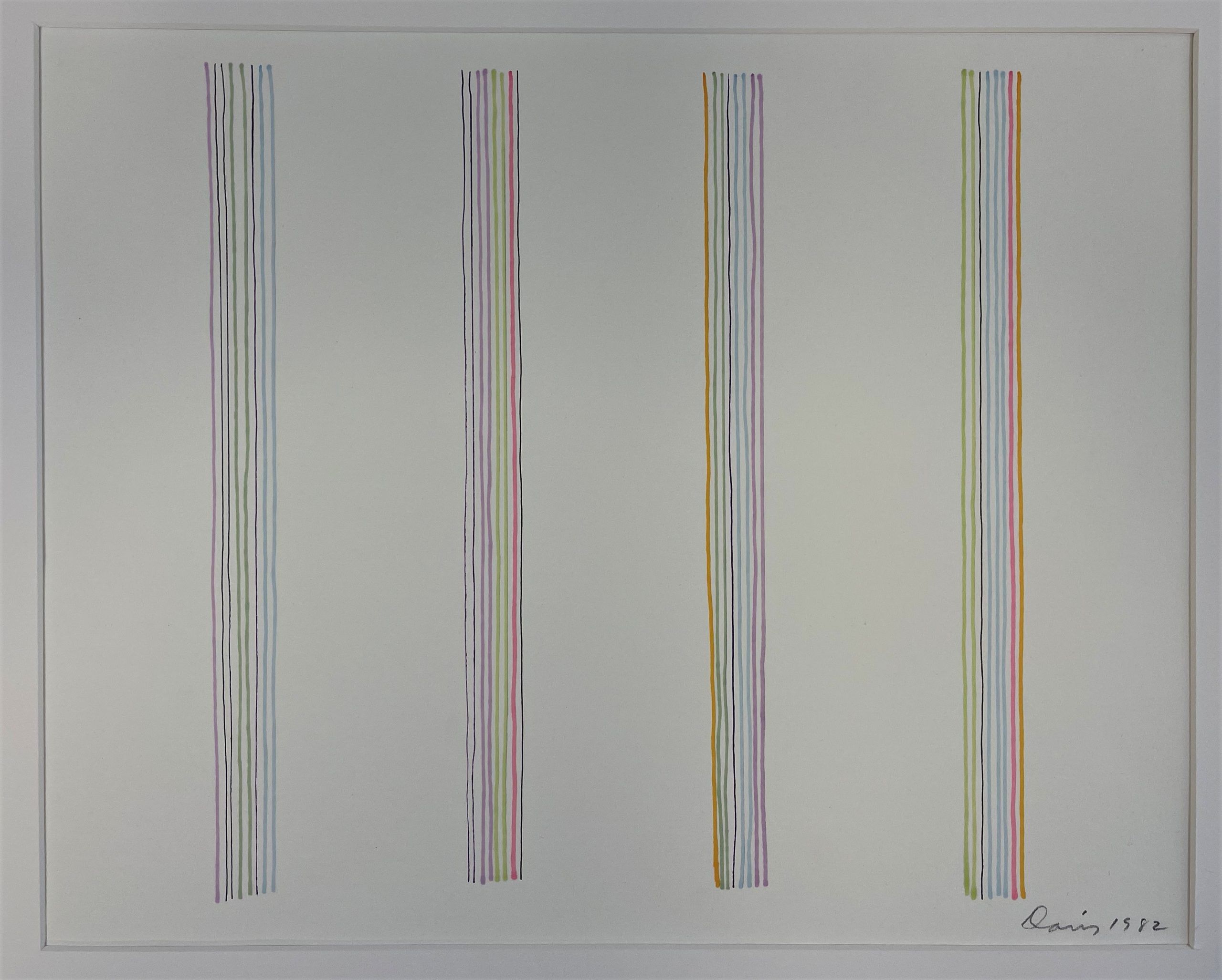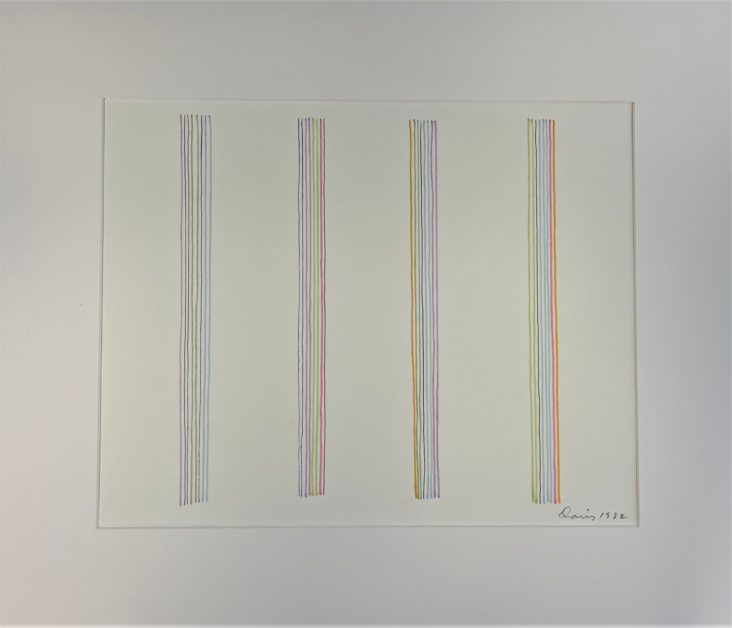 Art historians and color theorists have often discussed that Davis’ stripe works were not based on conscious use of color theory; Davis often compared himself to a jazz musician who plays by ear, describing his approach to painting as ​”playing by eye.” His goal in his work was to make complex schemes that lend themselves to sustained periods of viewing. Davis suggested to his viewer, ​“instead of simply glancing at the work, select a specific color—and take the time to see how it operates across the painting.—Enter the painting through the door of a single color, and then you can understand what my painting is all about.”