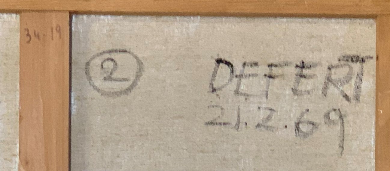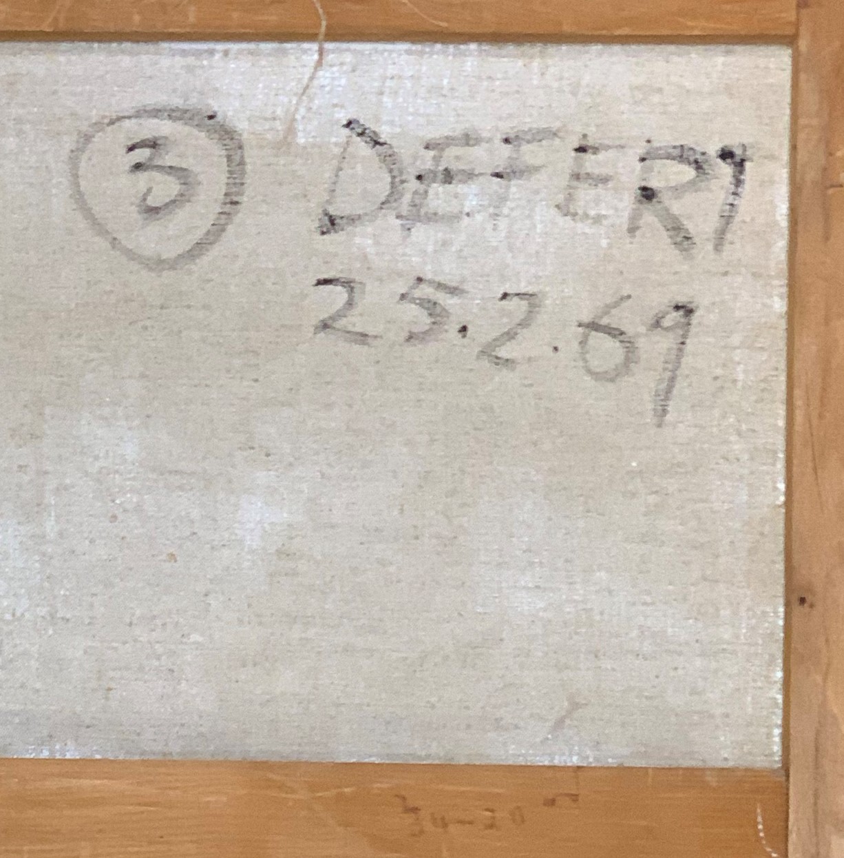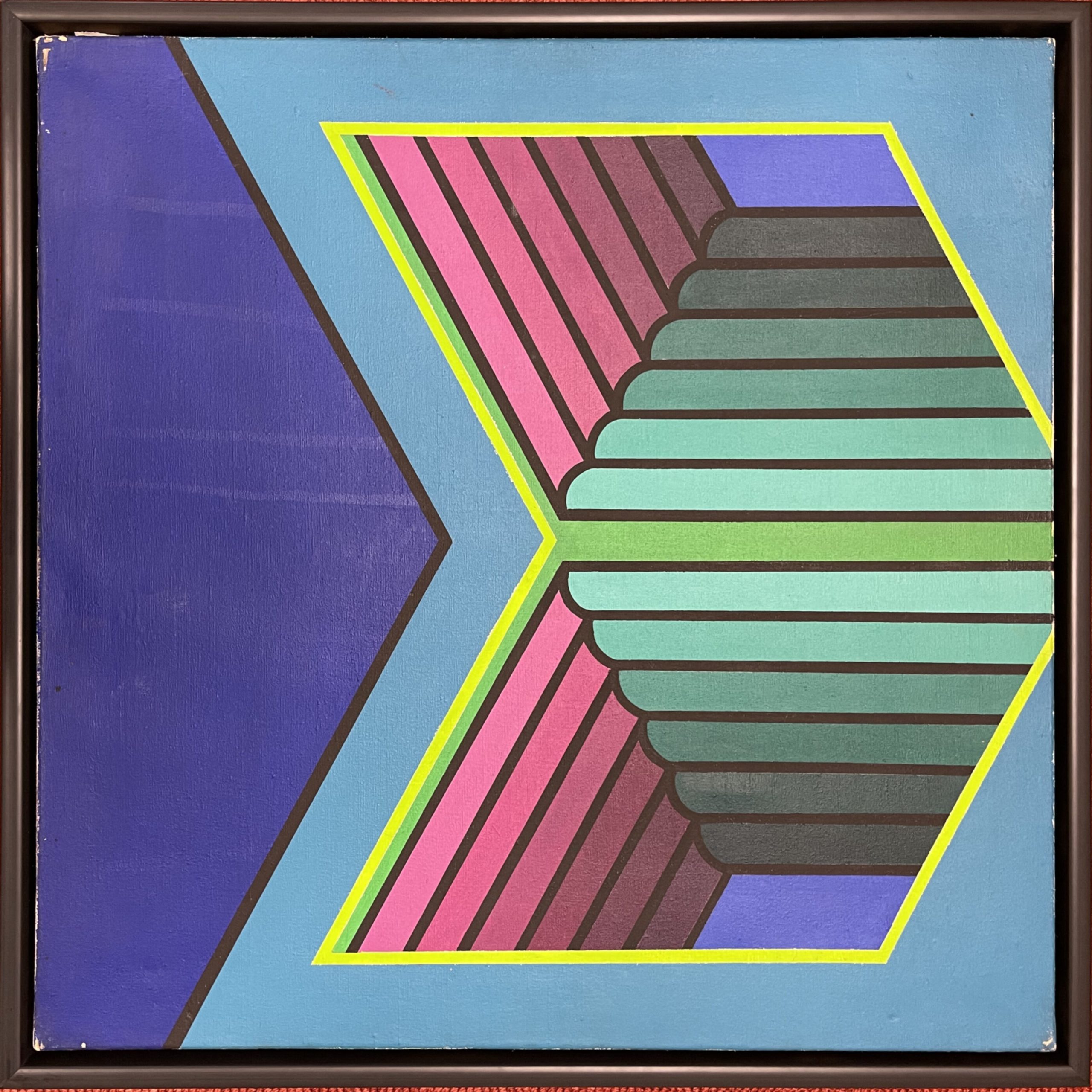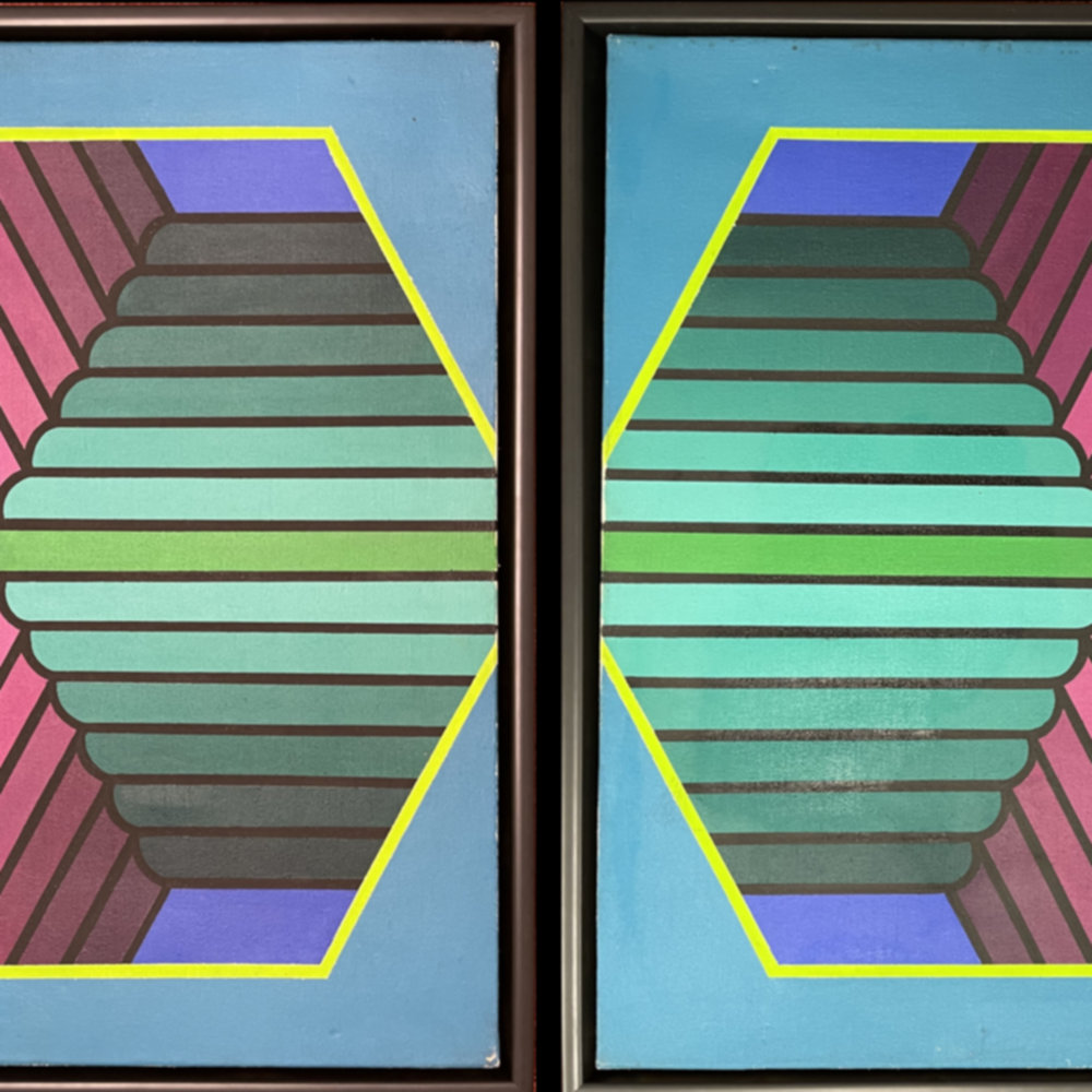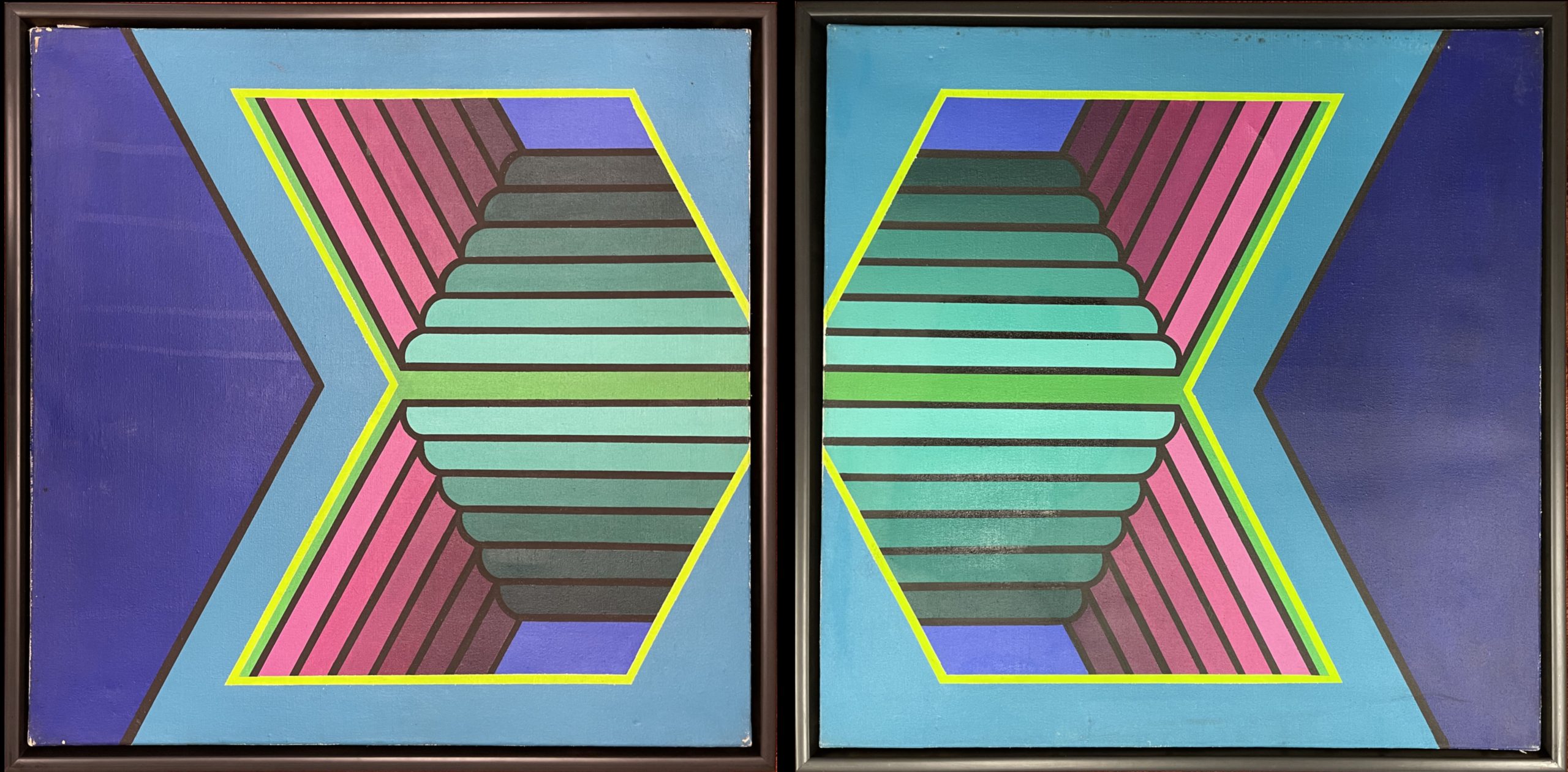 Maxime Defert was a geometric painter, exploring shapes and angles, but also a colorist of formidable ability. This diptych is comprised of two paintings, each 24 inches square (28 inches square in the frame), which can be hung both upright or side-to-side “pointing” at each other.