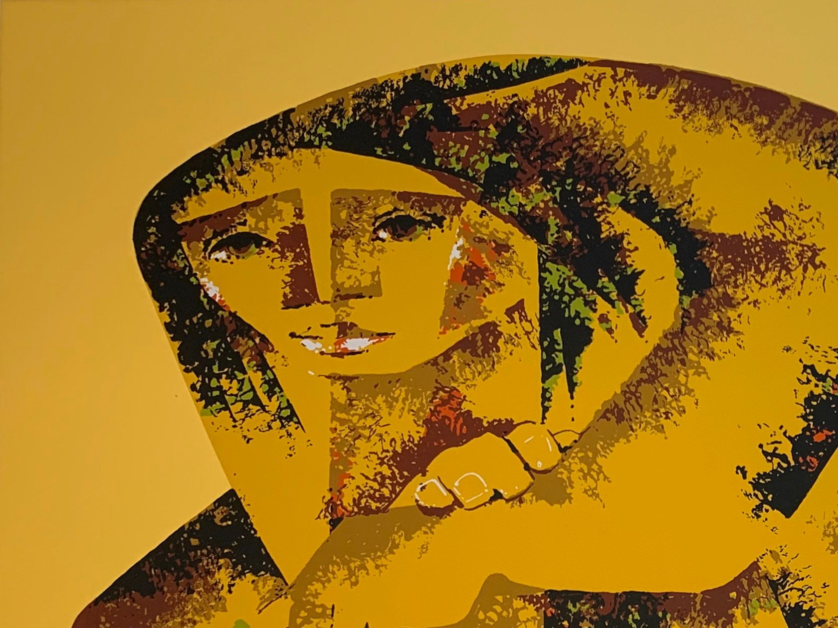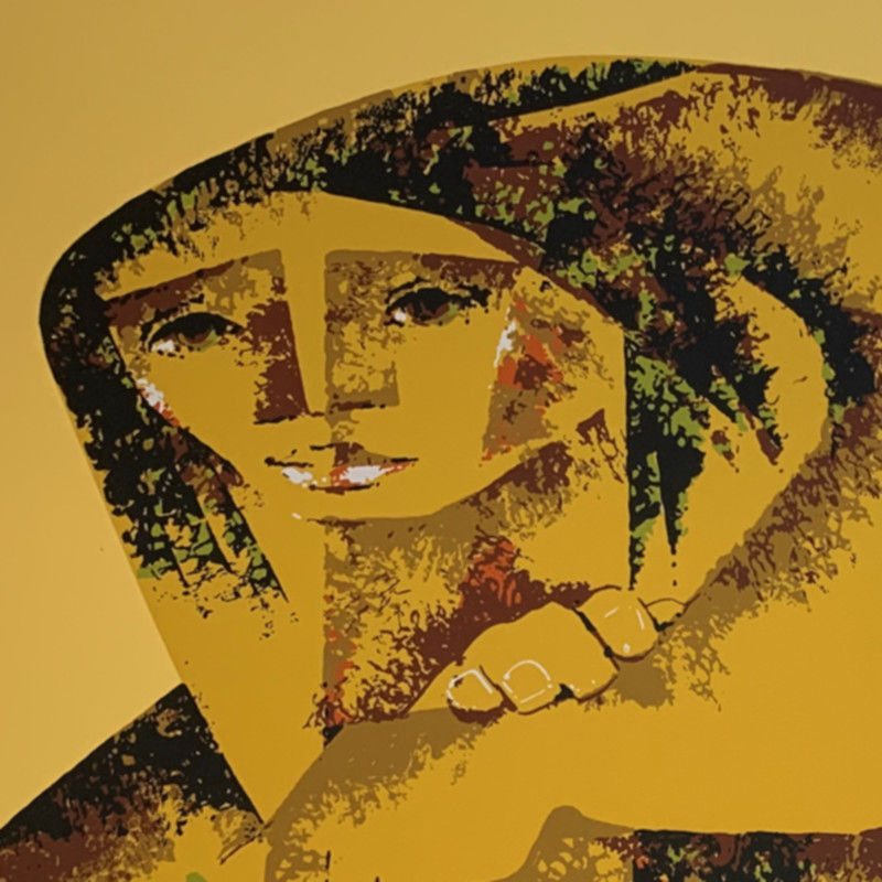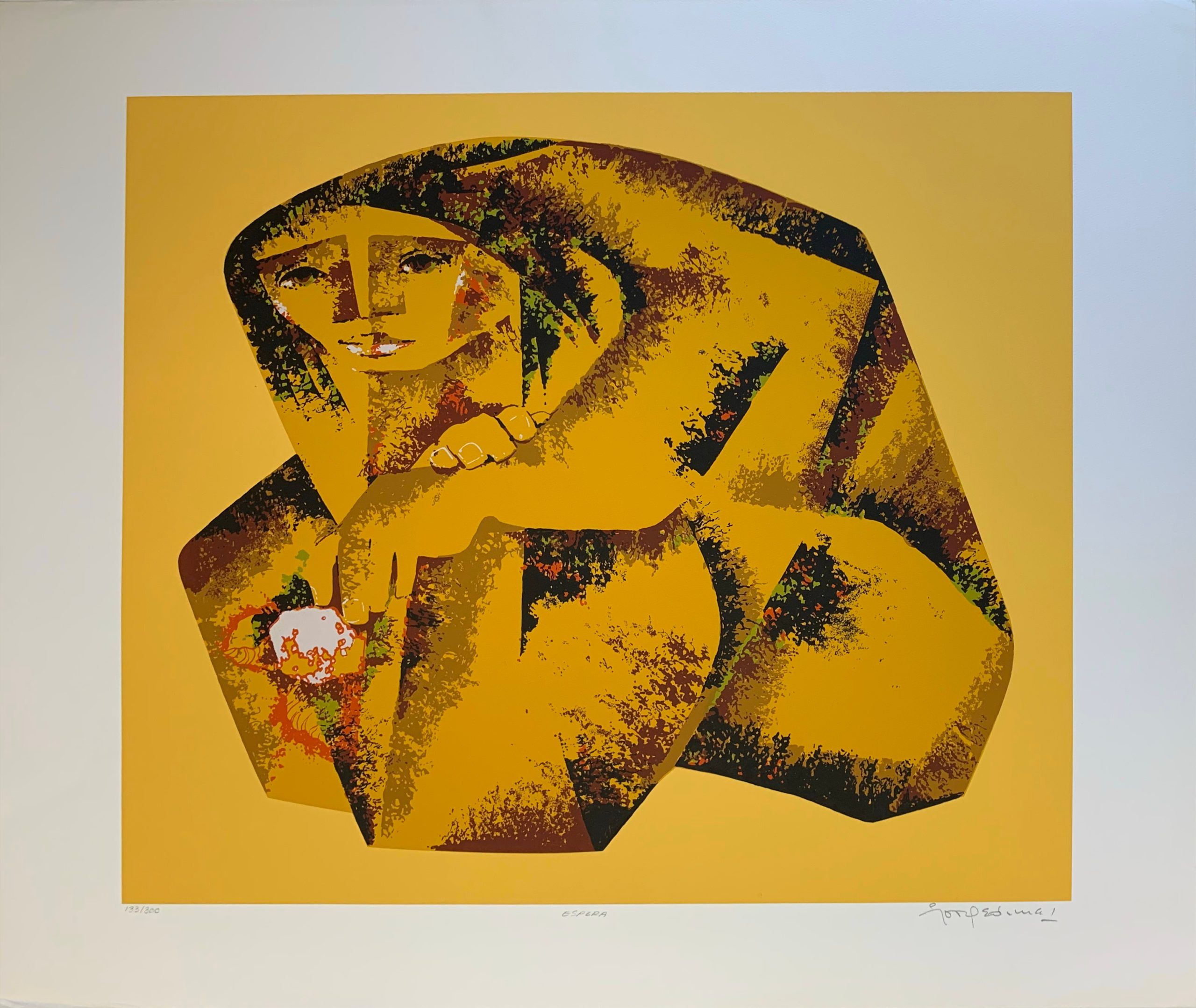 This cubist lithograph by the modernist Jorge E. Dumas is remarkably expressive.  The deep earthy yellow and richly-inked picture give it great presence.  This is not a picture for a hidden place or tiny room.