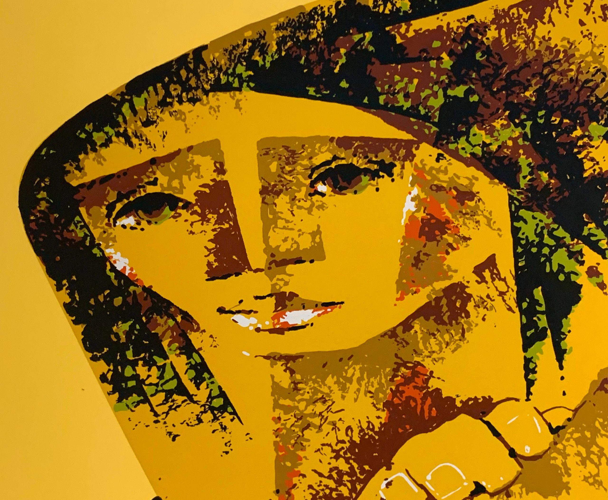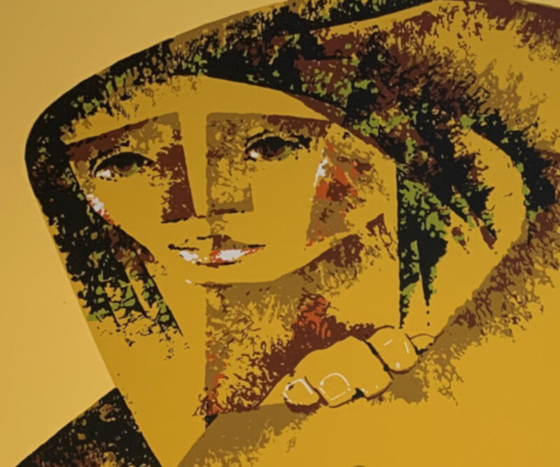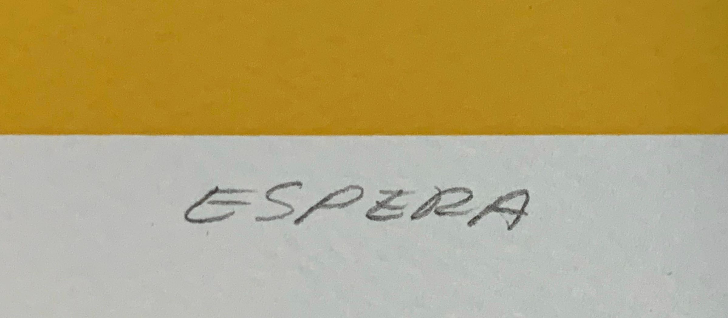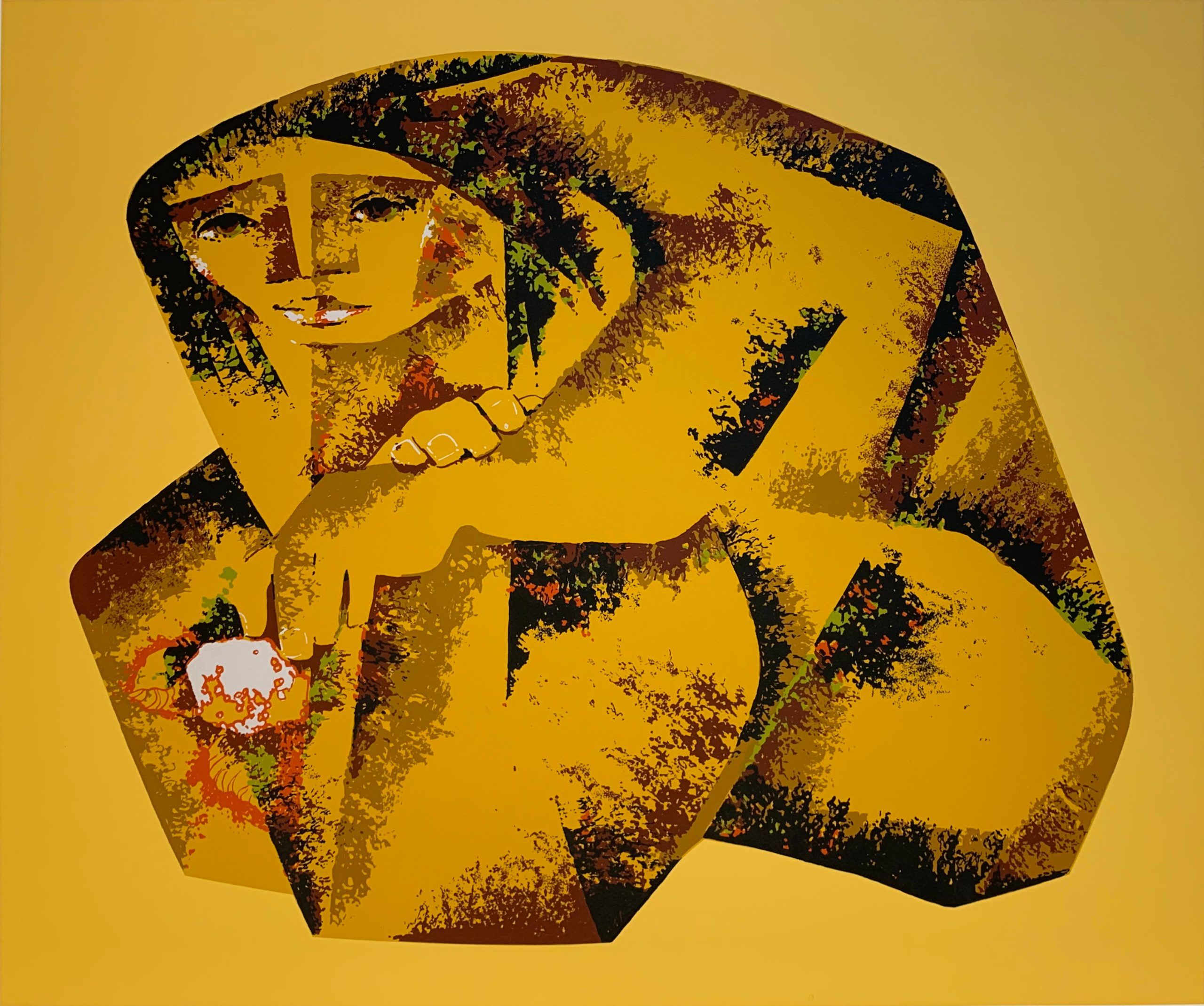 This cubist lithograph by the modernist Jorge E. Dumas is remarkably expressive.  The deep earthy yellow and richly-inked picture give it great presence.  This is not a picture for a hidden place or tiny room.