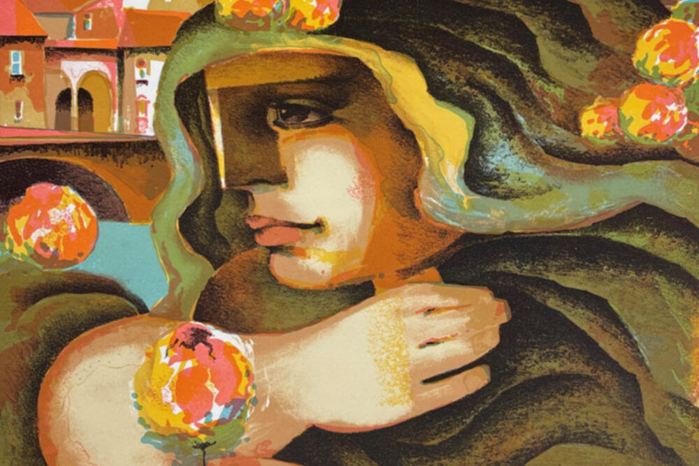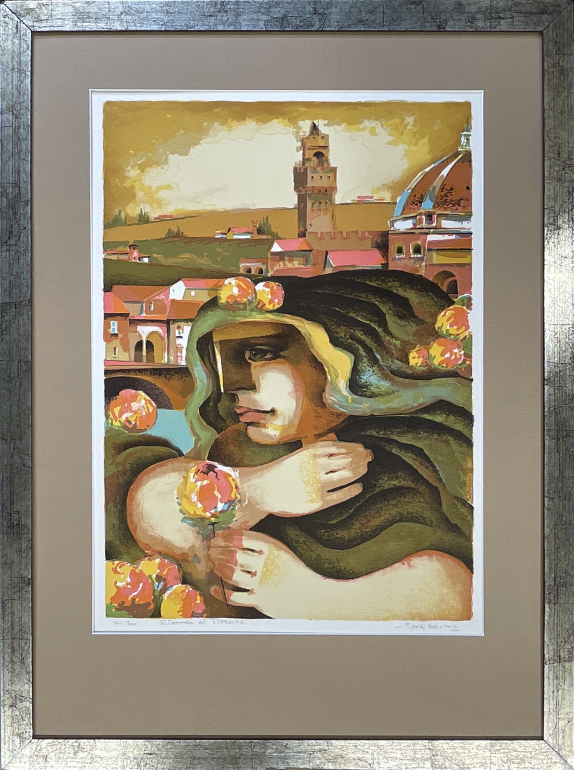 This cubist lithograph, Ricordo di Firenze (Memory of Florence), by the modernist Jorge E. Dumas, is remarkably expressive.  The deep earthy colors and richly-inked picture give it great presence.