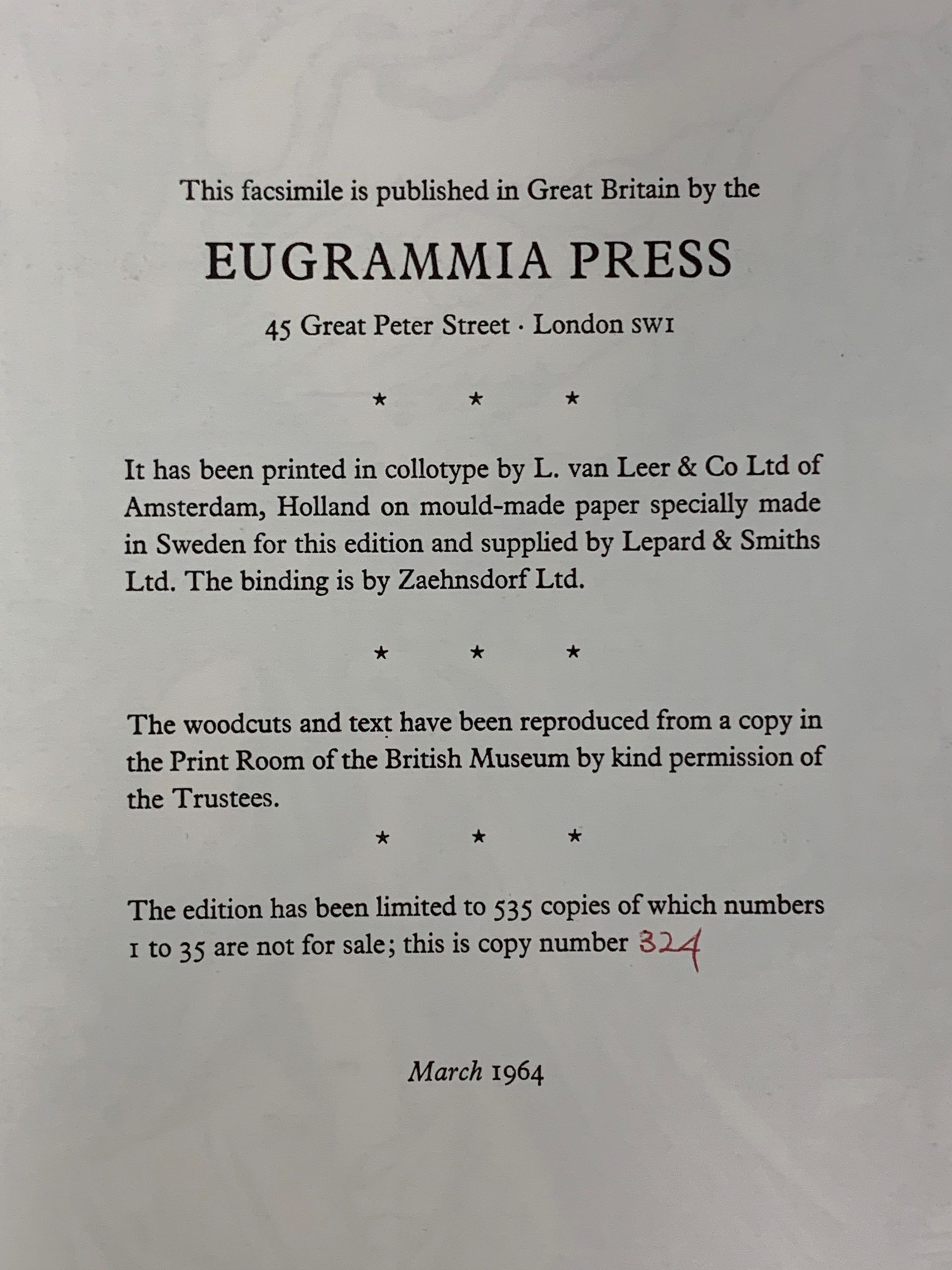 From about 1960 to 1970, Eugrammia Press in London printed less than a dozen reproductions of Fifteenth and Sixteenth Century volumes. In 1964, Eugrammia published The Angel with the Key of the Bottomless Pit. The Angel is a collotype.