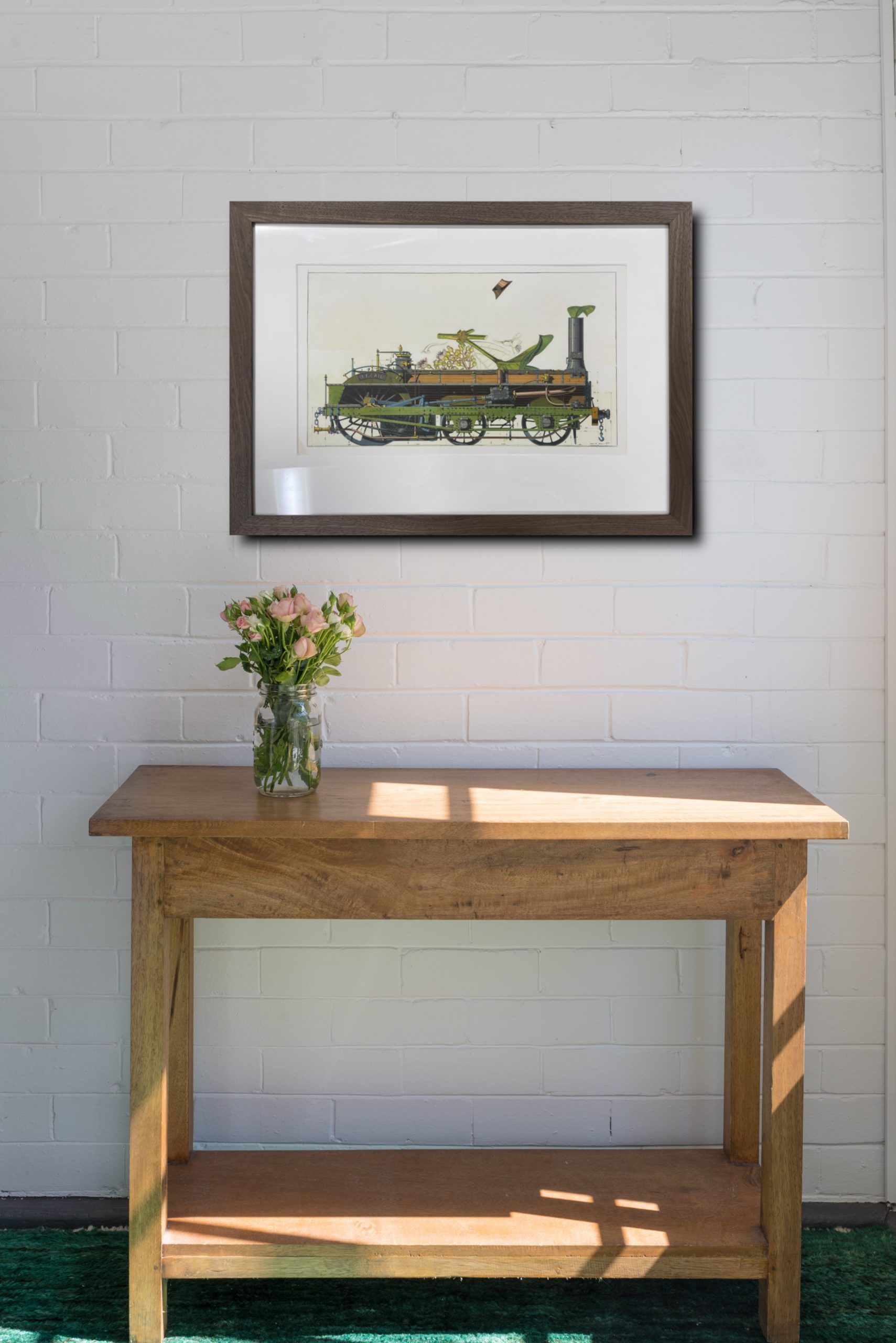 Professionally custom matted and framed in a waxed Walnut frame behind 99% UV-filtering art glass using only conservation materials.