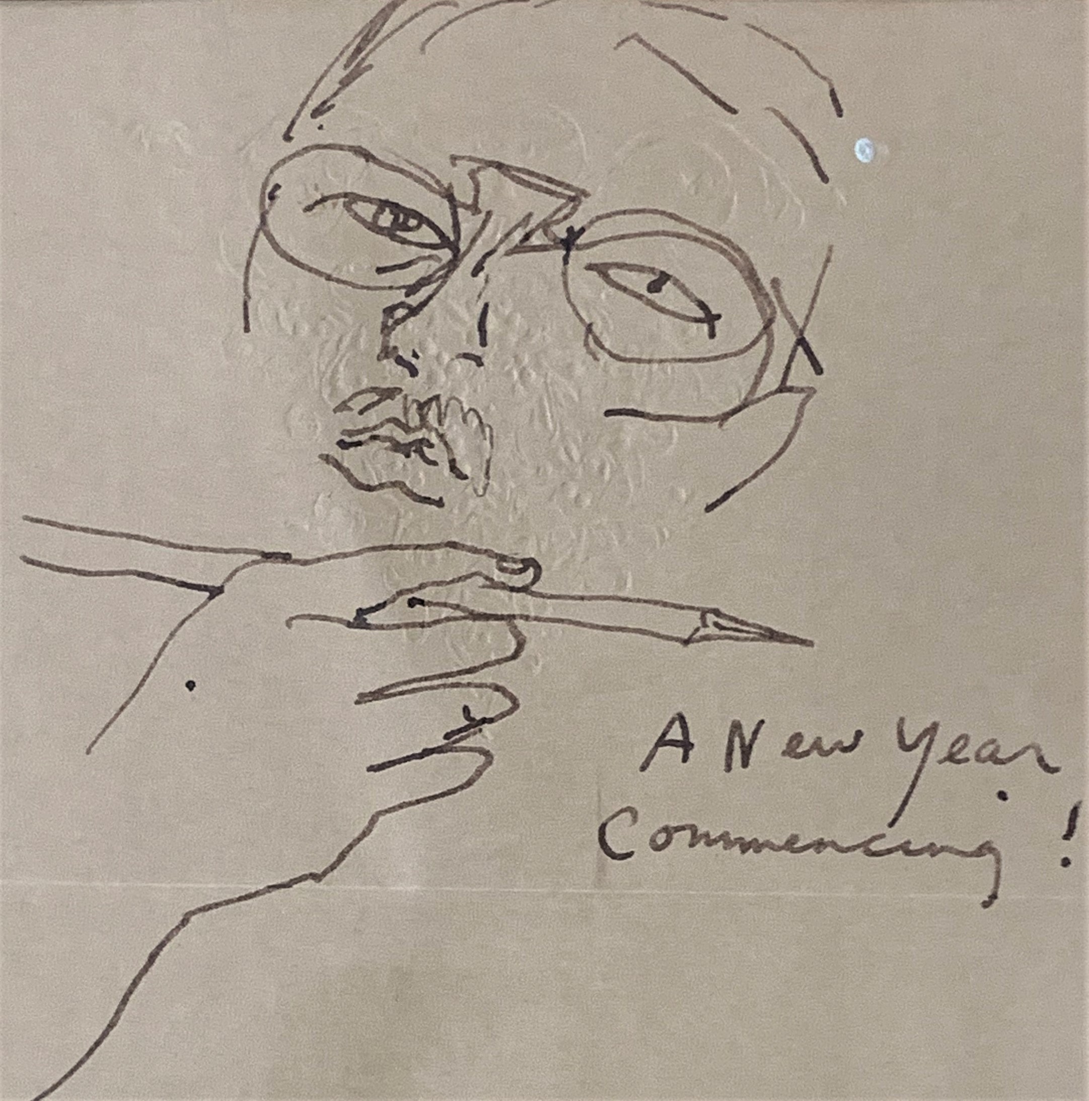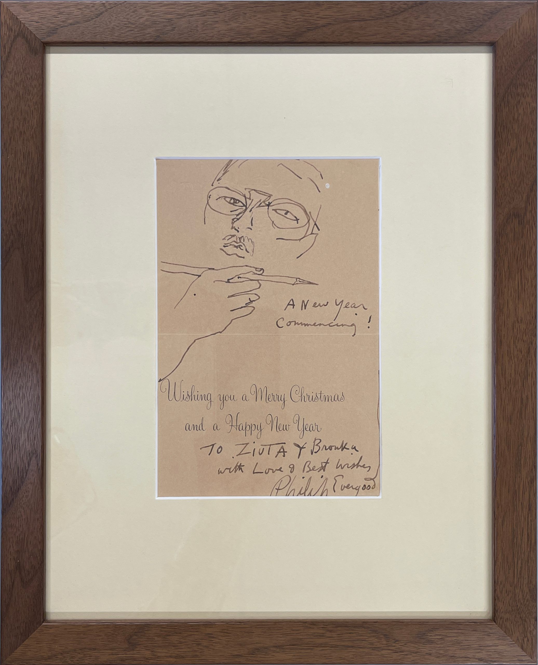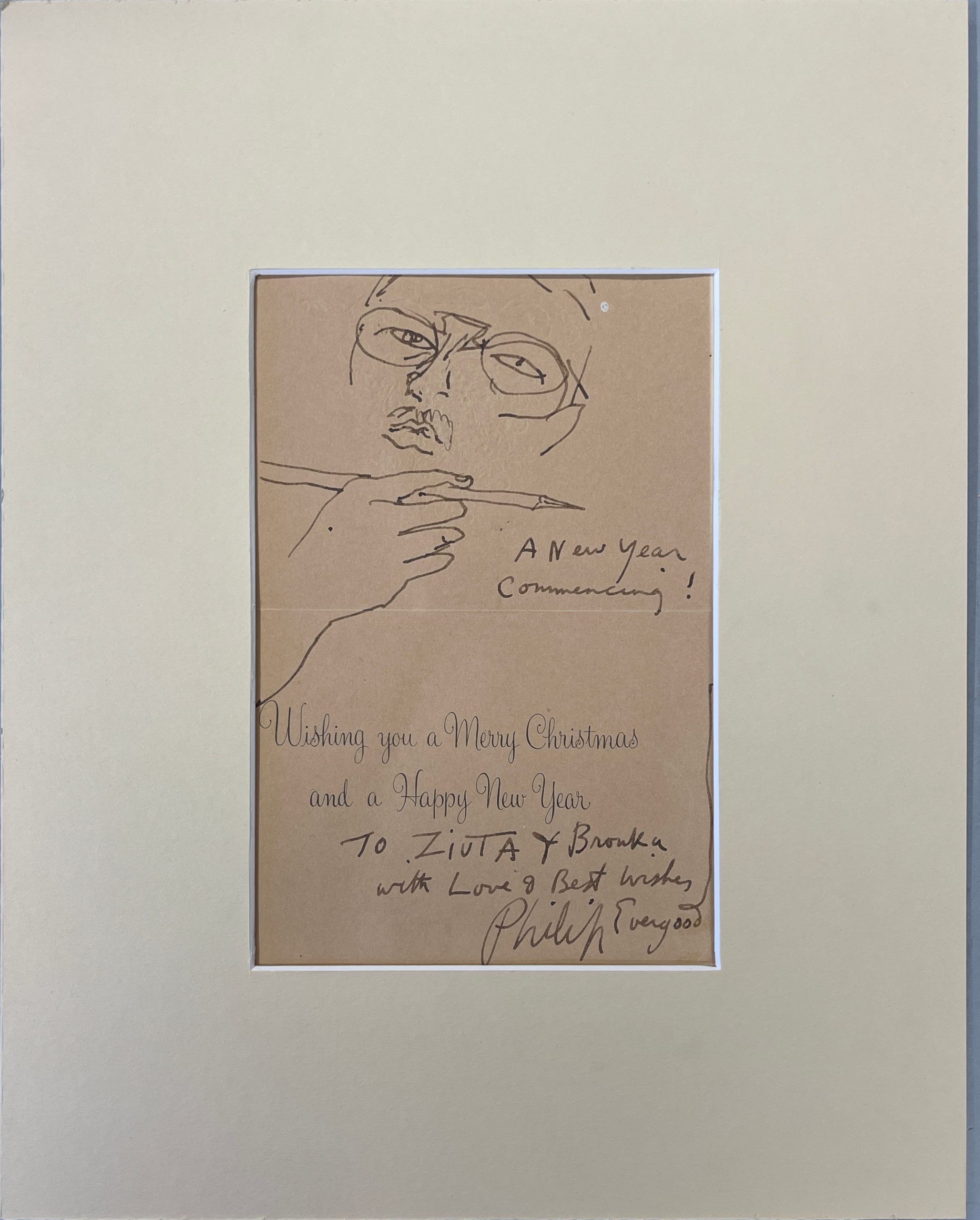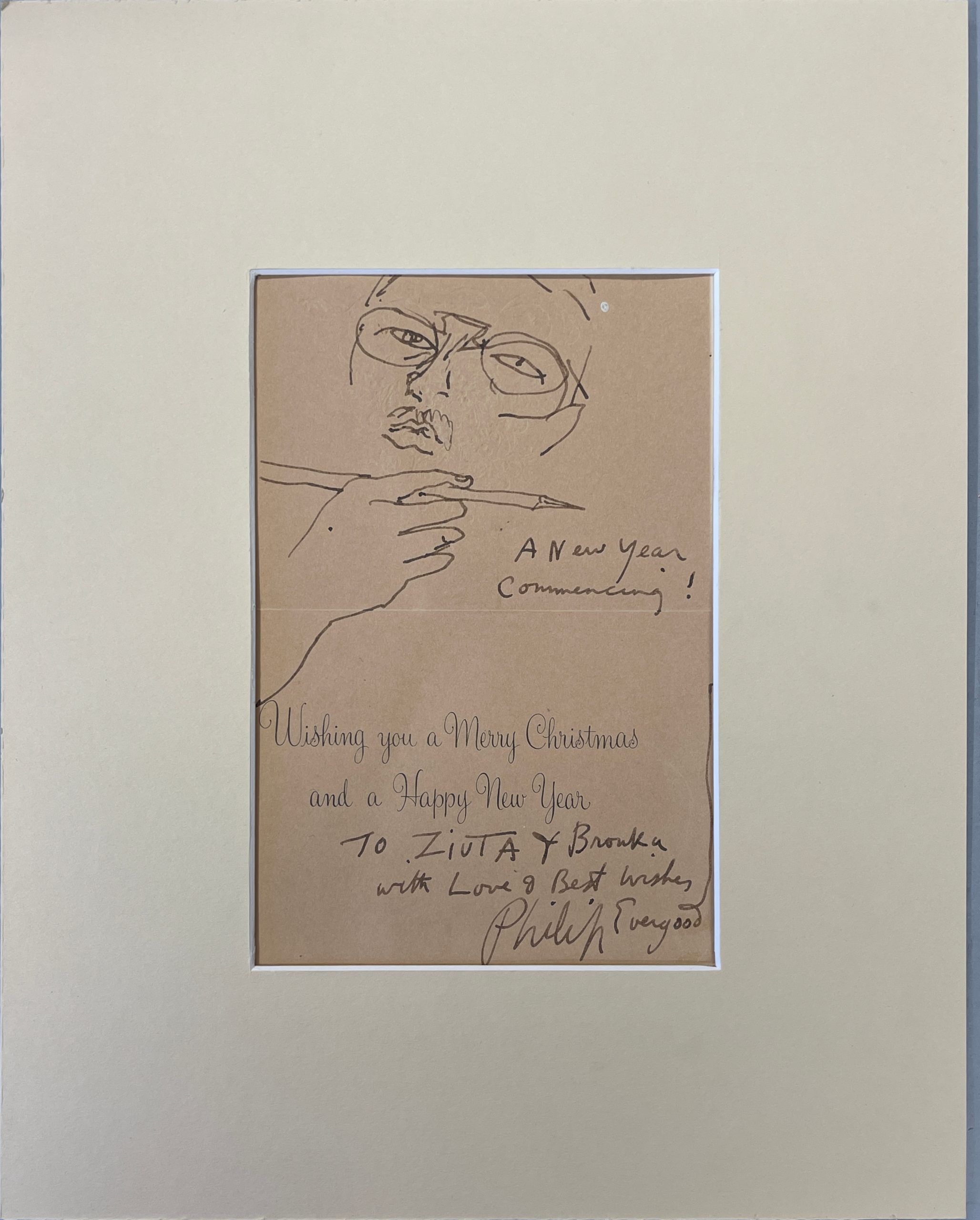 This is a self-portrait of Philip Evergood, holding a fountain pen—perhaps the same pen used to draw the picture!—and looking thoughtful, with a hand-written message, “A New Year Commencing!” written on the inside flaps of a Christmas card. With the pre-printed message “Wishing you a Merry Christmas and a Happy New Year” and personalized with “To Ziuta + Brouka with Love & Best wishes”.