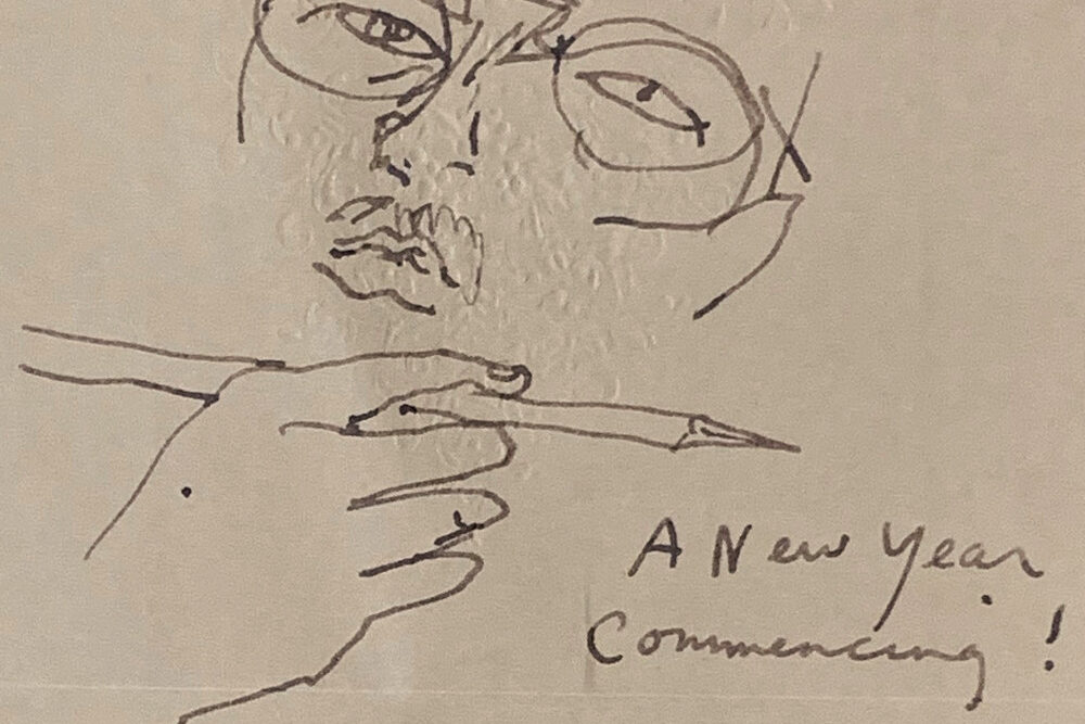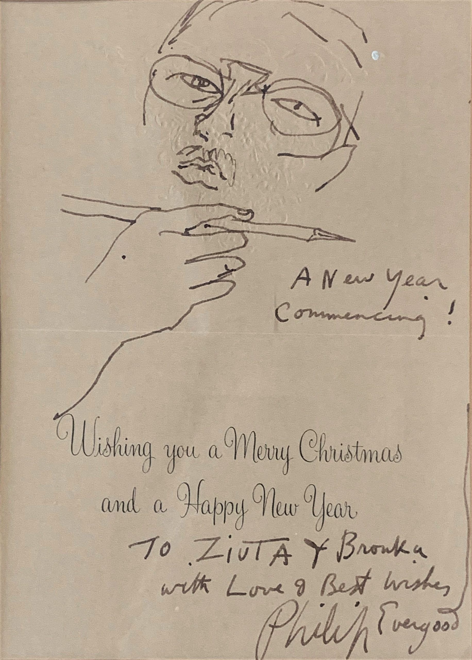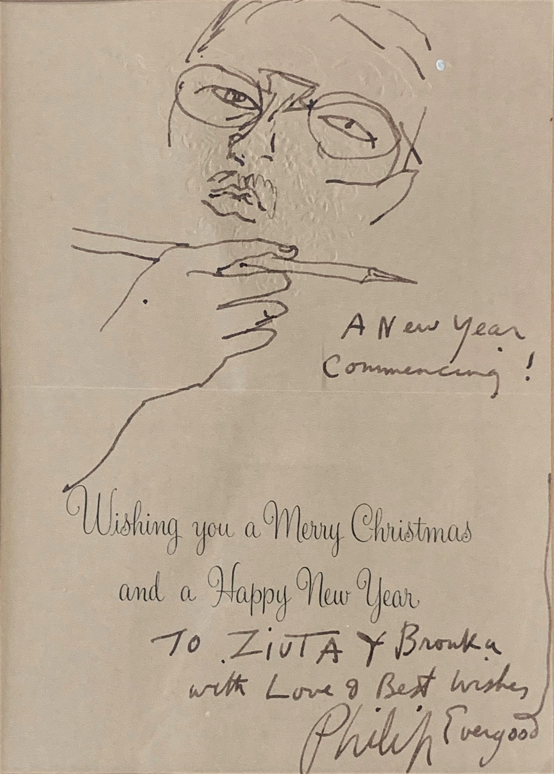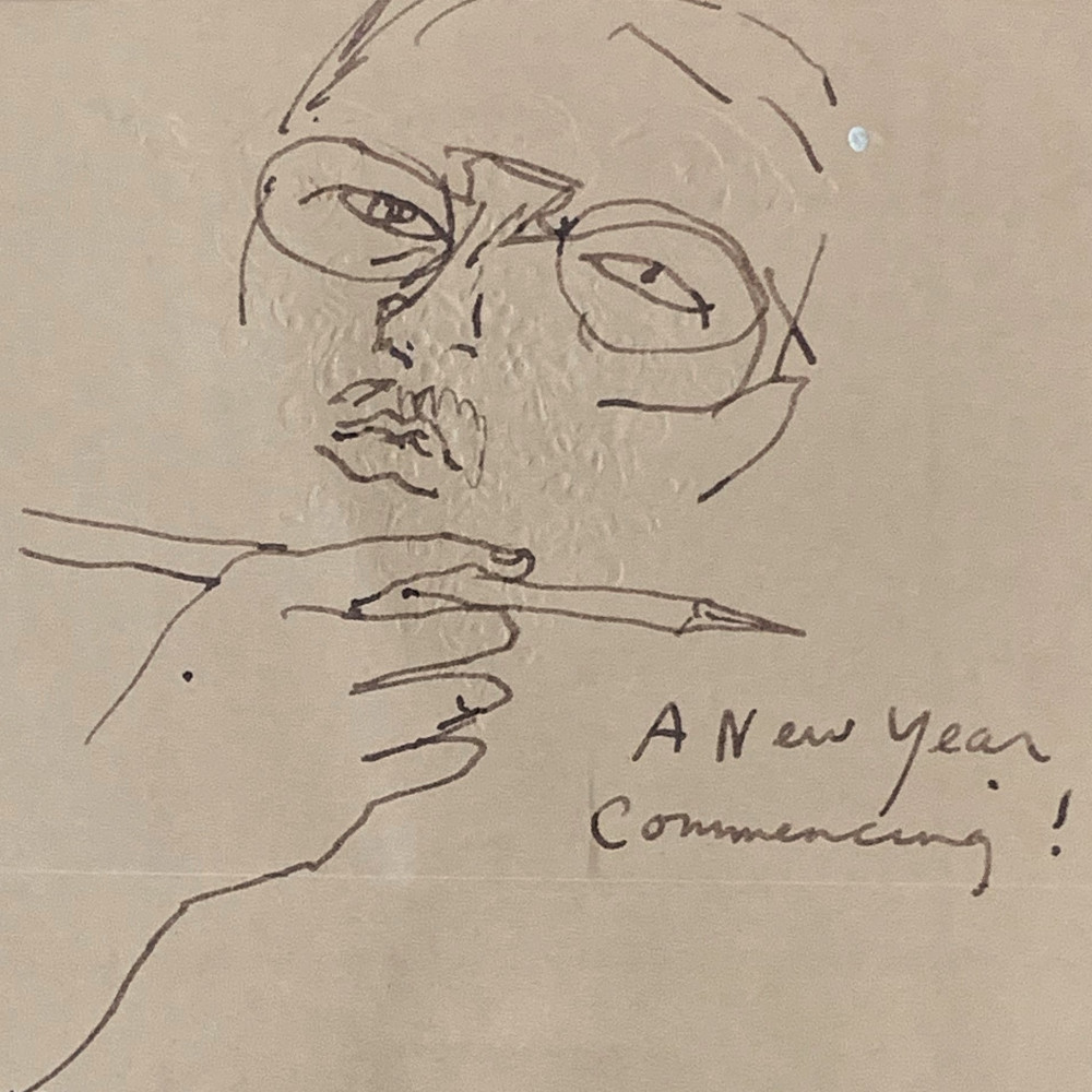 This is a self-portrait of Philip Evergood, holding a fountain pen—perhaps the same pen used to draw the picture!—and looking thoughtful, with a hand-written message, “A New Year Commencing!” written on the inside flaps of a Christmas card. With the pre-printed message “Wishing you a Merry Christmas and a Happy New Year” and personalized with “To Ziuta + Brouka with Love & Best wishes”.