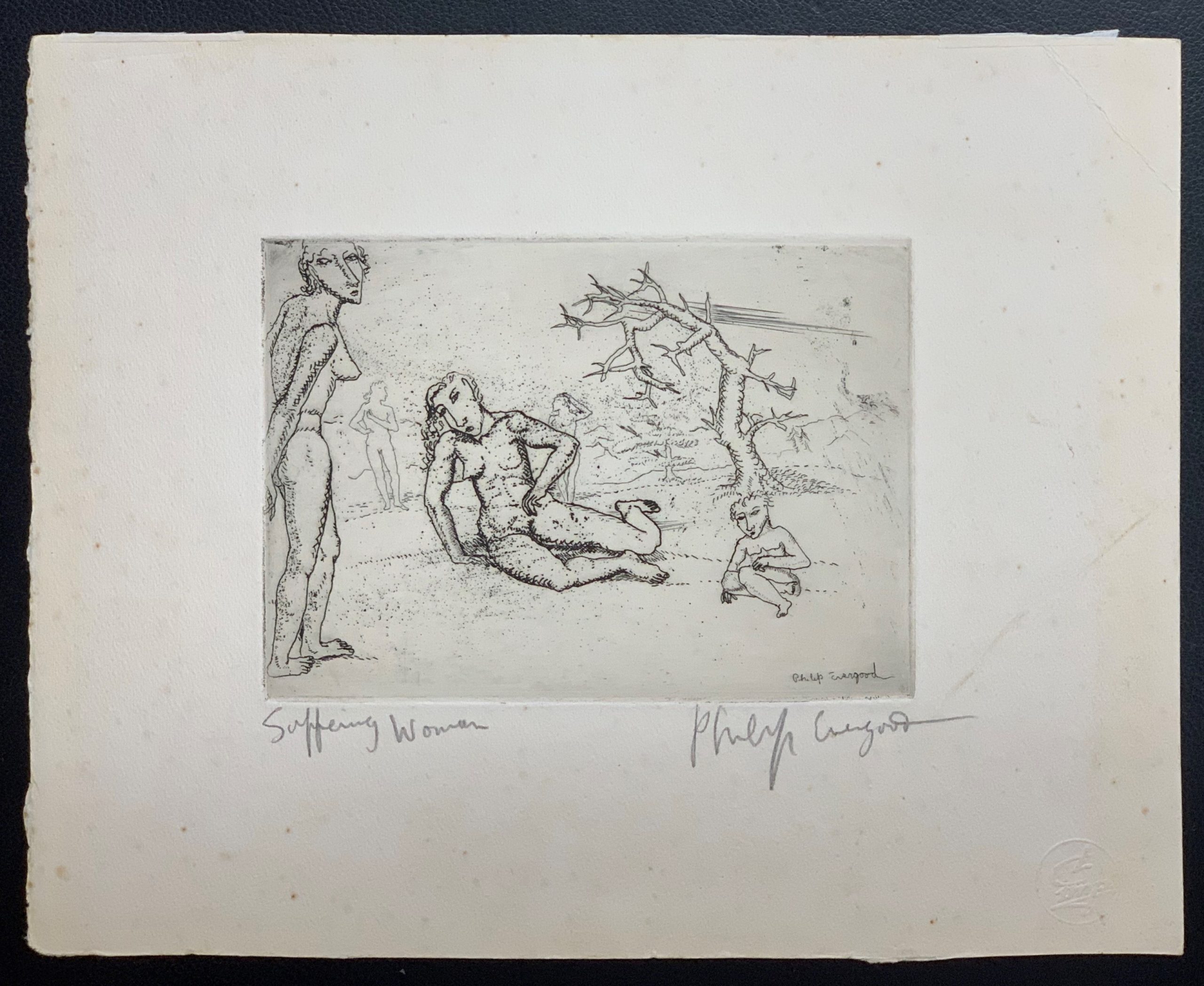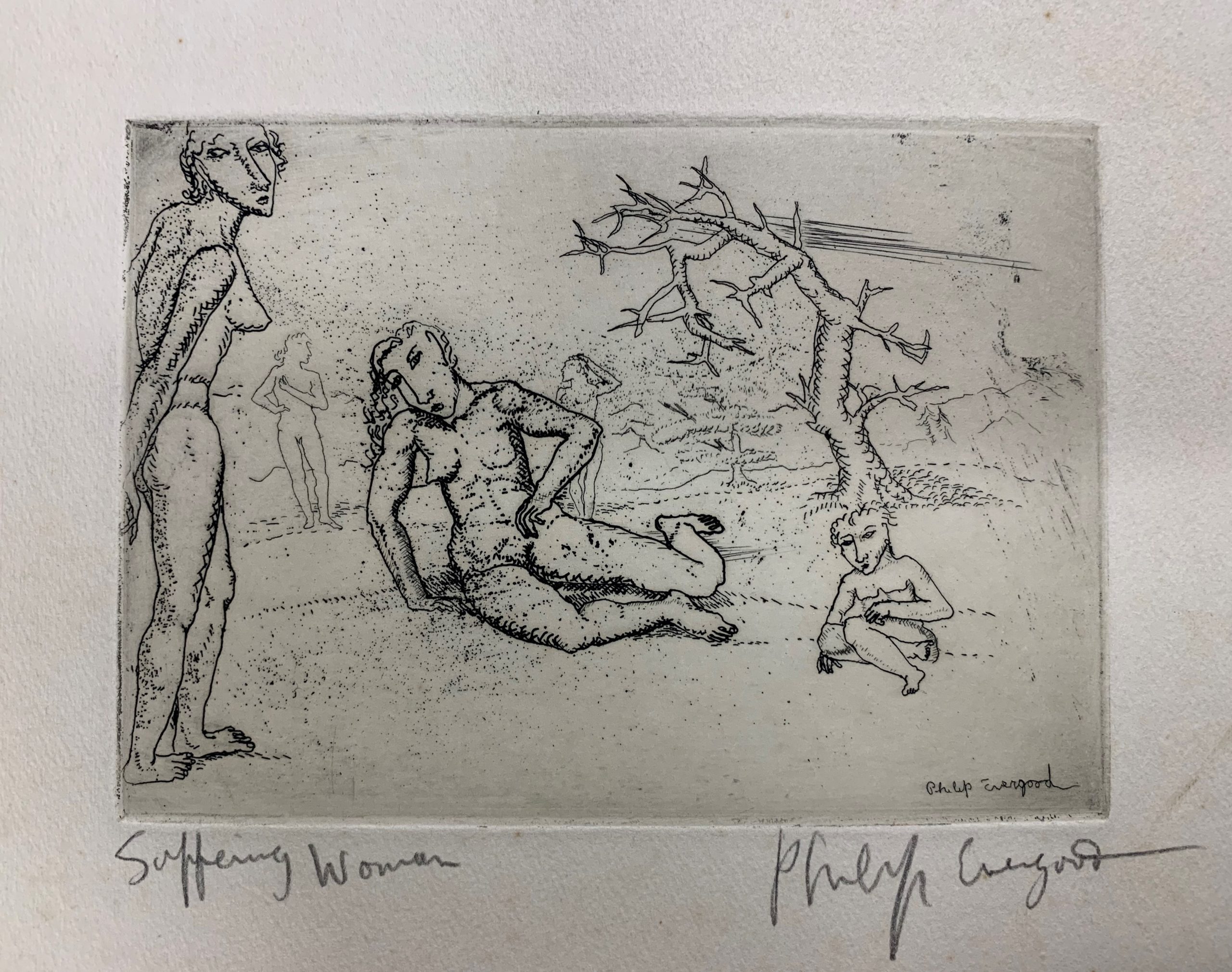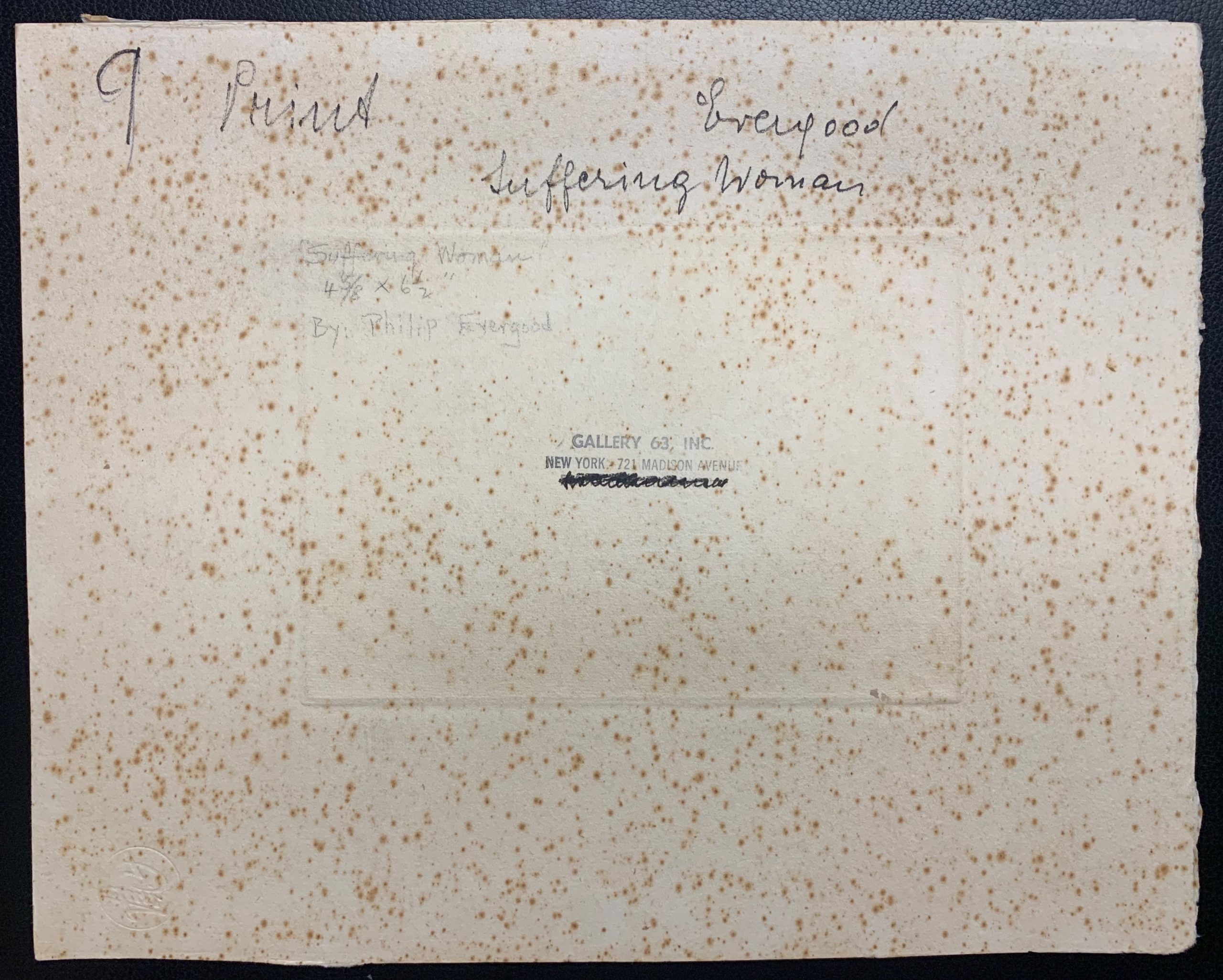 According to Lippard, it is generally unknown how many impressions of Evergood’s works were pulled. As is frequently true, Evergood’s titling was inconsistent. This work has been seen titled Woman Suffering and a different work was also titled Suffering Woman.