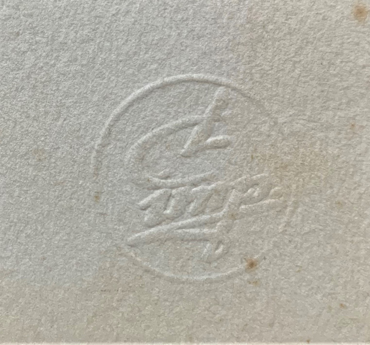 Hand-signed by the artist in pencil en recto lower right.  Titled lower left.  Also signed in the plate. “C.L. Imp.” blind stamp to the lower right margin.