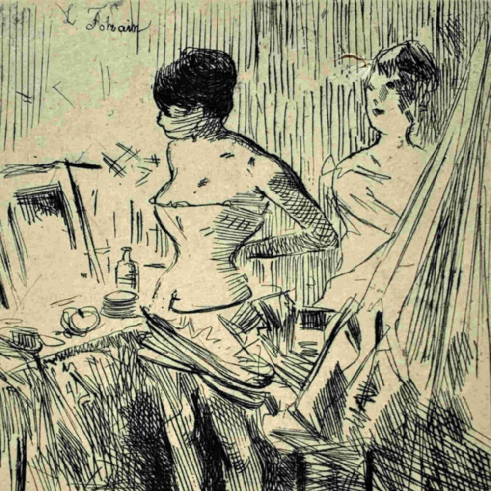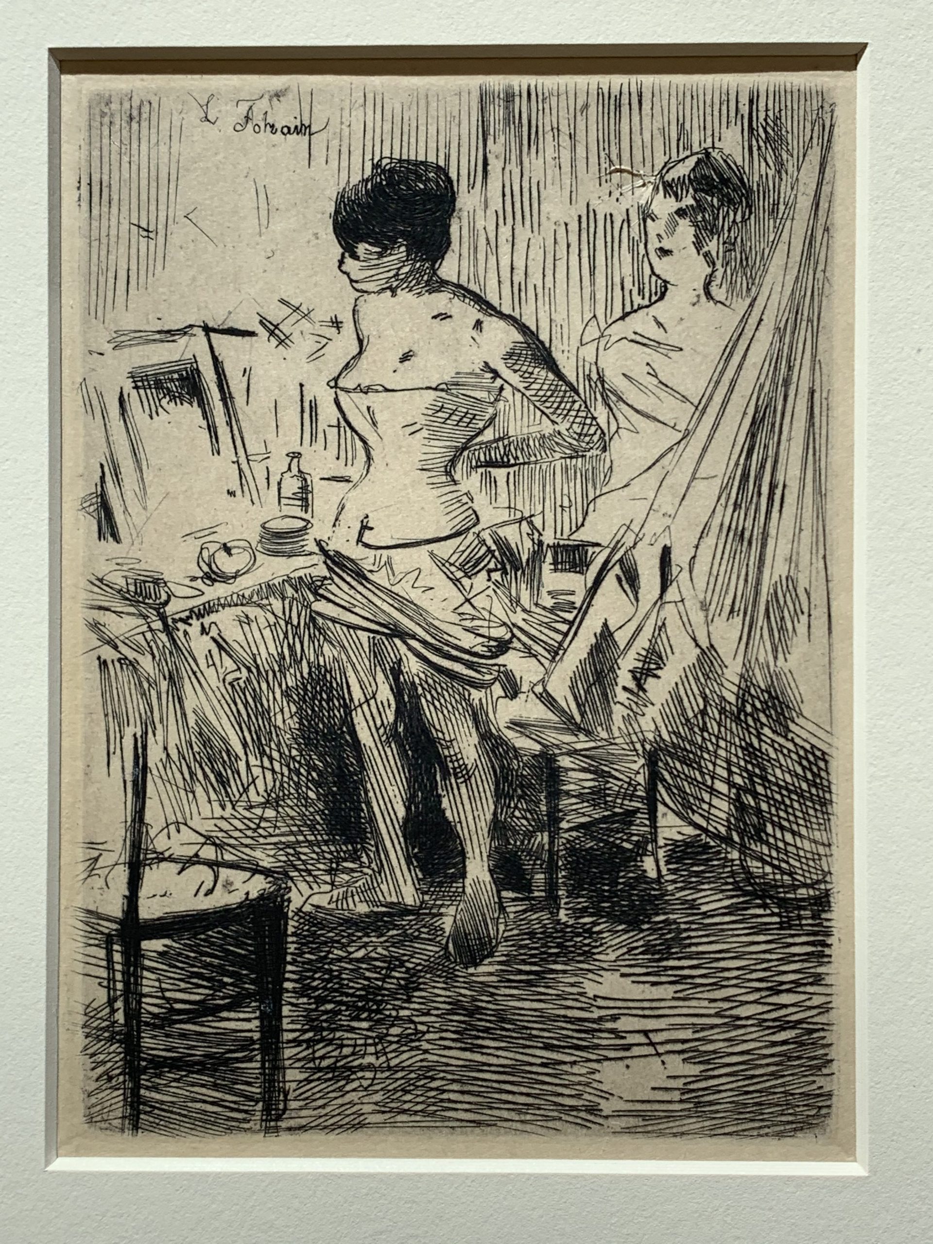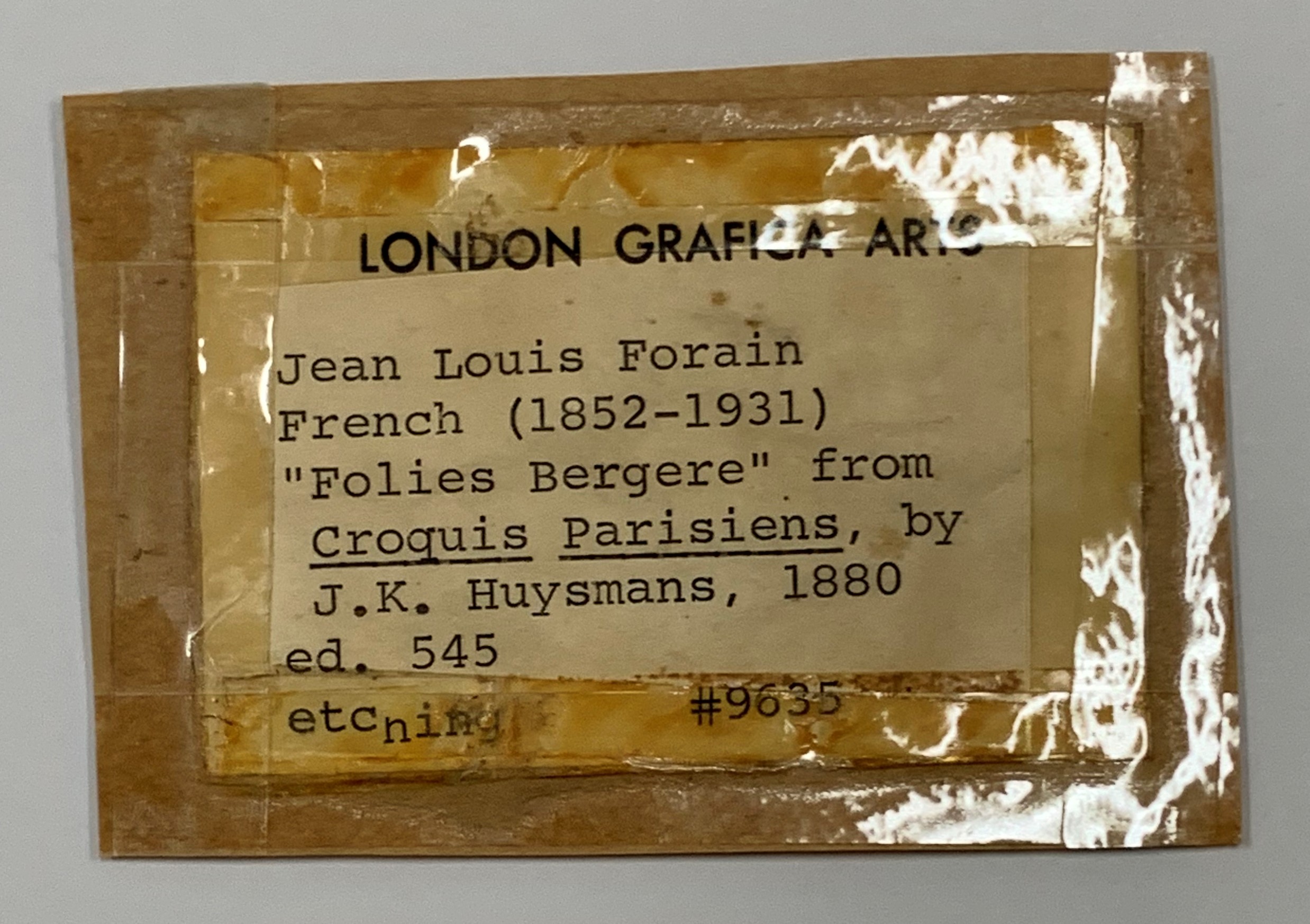 This work, by Jean Louis Forain, is entitled “Folies Bergere”.  It was used as an illustration for J.K. Huysmans’ Croquis Parisiens [Parisian Sketches].