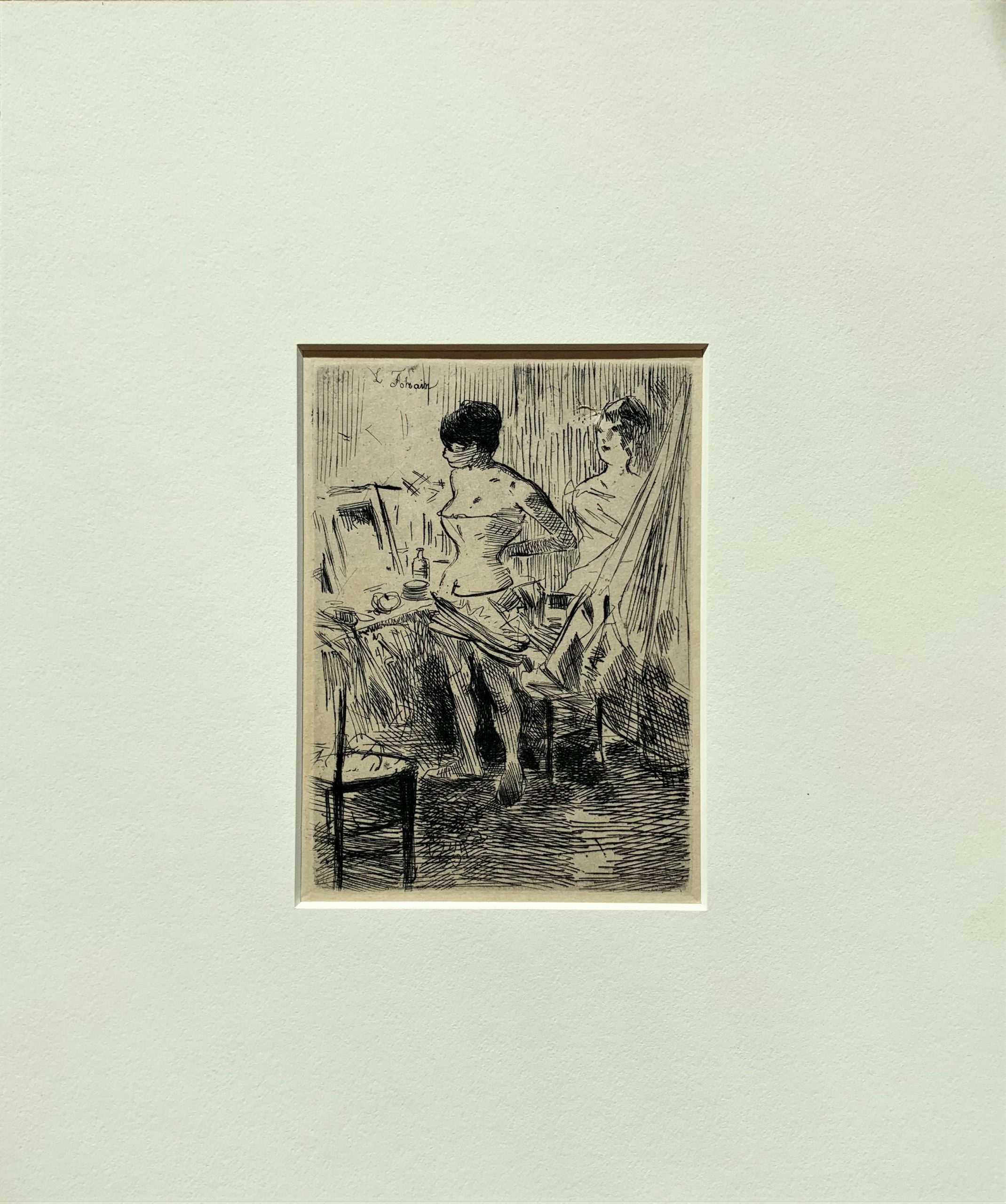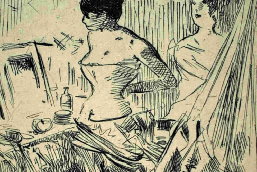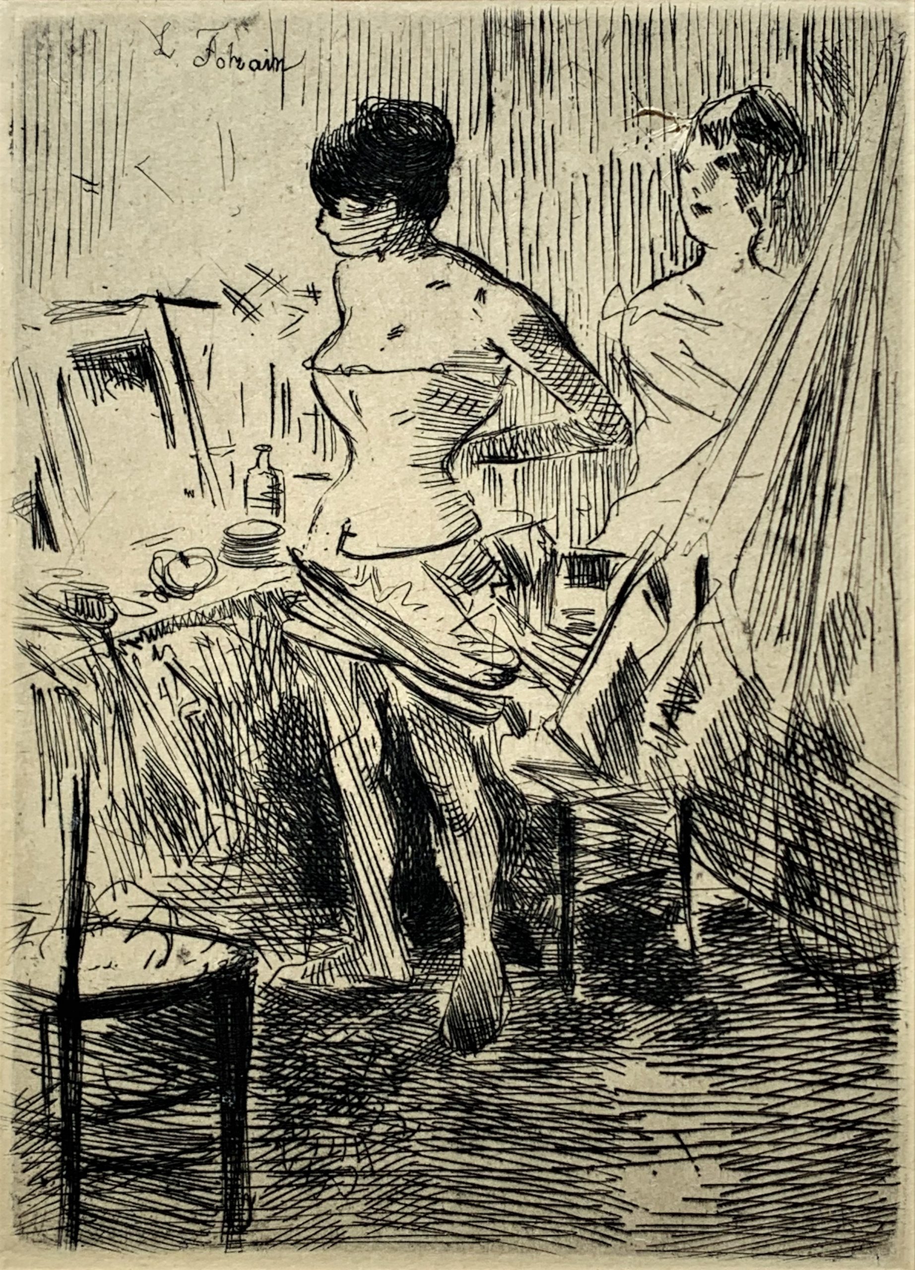 This work, by Jean Louis Forain, is entitled “Folies Bergere”.  It was used as an illustration for J.K. Huysmans’ Croquis Parisiens [Parisian Sketches].