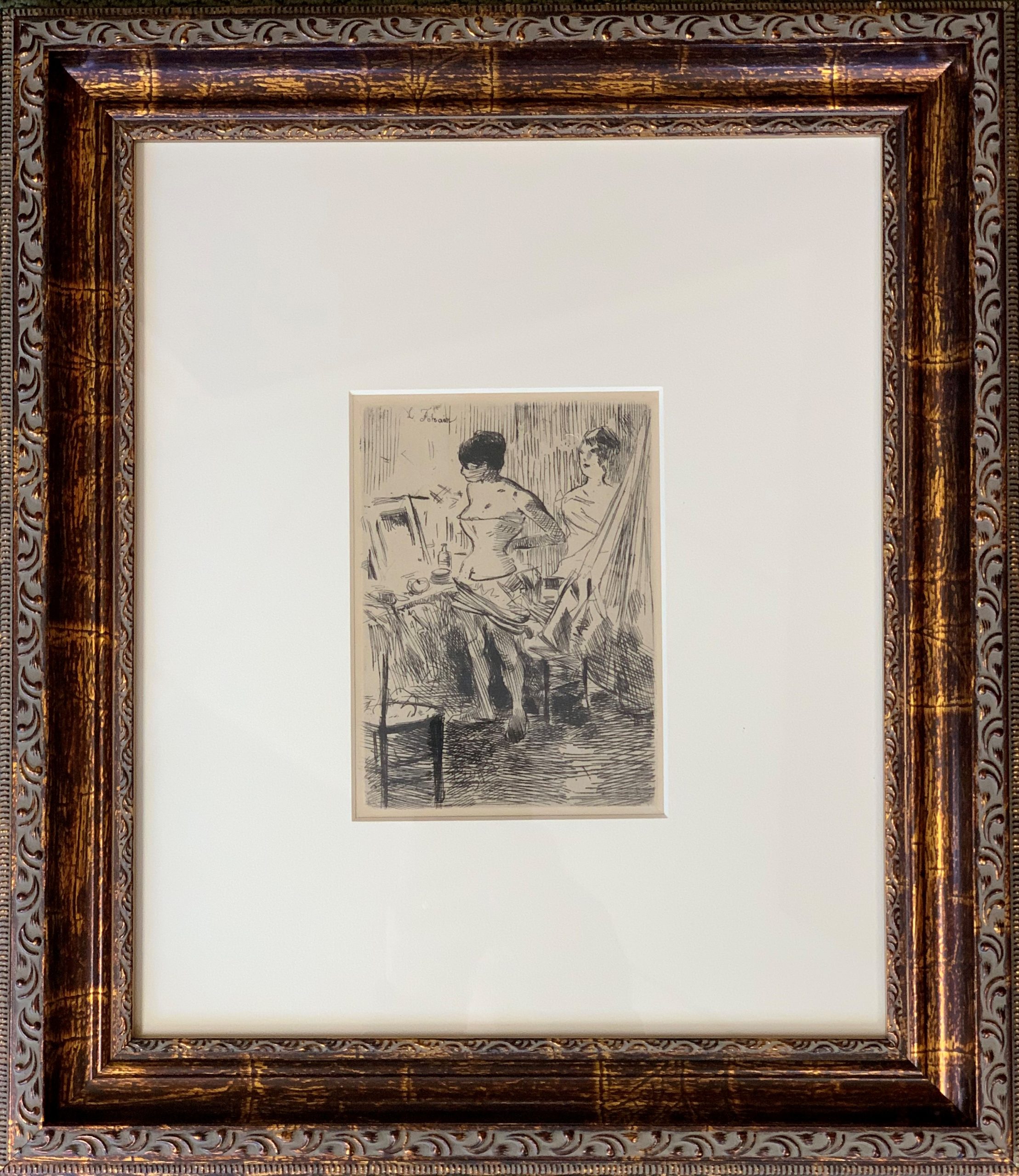 Burnt gold ornate frame with 99.9% UV-protective glass and acid-free matting. Label from prior framing affixed to verso.