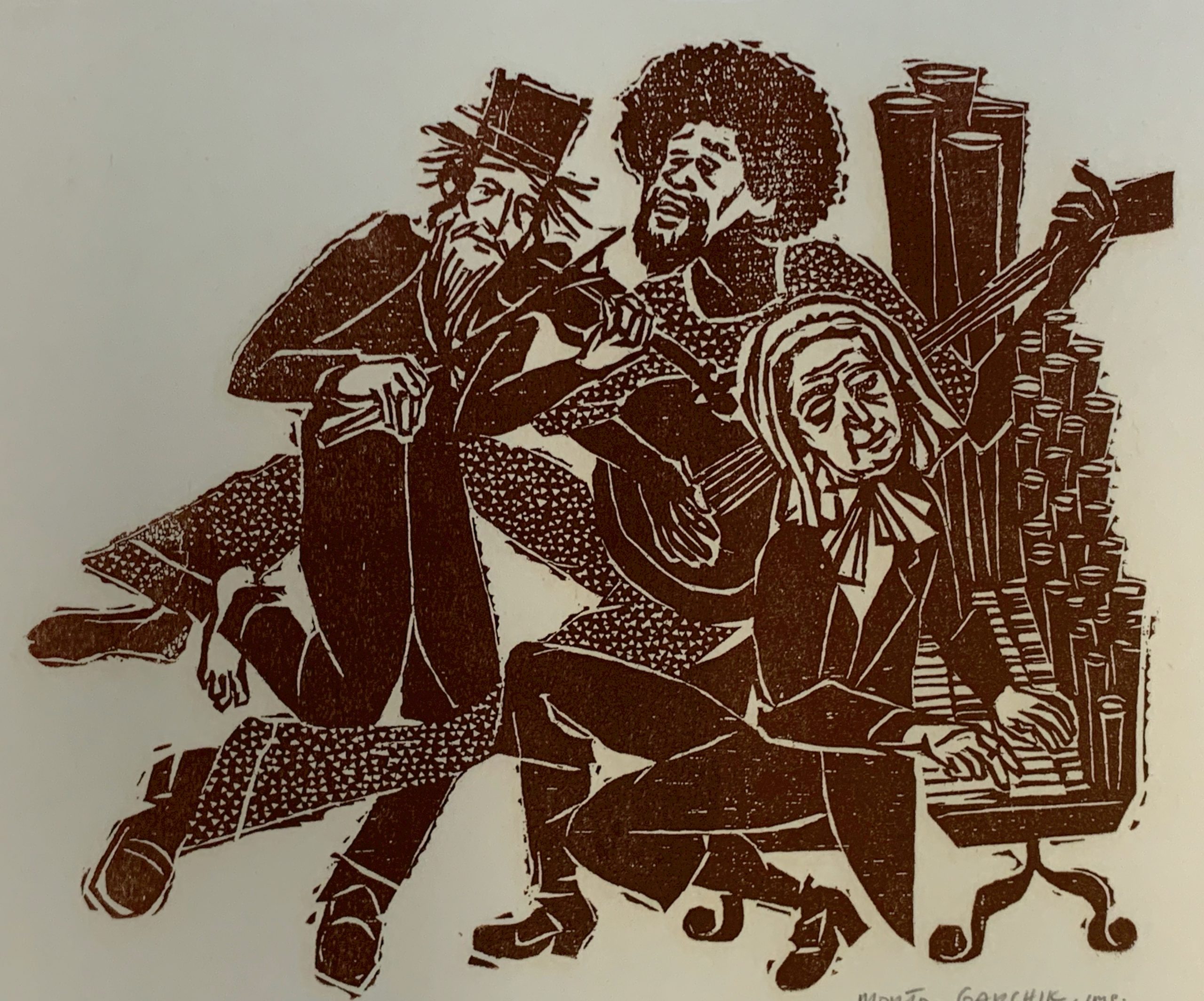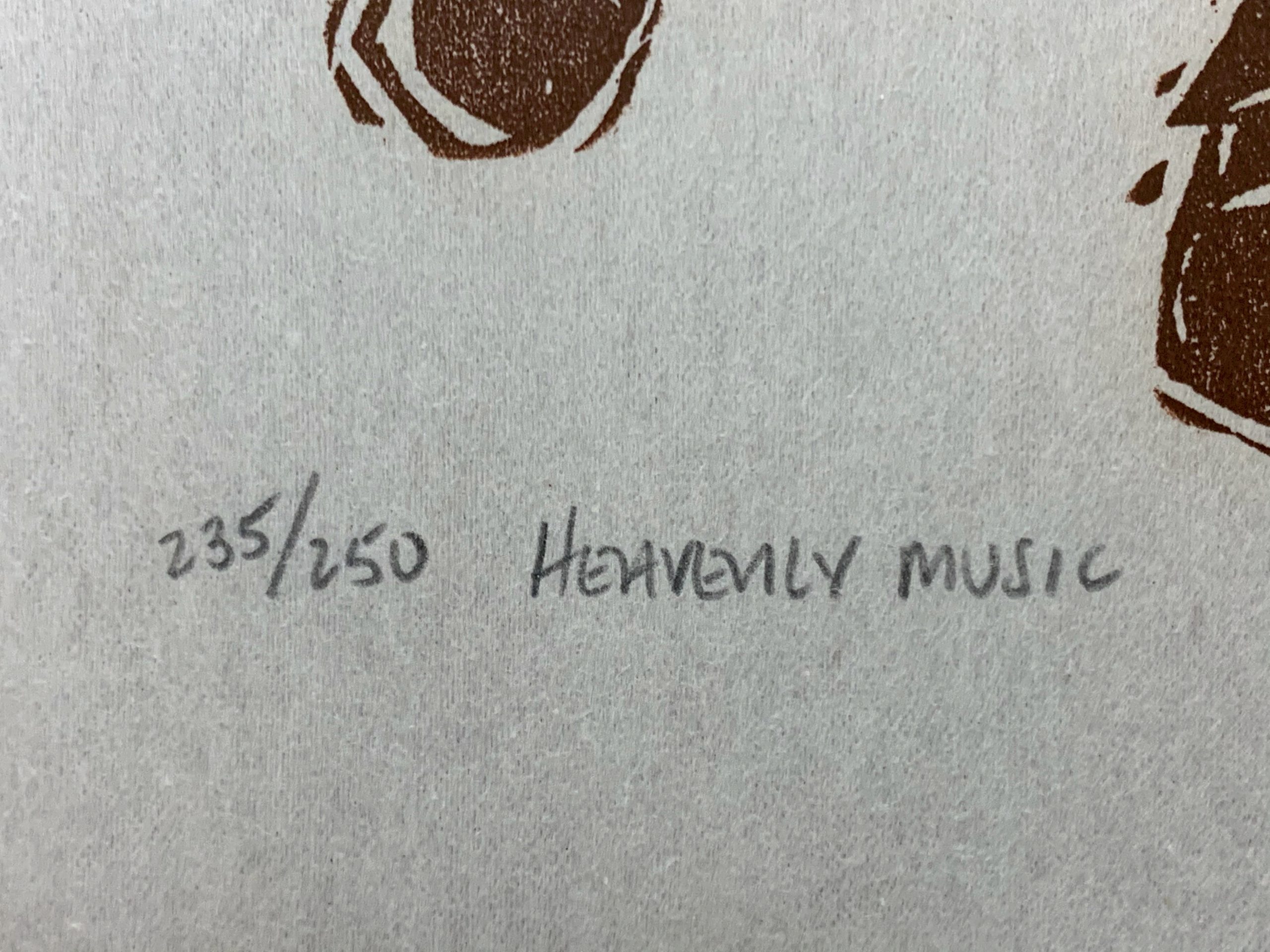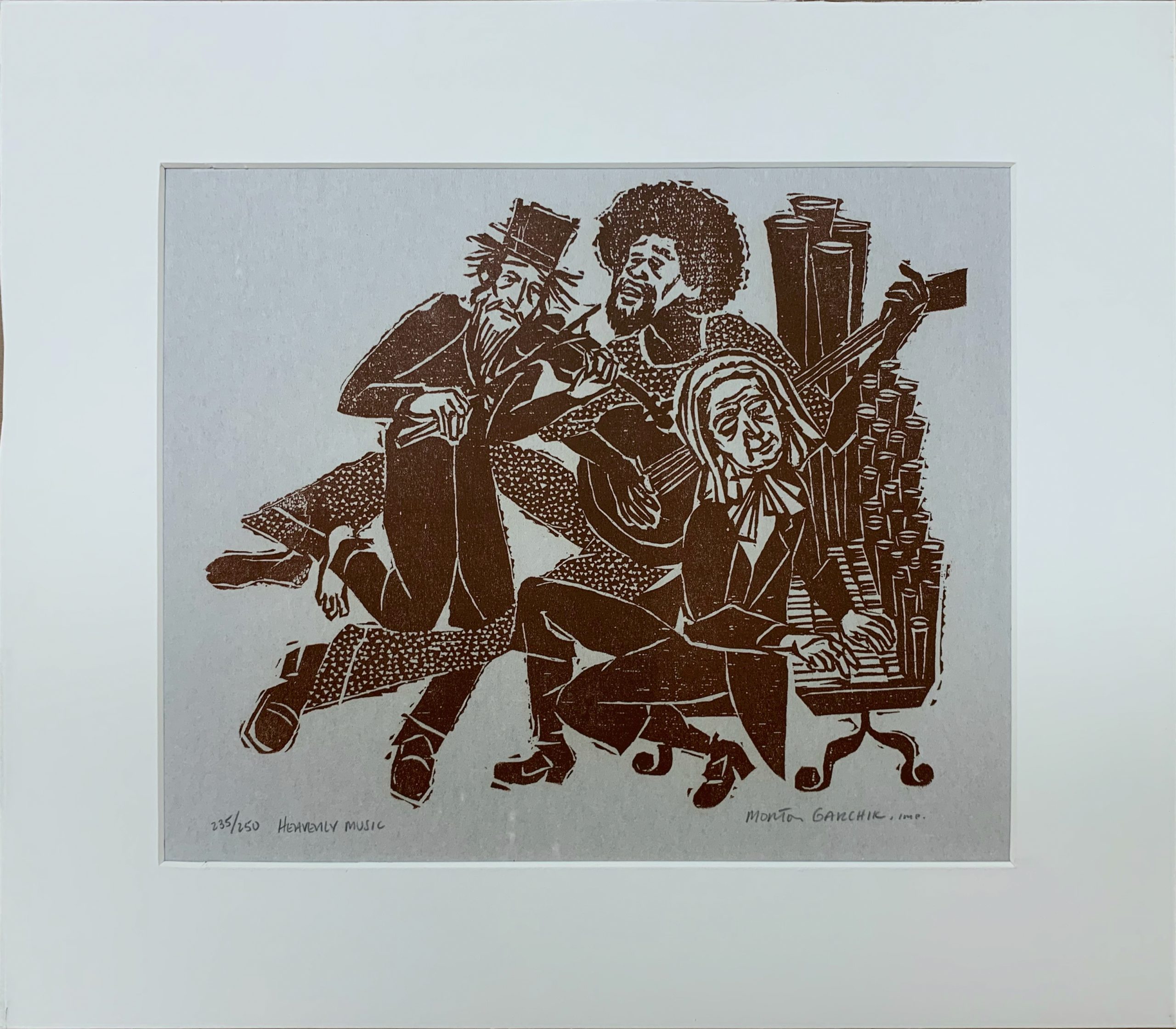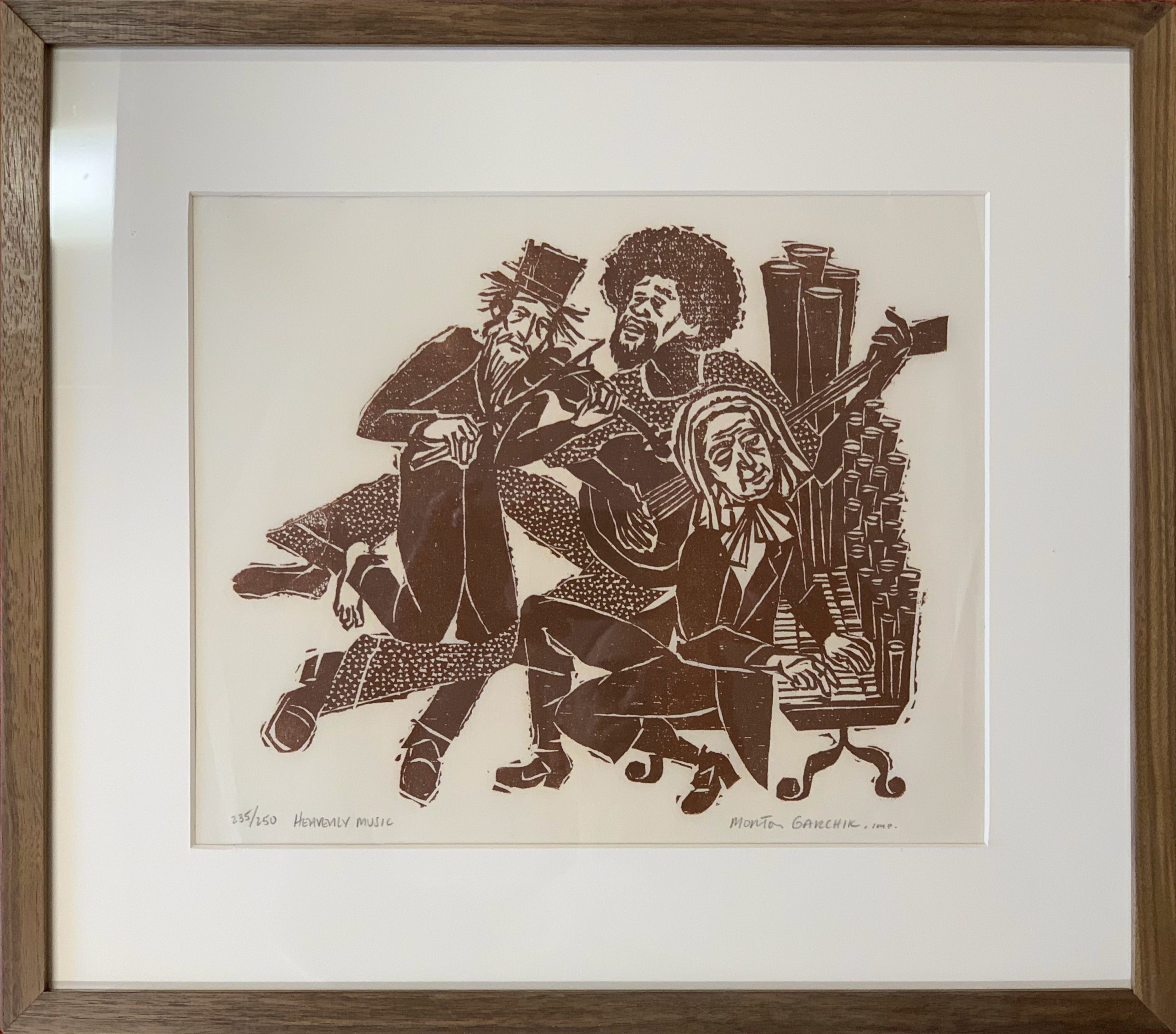 Morton Garchik’s Heavenly Music puts three unforgotten musicians in a band together!  Printed in a beautiful rich brown tinted by just the smallest bit of red, nicely echoed in the Walnut frame.