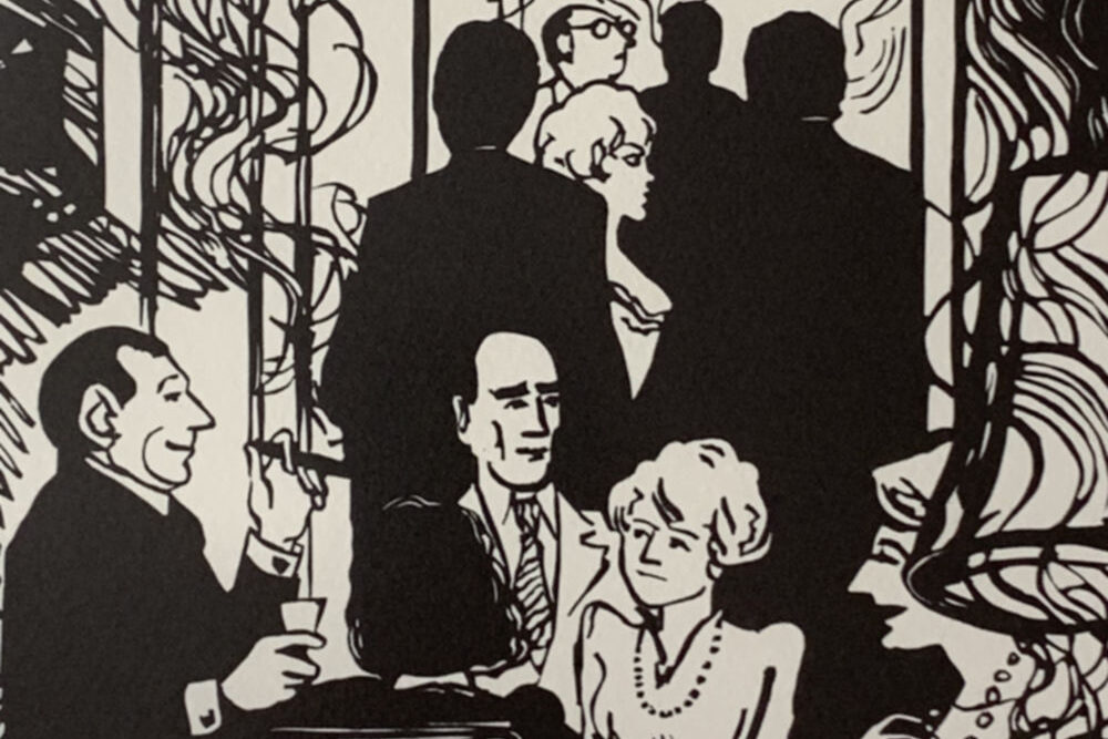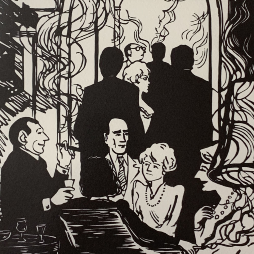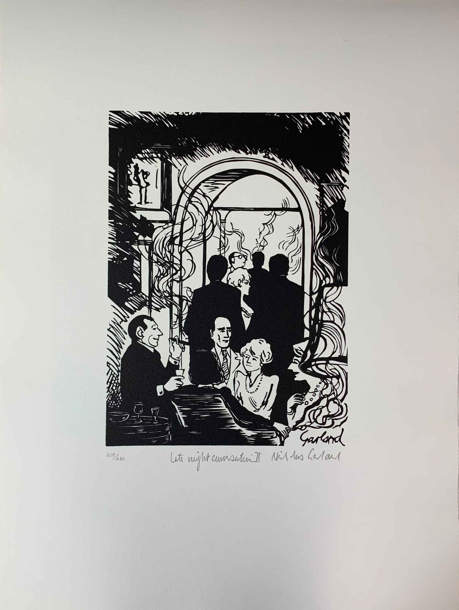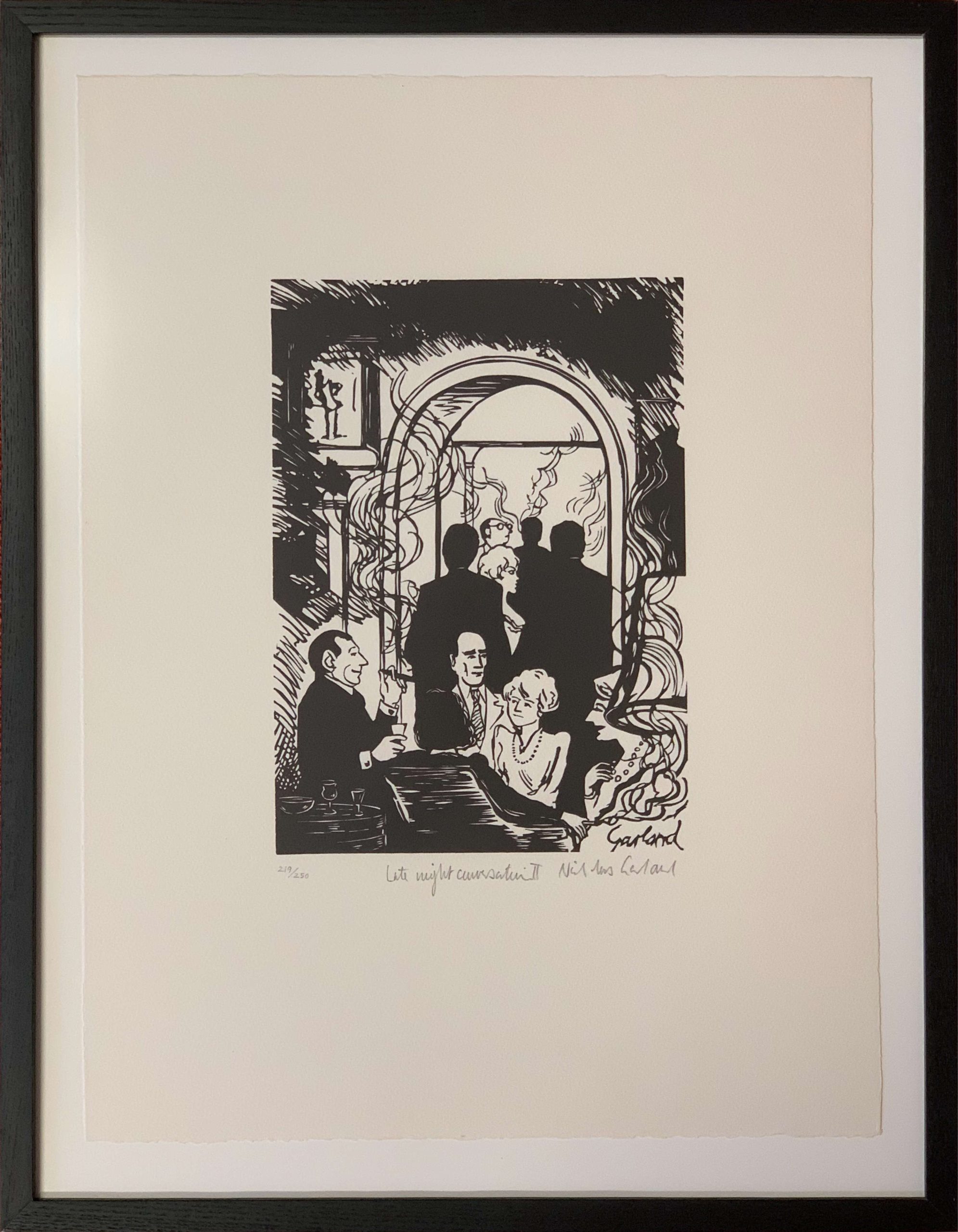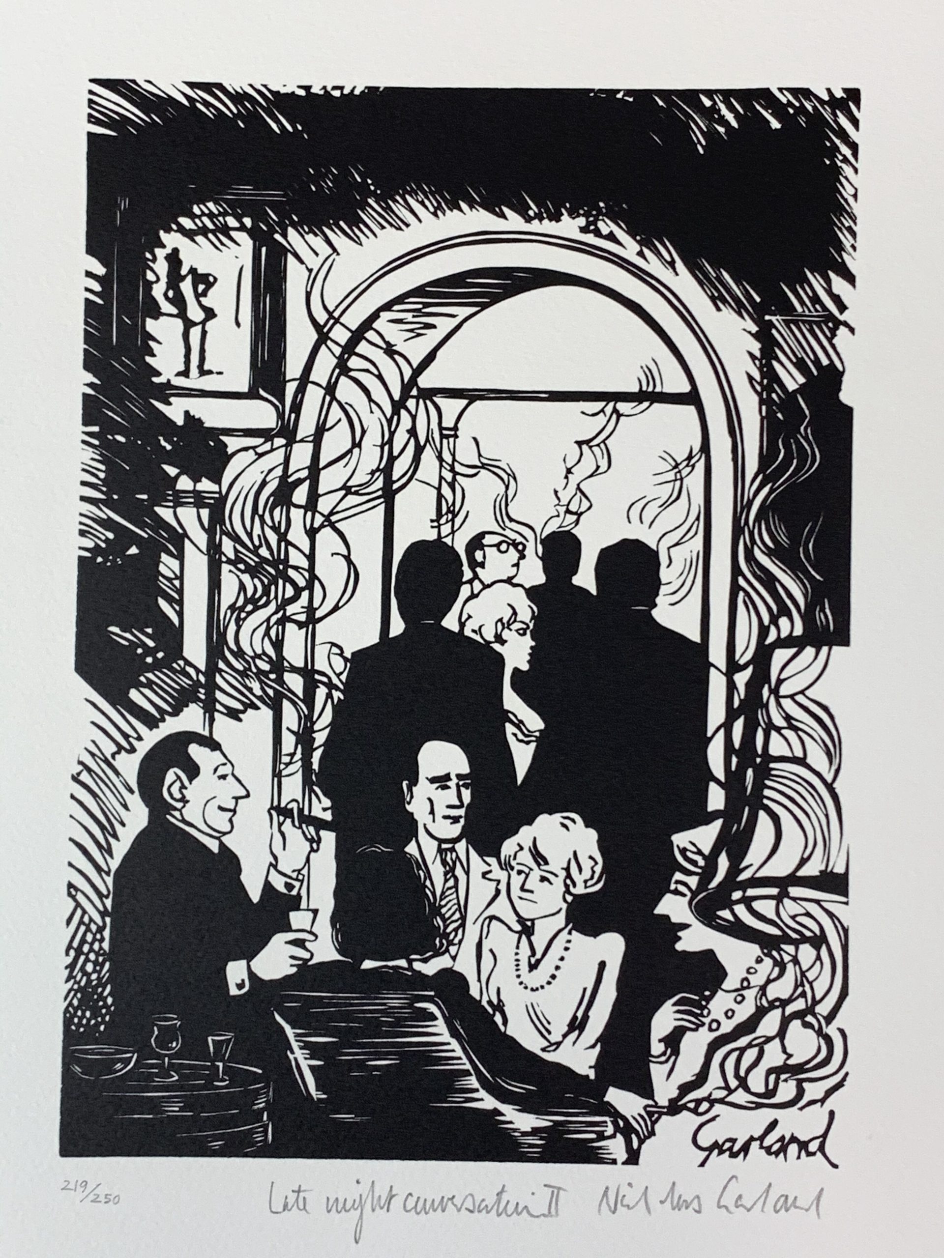 Anabel’s bar was widely considered to be the most elegant club in the London. This is a hyperbolic statement, but it is not hyperbole; it was actually thought of that way. The artist Nicholas Garland sat in the club and sketched the people he saw there. He later created the linocuts which were used to create the prints that formed the Anabel portfolio.
