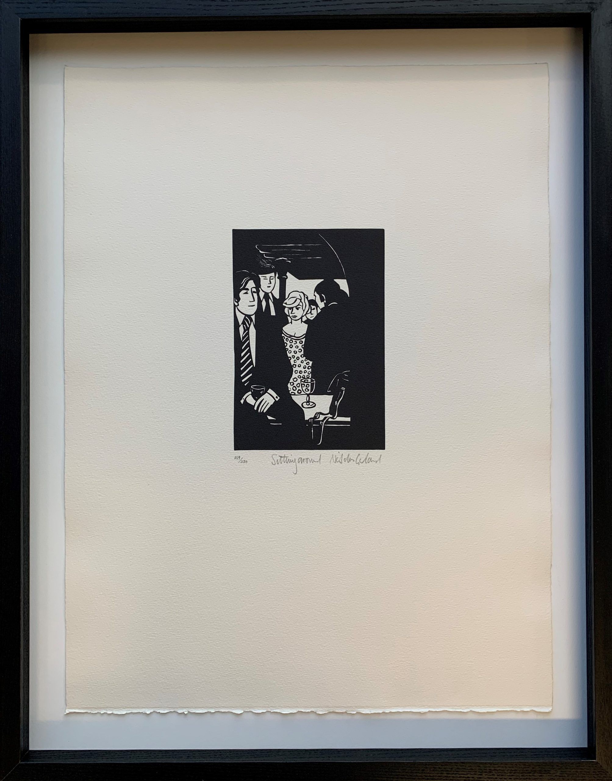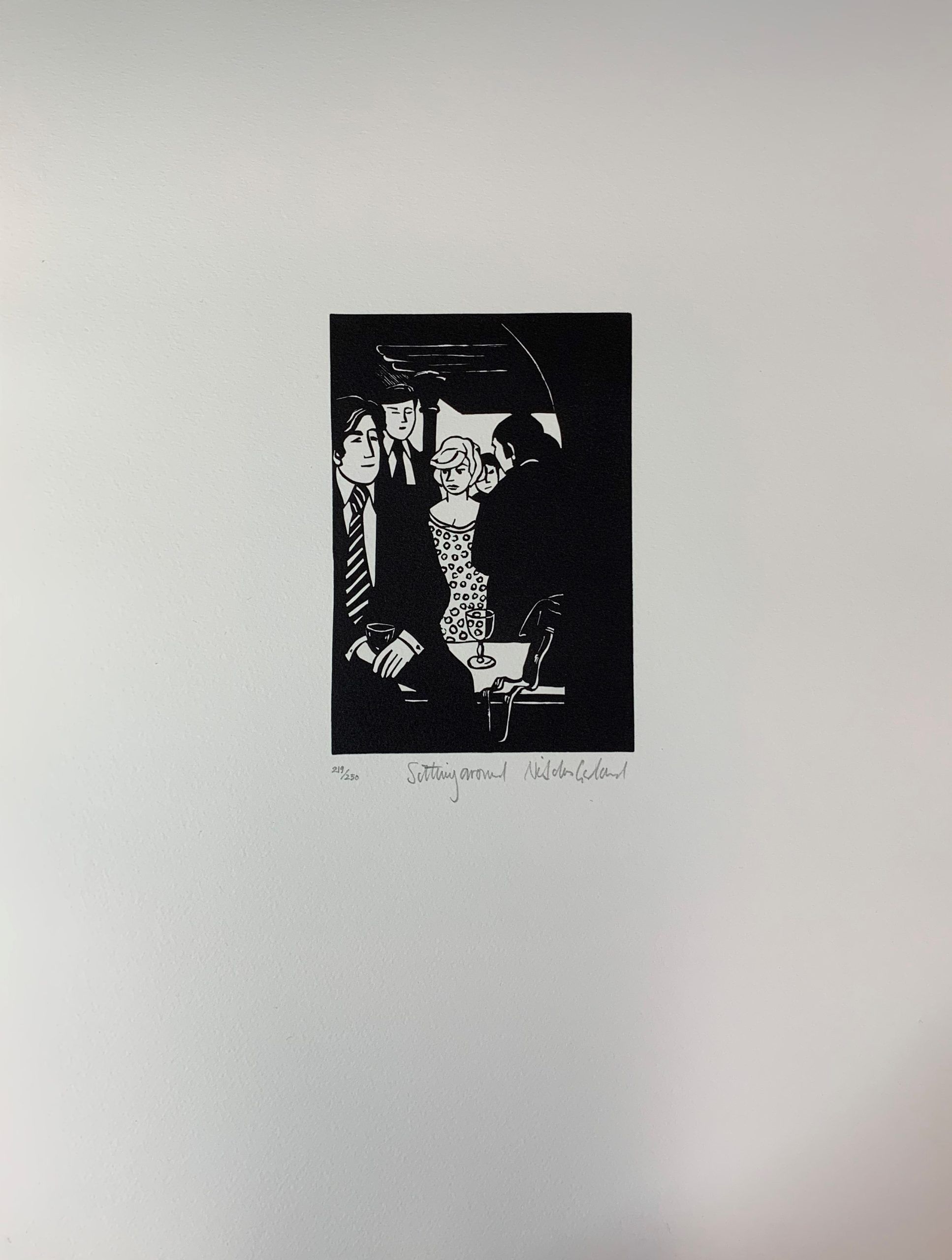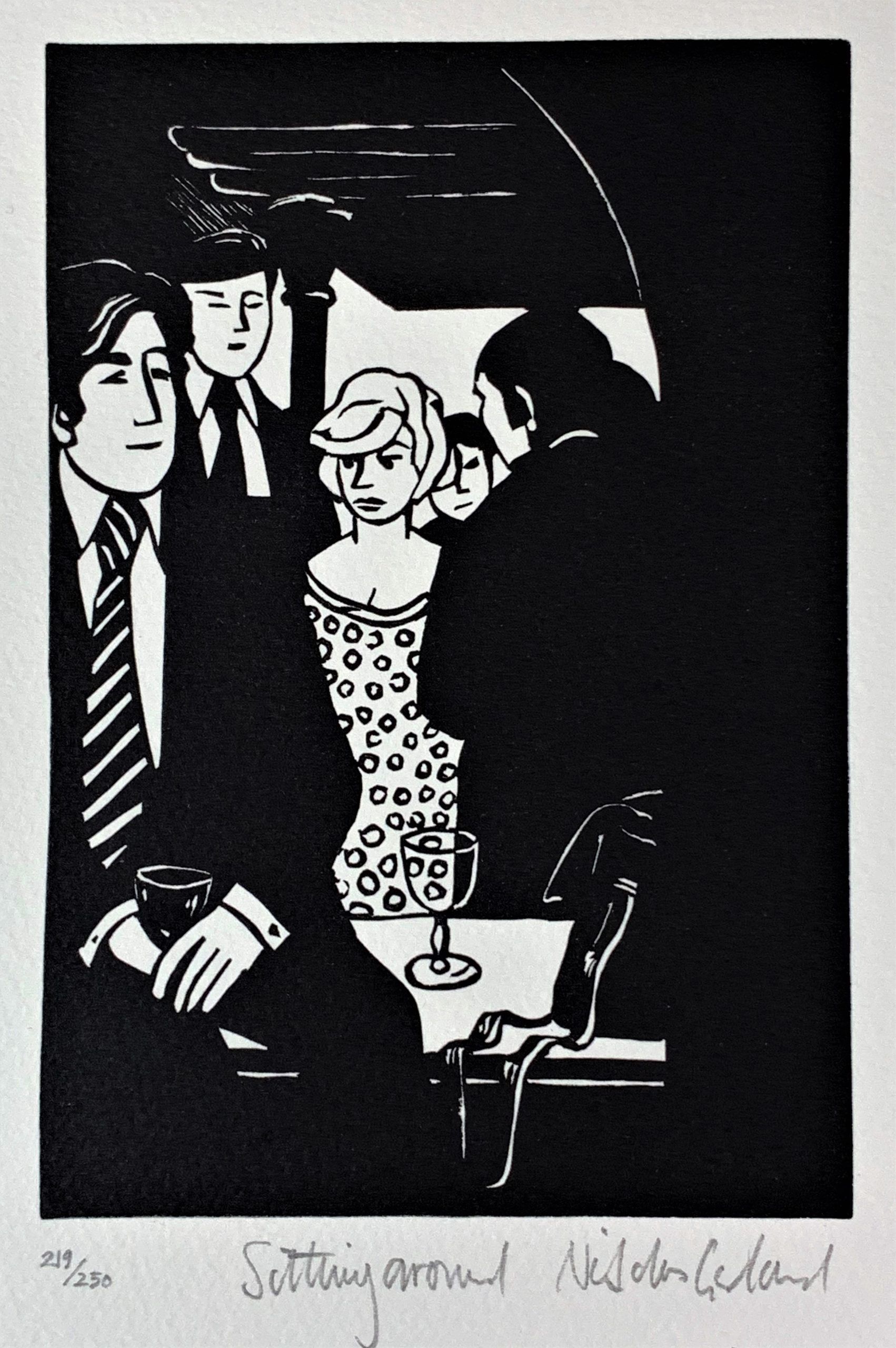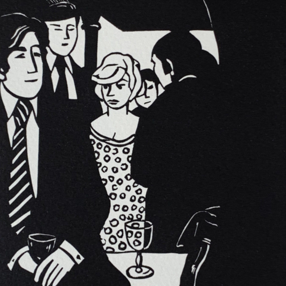 Anabel’s bar was widely considered to be the most elegant club in the London. This is a hyperbolic statement, but it is not hyperbole; it was actually thought of that way. The artist Nicholas Garland sat in the club and sketched the people he saw there. He later created the linocuts which were used to create the prints that formed the Anabel portfolio.
