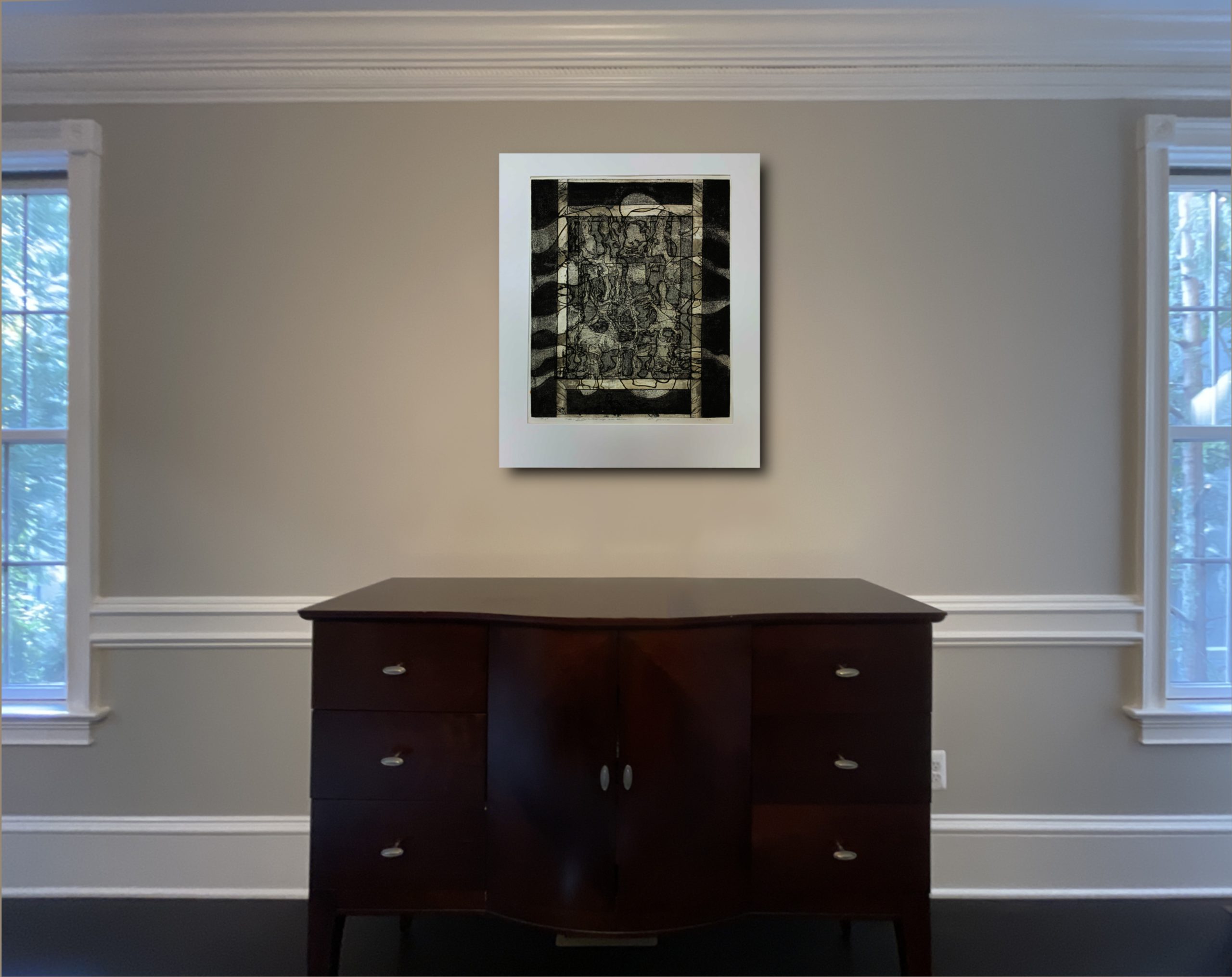Custom framed in black-painted Ash and matted behind UV-Filtering Plexiglass.  All conservation materials.