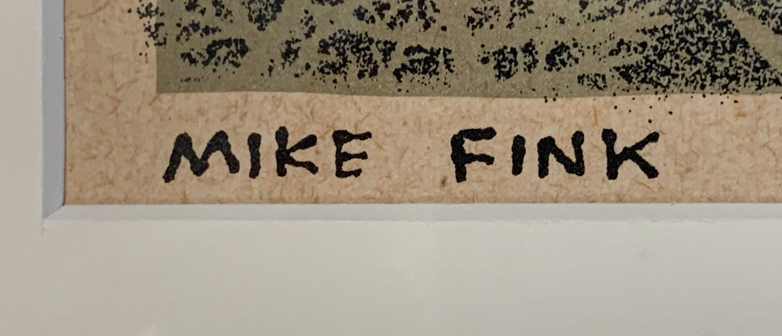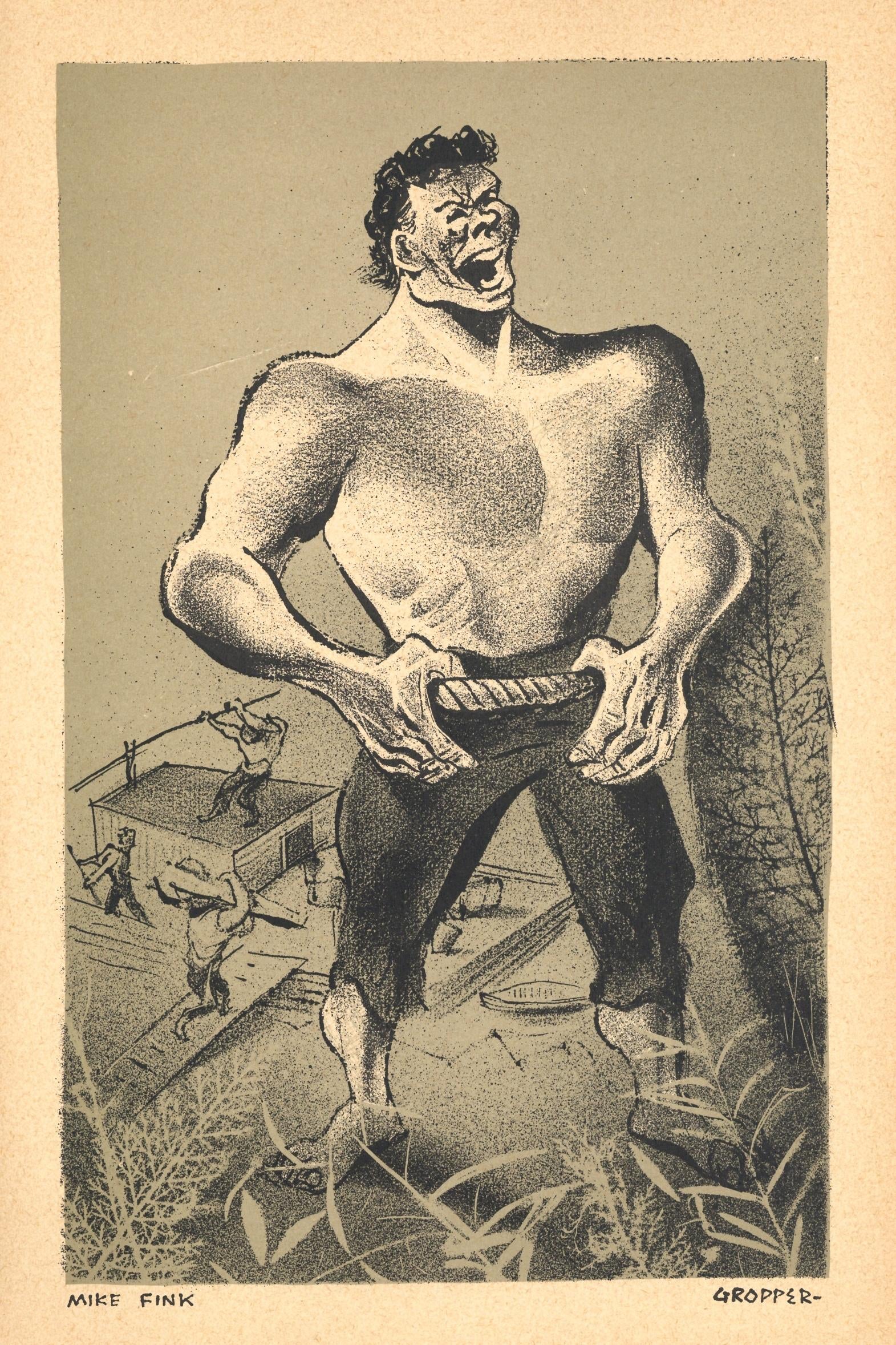 Miche Phinck—Mike Fink—was a semi-legendary brawler and river boatman  of the late 18th and early 19th centuries who exemplified the tough and hard-drinking men who ran keelboats up and down the Ohio and Mississippi Rivers.  William Gropper portrayed Fink in his American Folk Heroes Portfolio as a huge, tough, confident, and raw workingman.  Fink’s toughness made him, in earlier days in our nation, an exemplar of an American man, though by the late 19th century he came to be seen as a boor and a bully.  Interestingly, in the early 20th century Henry Shoemaker, a Pennsylvania folklorist, tried to revive Fink’s reputation, and while Shoemaker’s efforts had little success Gropper nevertheless chose Fink as one of his models of American Folk Heroes.