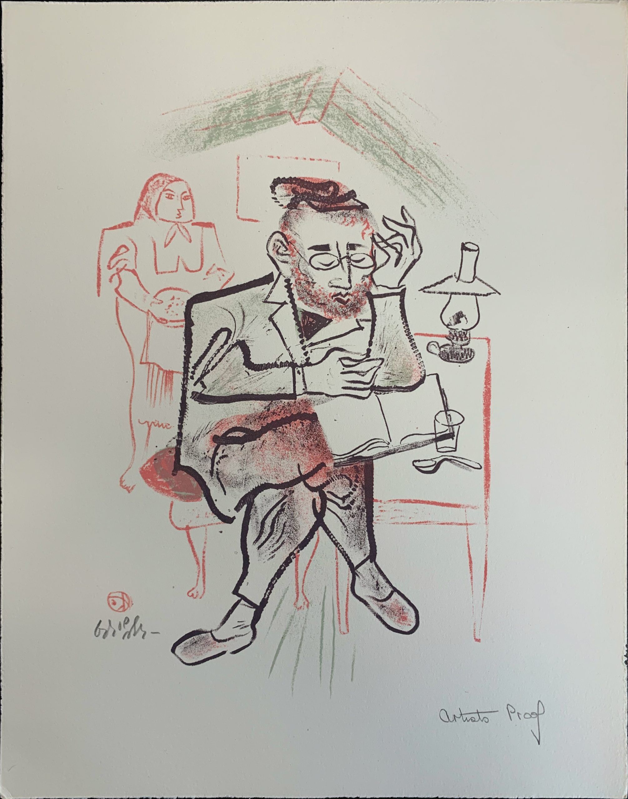 Harkening back to his Jewish roots, William Gropper published in 1970 a series of twenty-four color lithographs on Jewish village life called The Shtetl. This series was purchased with the Peter Graham Fund for Radicalism in Literature and Art. Gropper had these remarks on his artwork: