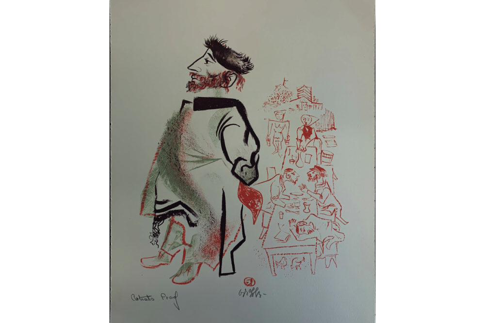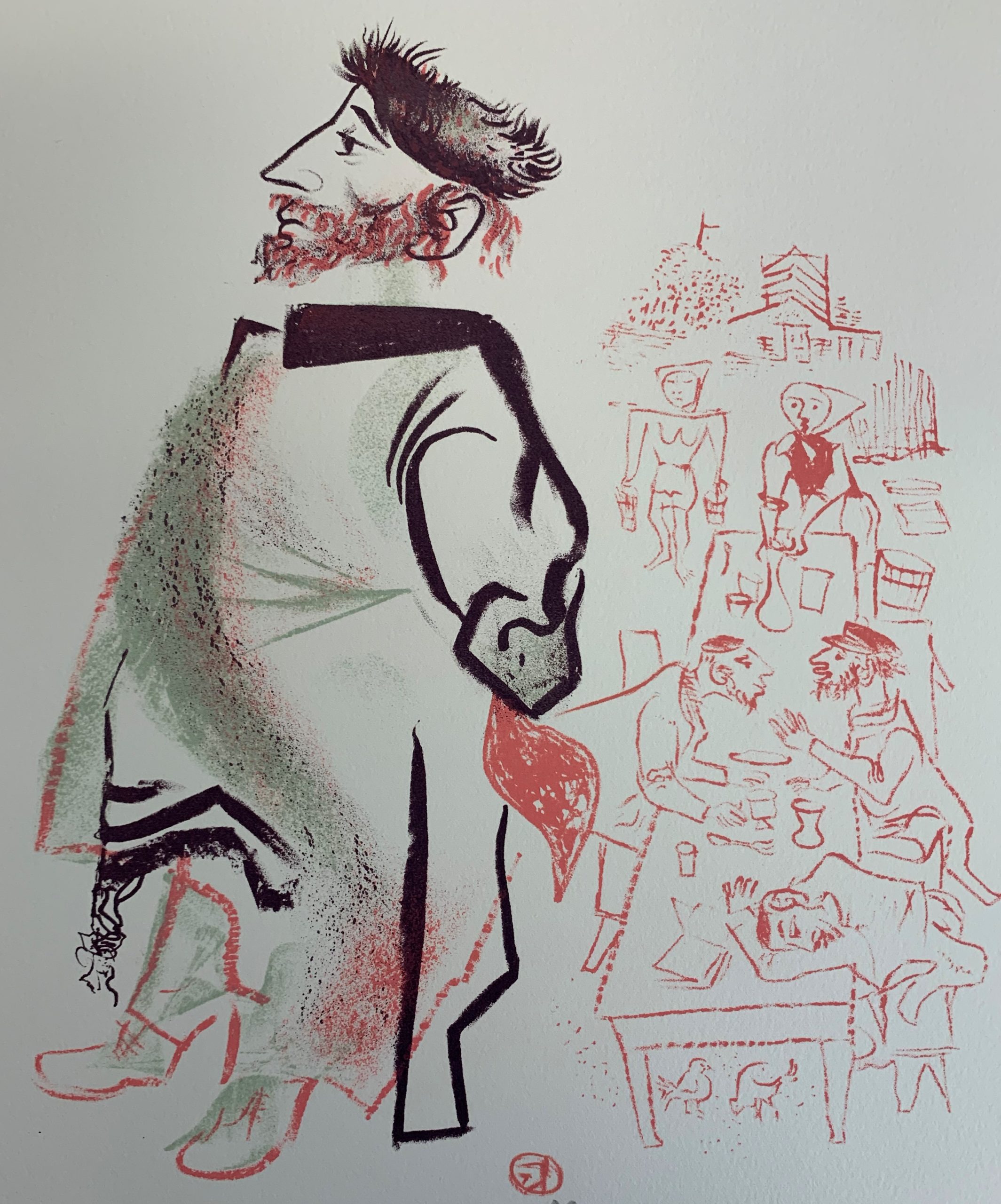 Harkening back to his Jewish roots, William Gropper published in 1970 a series of twenty-four color lithographs on Jewish village life called The Shtetl. This series was purchased with the Peter Graham Fund for Radicalism in Literature and Art. Gropper had these remarks on his artwork: