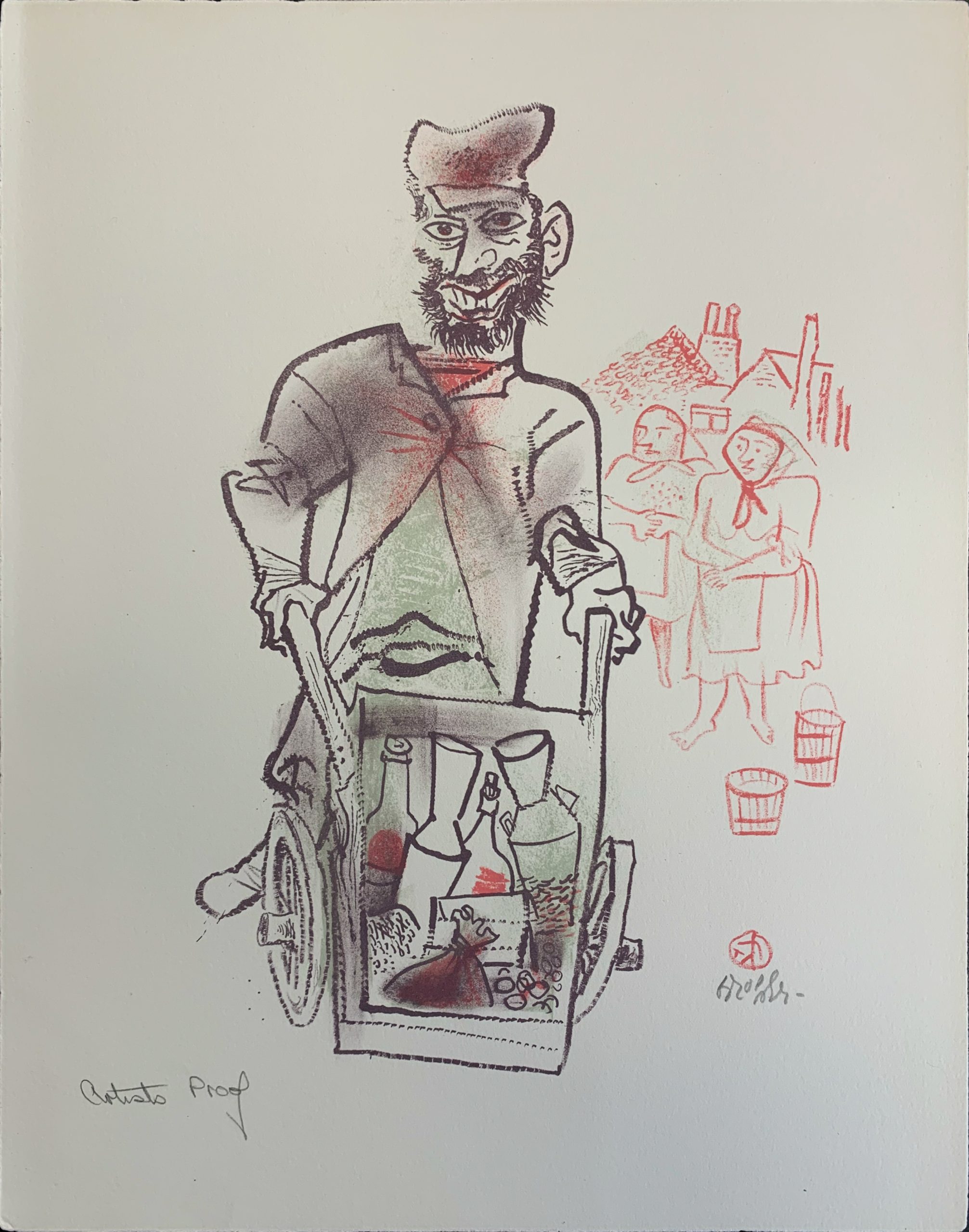 Harkening back to his Jewish roots, William Gropper published in 1970 a series of twenty-four color lithographs on Jewish village life called The Shtetl. This series was purchased with the Peter Graham Fund for Radicalism in Literature and Art. Gropper had these remarks on his artwork: