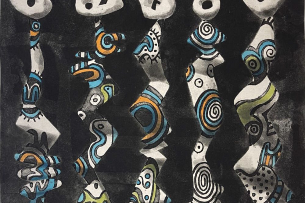 Intaglio print from a color etching and aquatint with hand coloring.