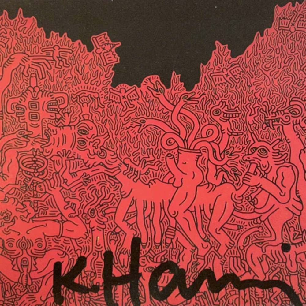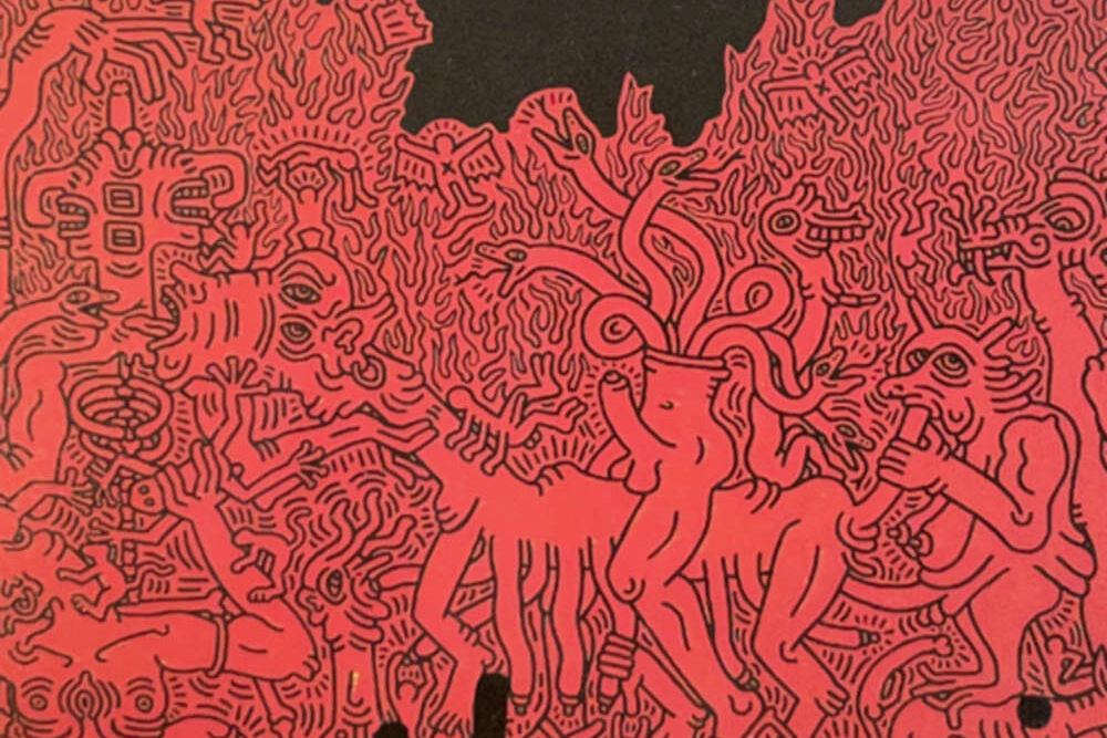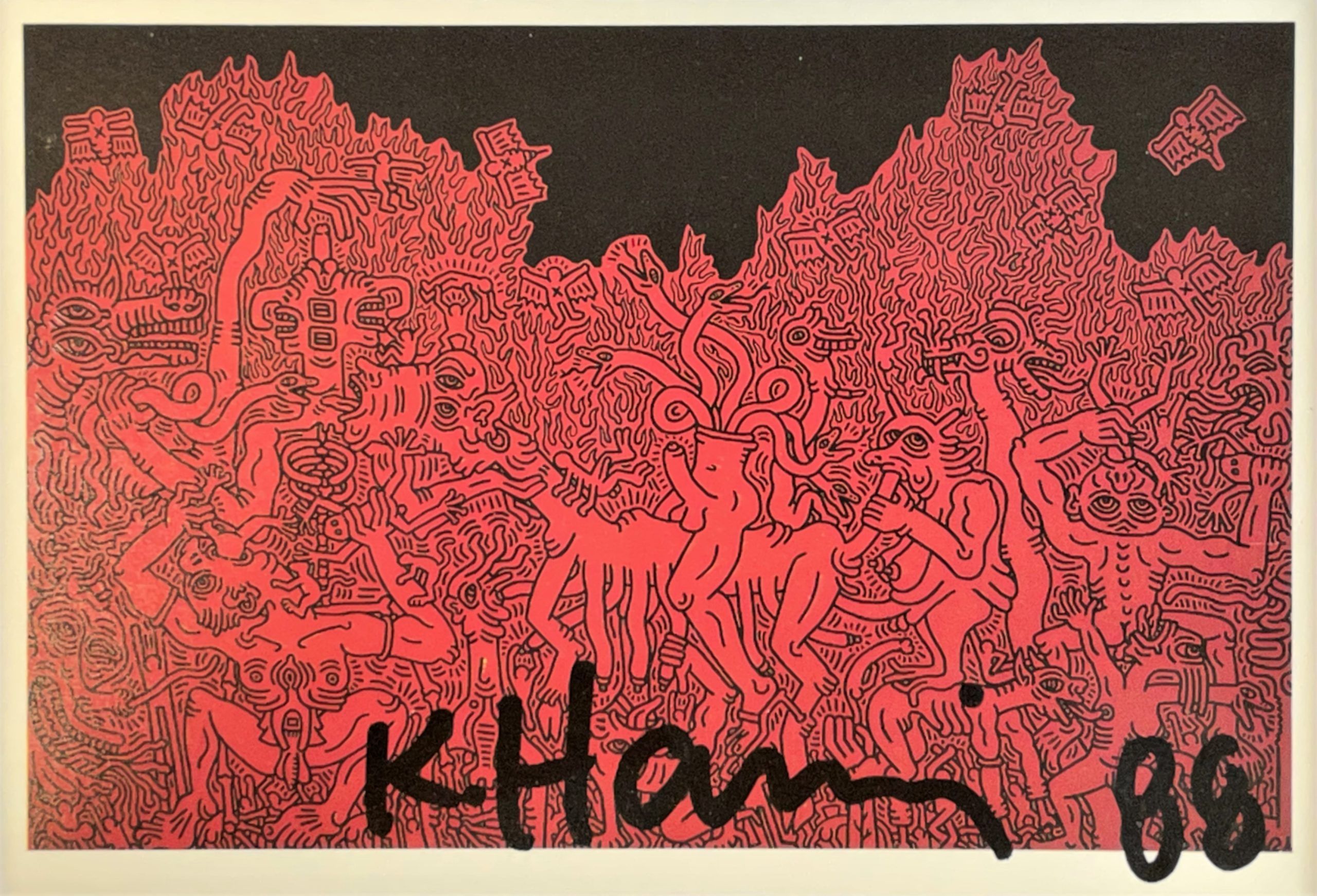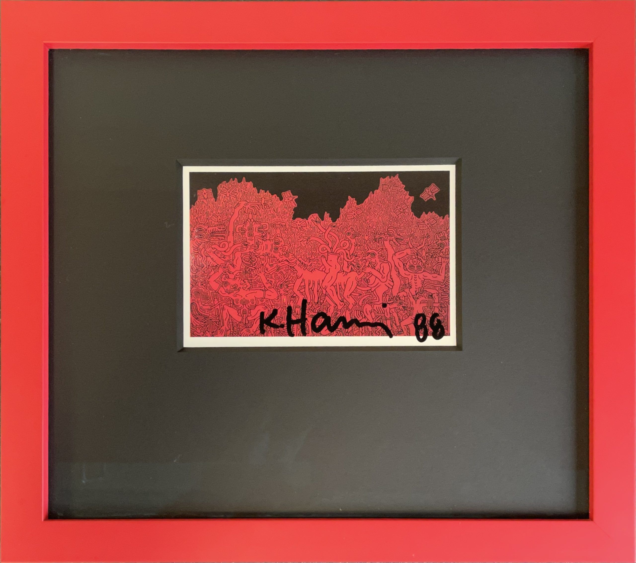 A particularly finely-printed postcard showing an intricate interweaving of iconic Keith Haring images.