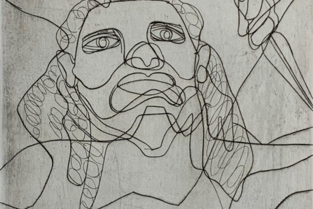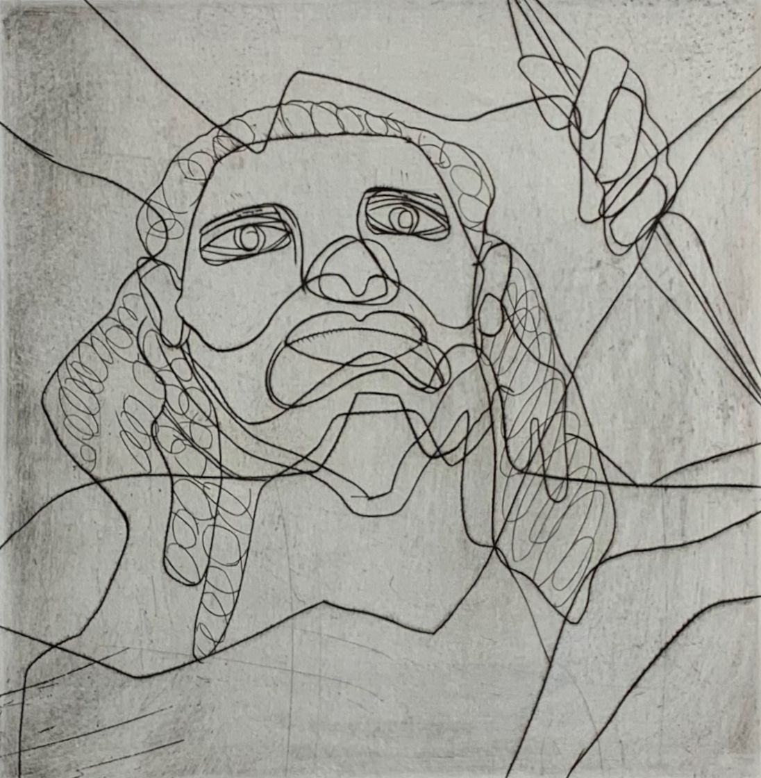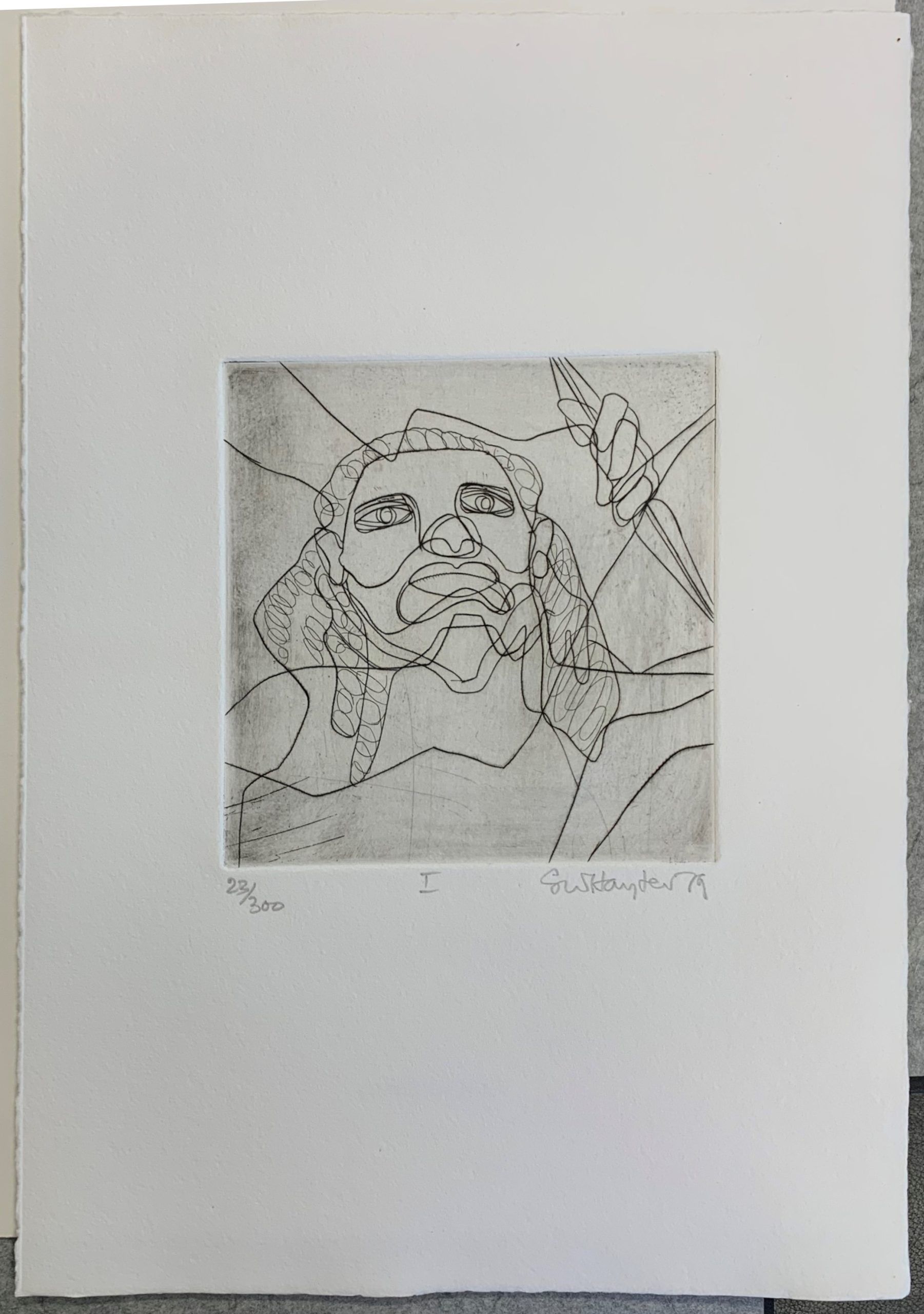 Head of Zeus, an engraving, the first of the nine intaglios by Stanley William Hayter that illustrate the book-length poem Death of Hektor by Irish poet Brian Coffey.