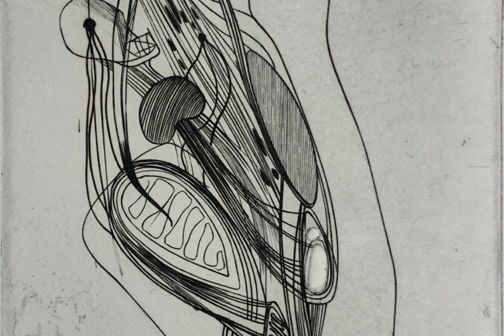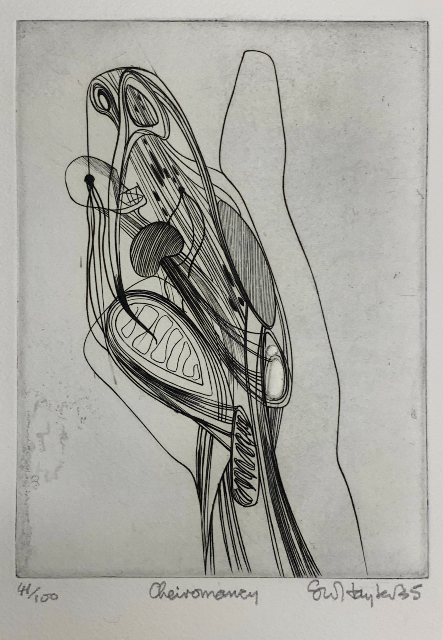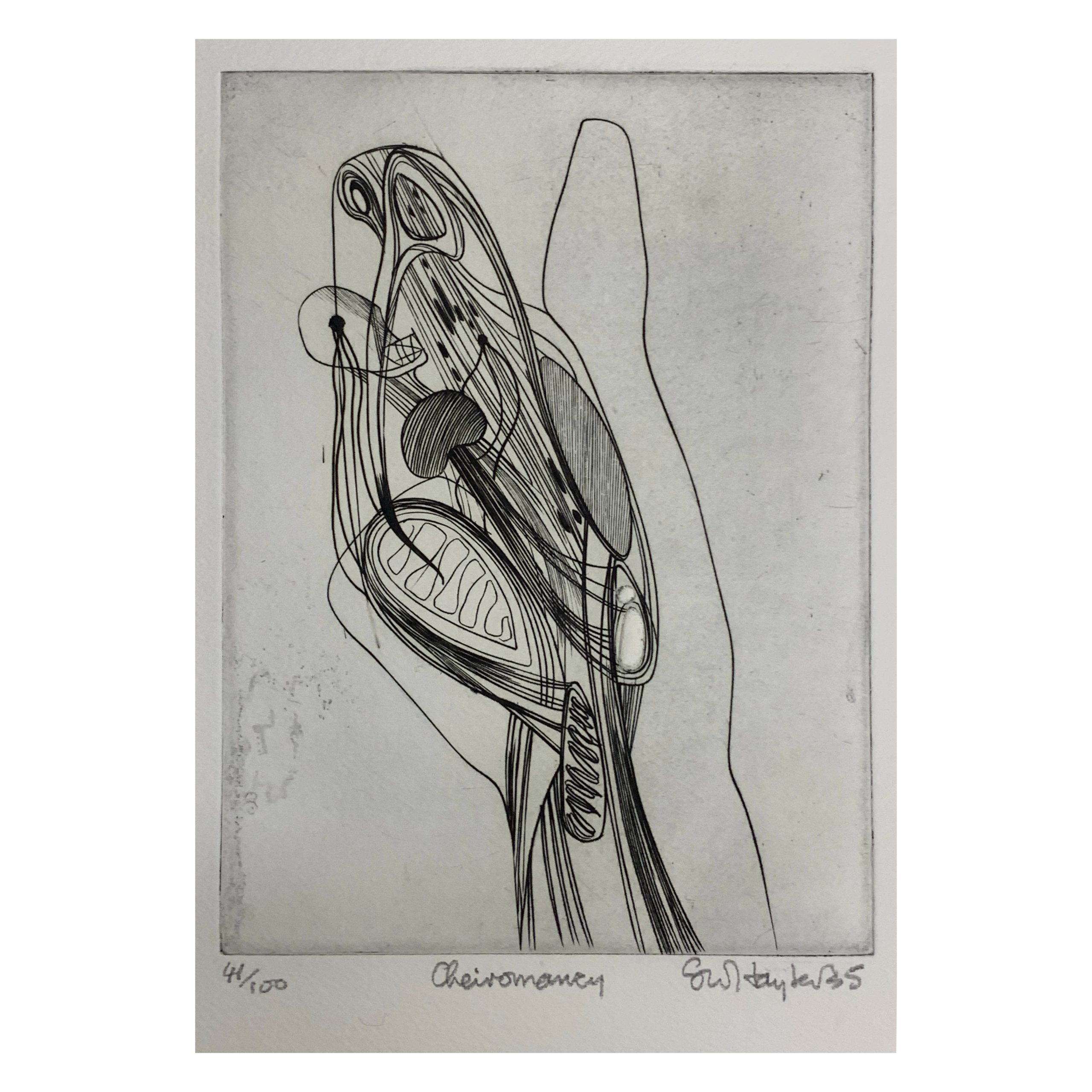 This work by Stanley William Hayter—undisputedly the most influential person in modern Western printmaking—is an Intaglio print made from engraving and scorper on a copper plate.  It has an alternate title of “Chiromancy”.