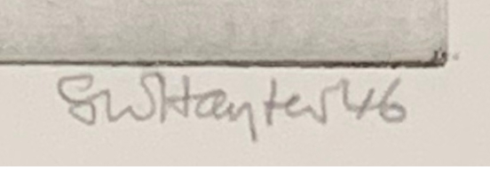 This impression was made in the summer of 1973 at Atelier 17 by Hayter, with assistance from Hector Saunier and Rigmor Poenaru, for the Nine Engravings portfolio published in 1974 by Association American Artists, New York. This engraving was previously printed in 1946 on various papers in an edition limited to 30 impressions. The plate was cancelled after the 1973 edition by engraving a signature which prints in reverse.