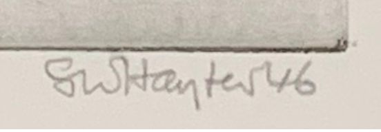 This impression was made in the summer of 1973 at Atelier 17 by Hayter, with assistance from Hector Saunier and Rigmor Poenaru, for the Nine Engravings portfolio published in 1974 by Association American Artists, New York.  This engraving was previously printed in 1946 on various papers in an edition limited to 30 impressions.  The plate was cancelled after the 1973 edition by engraving a signature which prints in reverse.