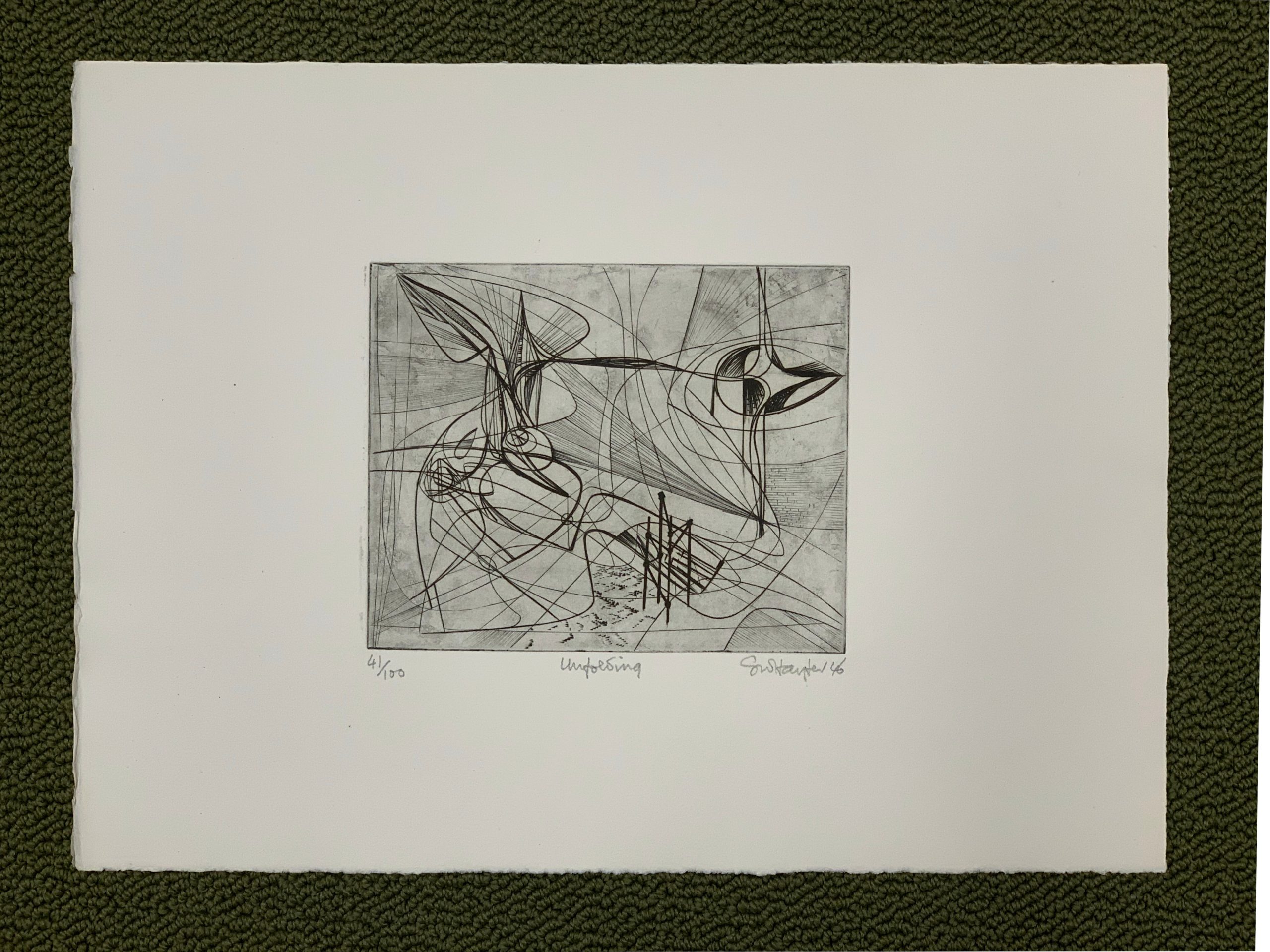 This work by Stanley William Hayter—undisputedly the most influential person in modern printmaking—is an Intaglio print made from engraving on a copper plate.  The plate was begun in October 1945 and completed in March 1946.
