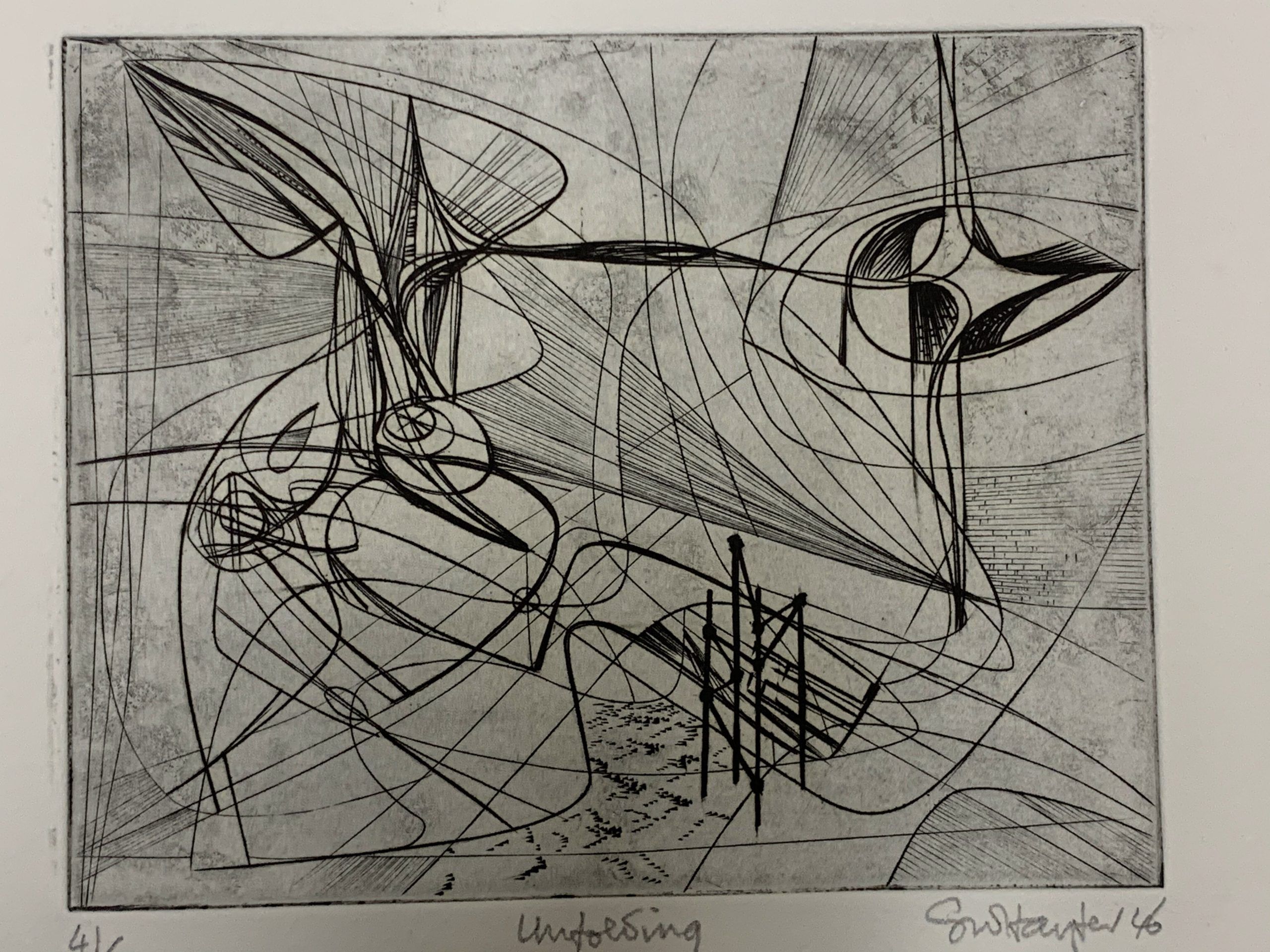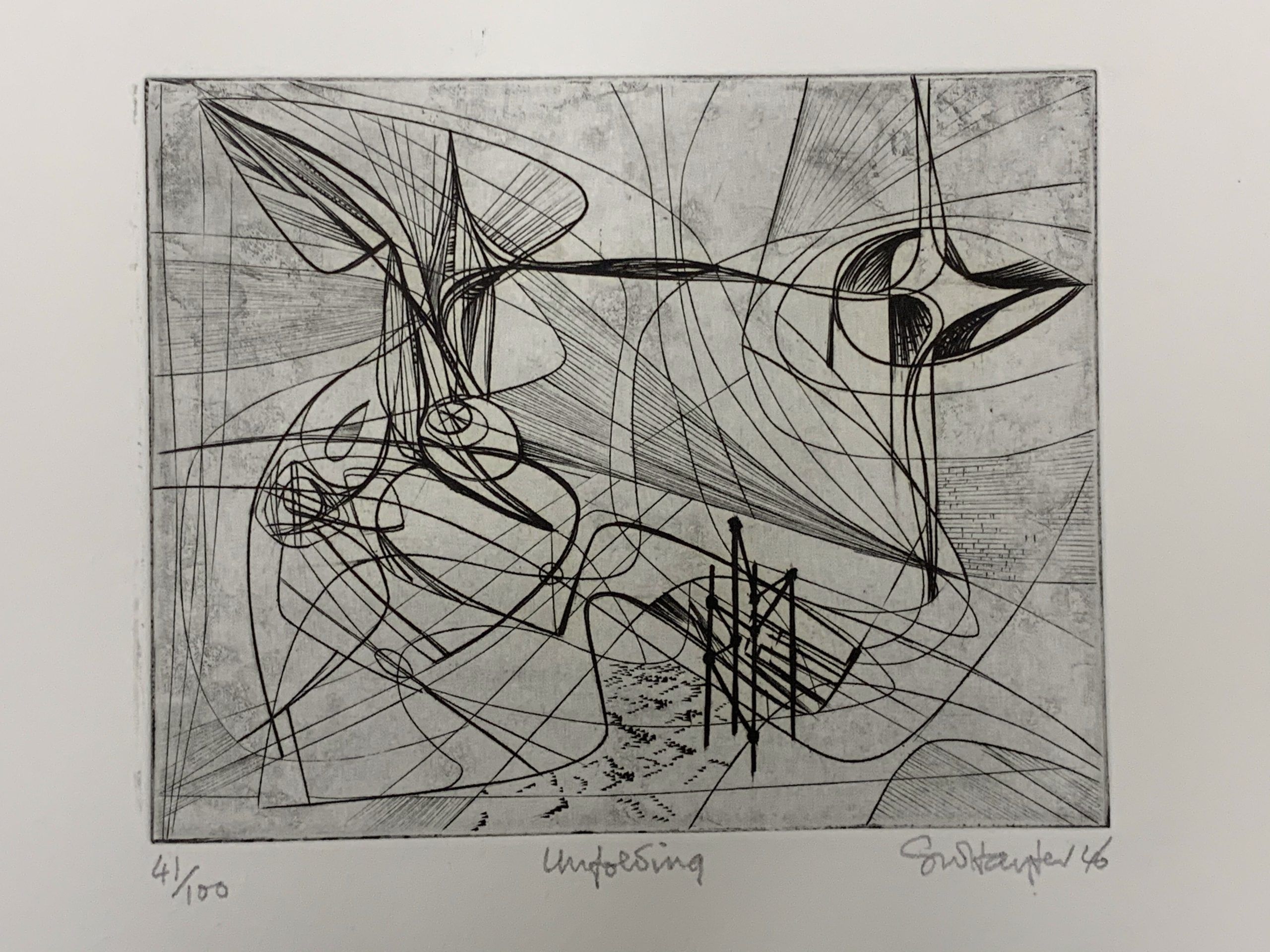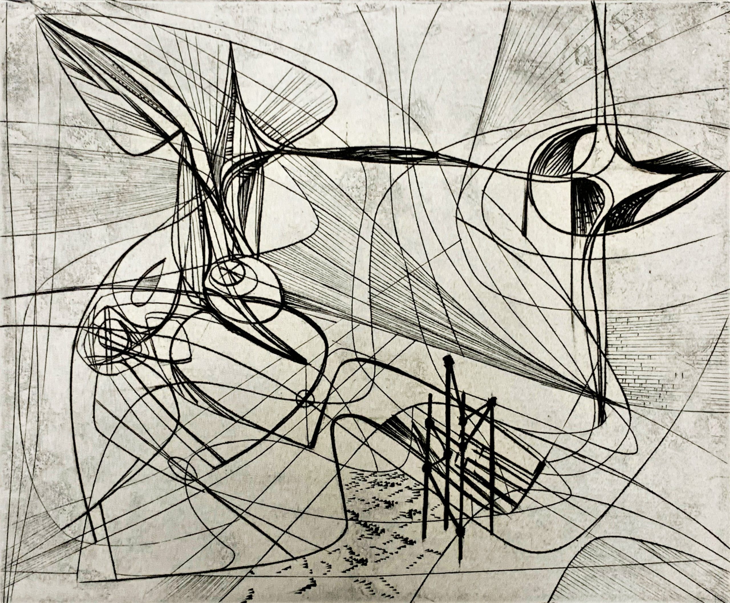 This work by Stanley William Hayter—undisputedly the most influential person in modern printmaking—is an Intaglio print made from engraving on a copper plate. The plate was begun in October 1945 and completed in March 1946.