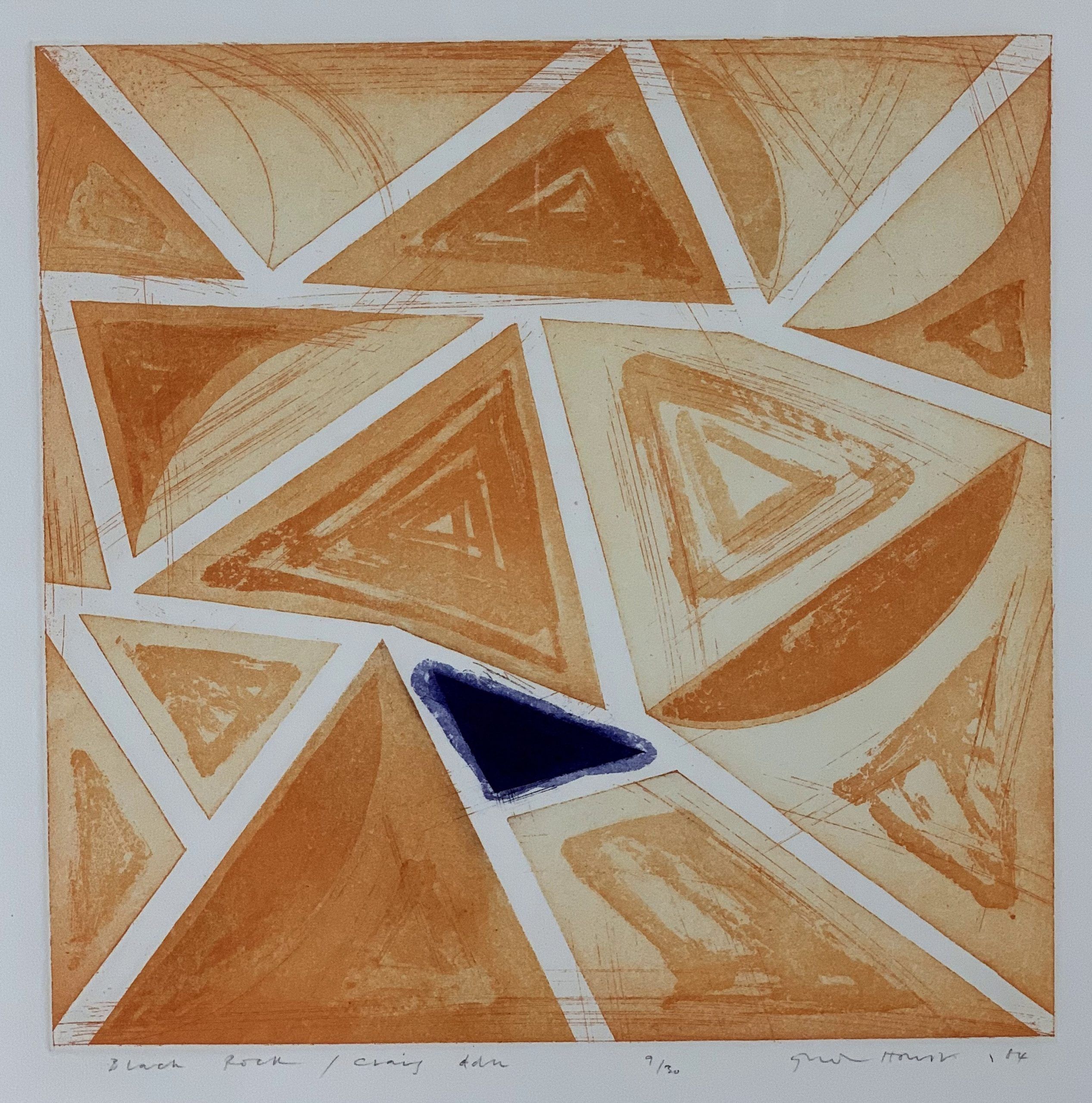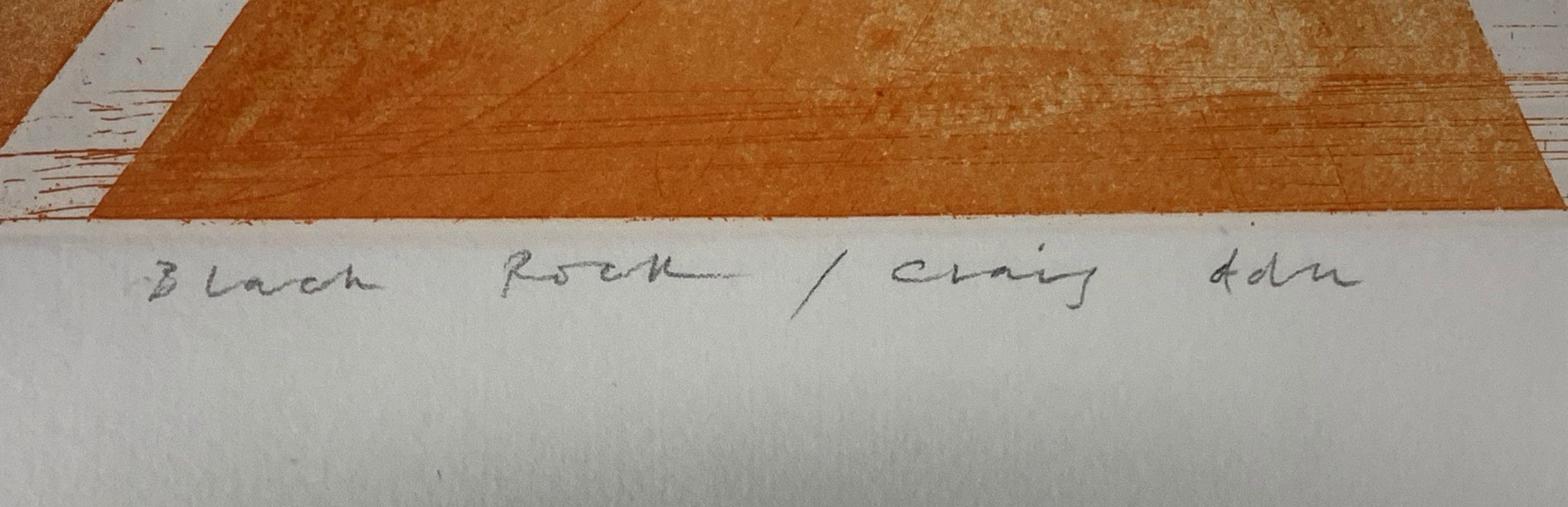This picture, called Craig Ddu, which means Black Rock, refers to a Welsh limestone quarry. The black hole punched in the landscape, surrounded by tumbling rocks, speaks eloquently of the role of mines and quarries in Welsh life and history. Craig Ddu is located fairly close to the Black Mountains, which are limestone, mudstone, siltstone, and red sandstone, probably explaining the warm orange-red colors used in the print.