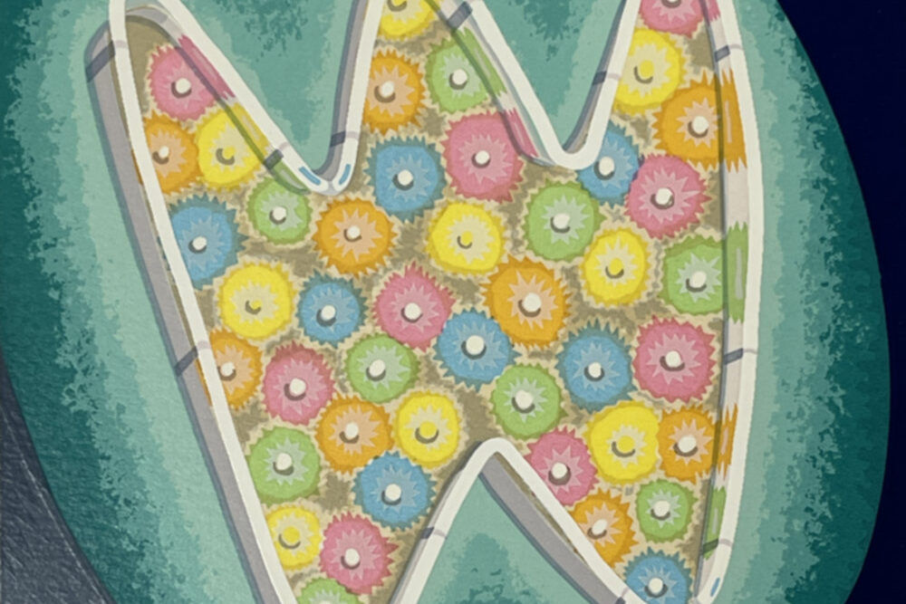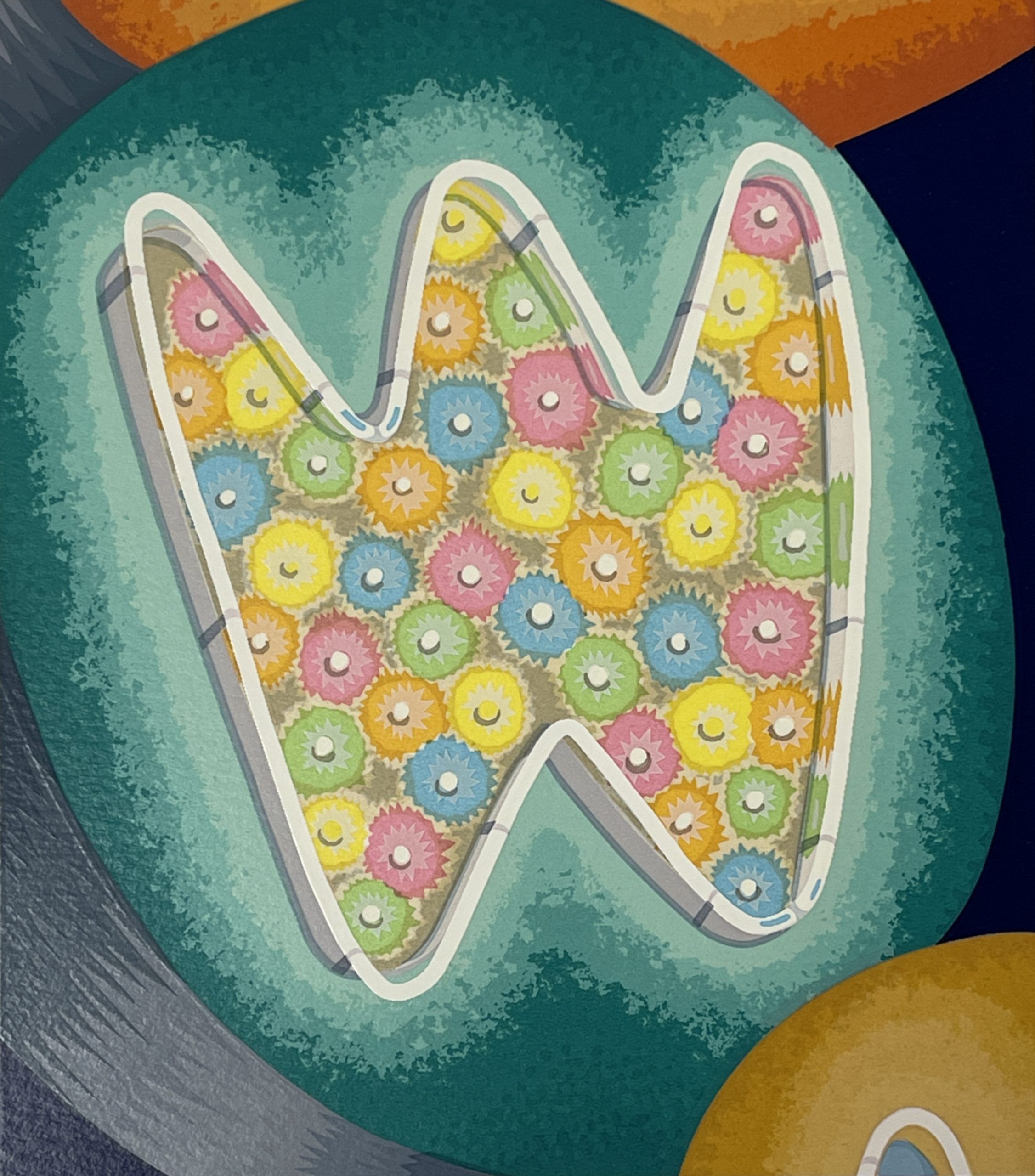 Clay Huffman’s background as an architecture student is clear in this work, which blends figurative with abstraction. Huffman nicknamed this work “Small McD,” and the work is commentary on McDonald’s as an emblem of Americanism.