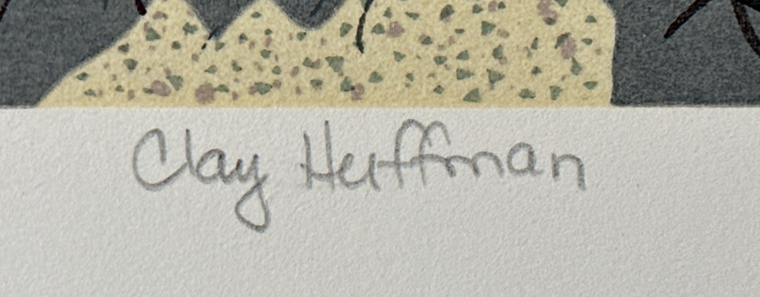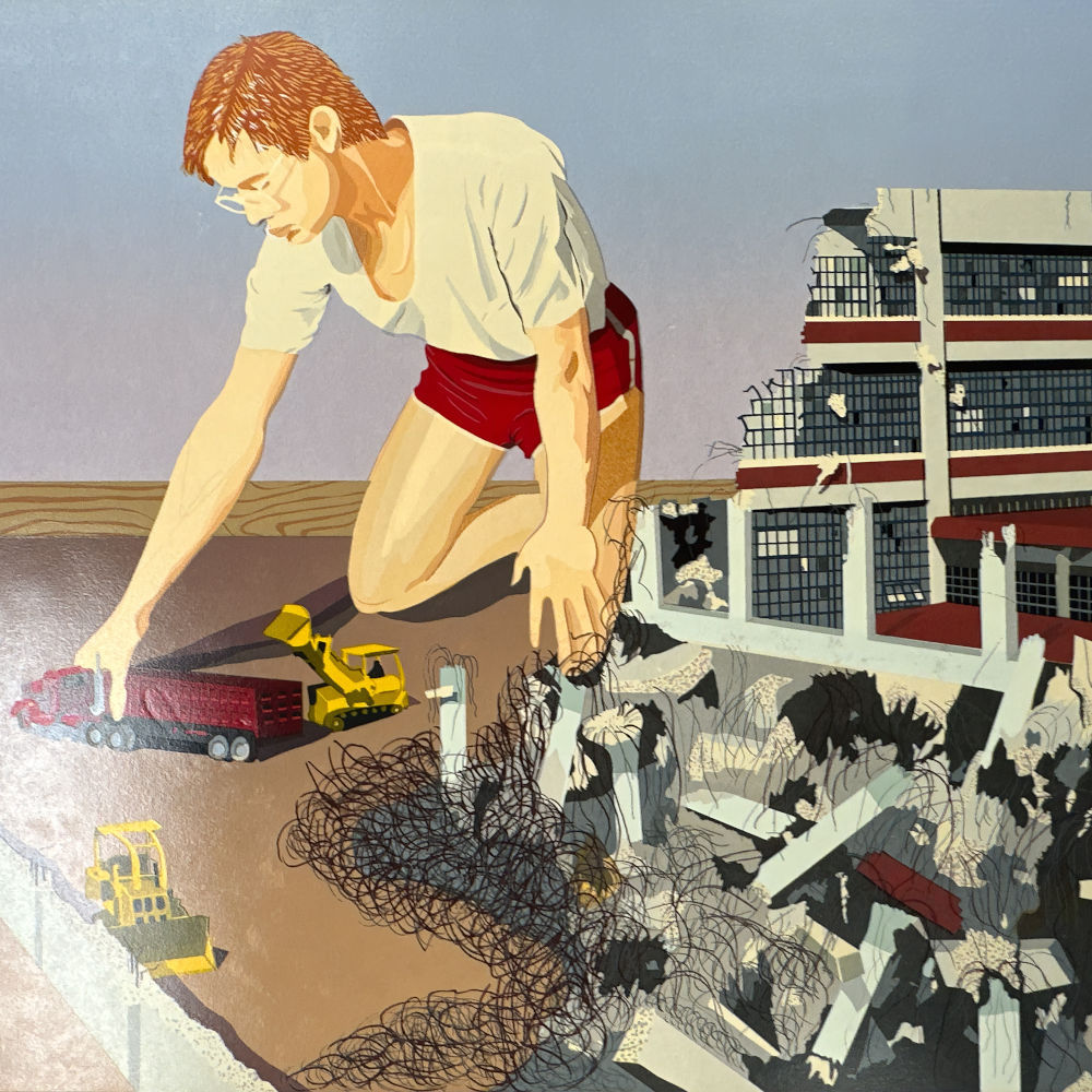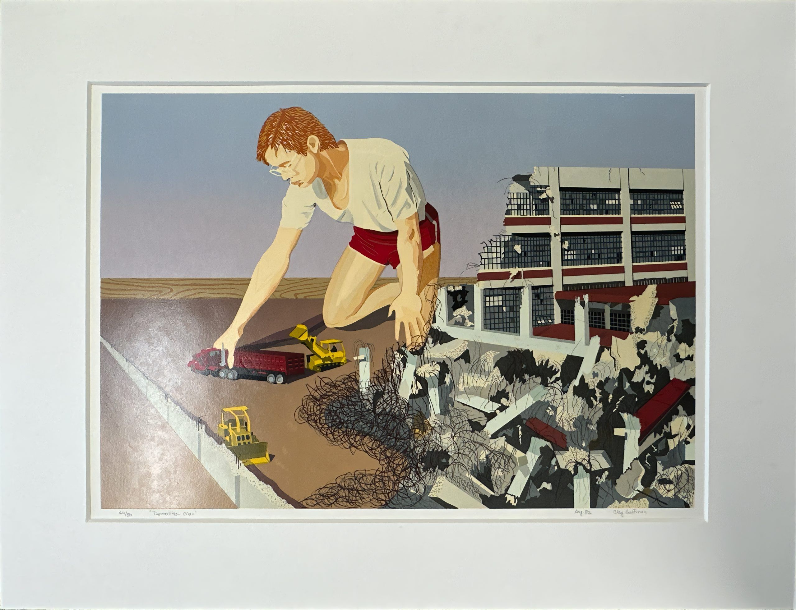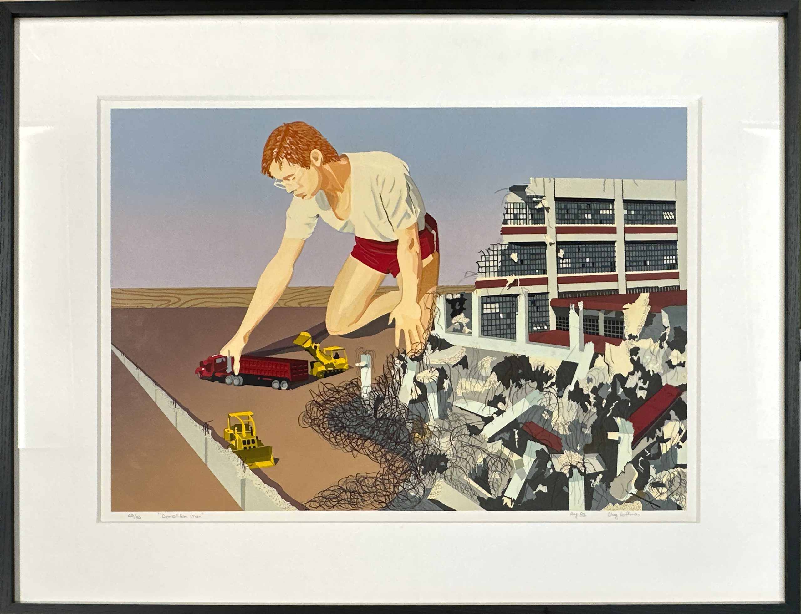 Shortly after Armistice Day, the U.S. Government built a new munitions factory on the banks of the Potomac in Alexandria, Virginia, steps from Washington, DC. The factory built munitions during World War II and was converted to storage after the war. In 1974 it was converted into an art center—called the Torpedo Factory—and became home to the largest number of publicly-accessible working artist studios in the U.S. In 1982 the building was completely gutted and renovated as part of the City’s redevelopment of the Potomac River waterfront. Clay Huffman—a long-time Torpedo Factory artist and beloved fixture in the DC-area arts community—portrays the building that was demolished to make way for a garage and condos and put himself in the picture, pretending to help along with demolition. With the heavy inking, glossiness, and luminosity of the silkscreen technique pioneered by mid-Century New York artist Clayton Pond.