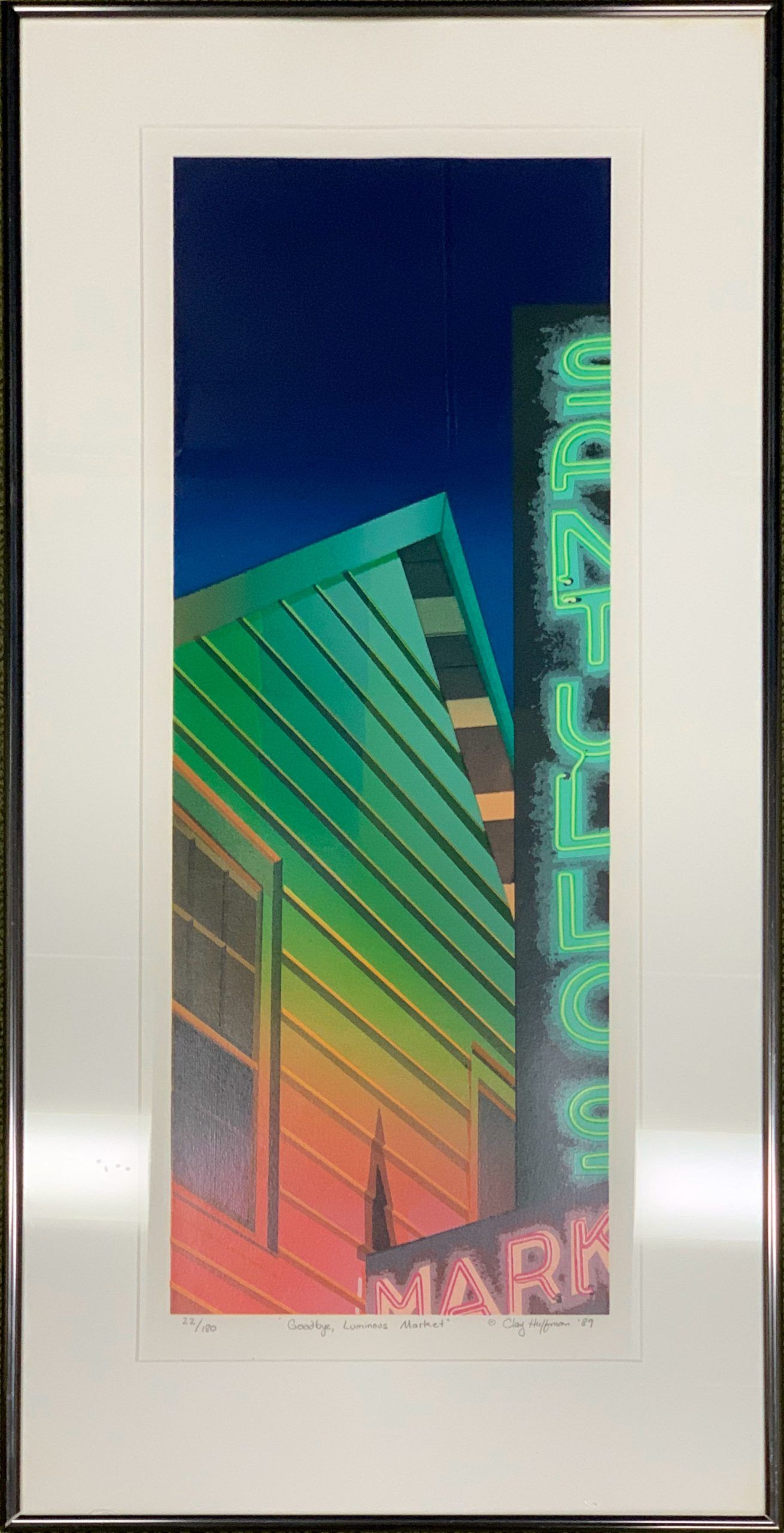 Clay Huffman drew his inspirations on “those places we pass each day and take little notice of”. Prior to beginning any silkscreen project, Huffman would make several trips to the location to capture the essence and mood of the place from various perspectives and times of day, developing a personal relationship with the site; it is this subjective insight that Huffman so successfully translated and conveyed through his work.