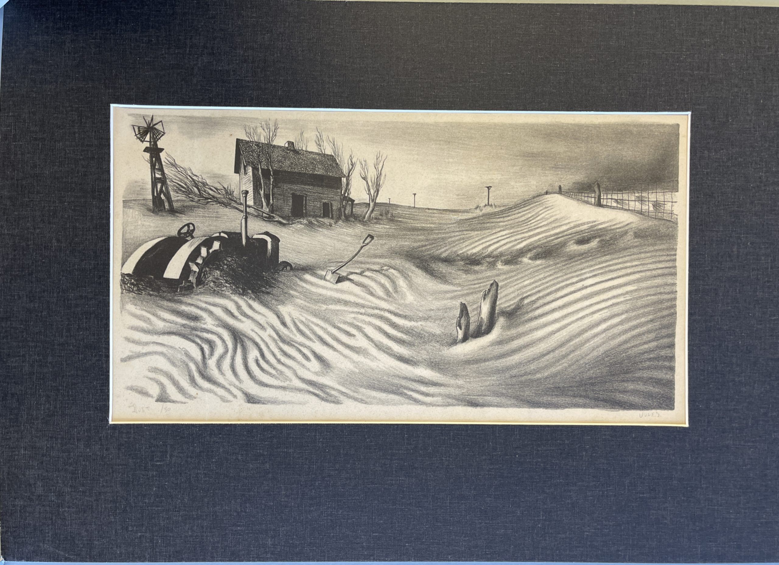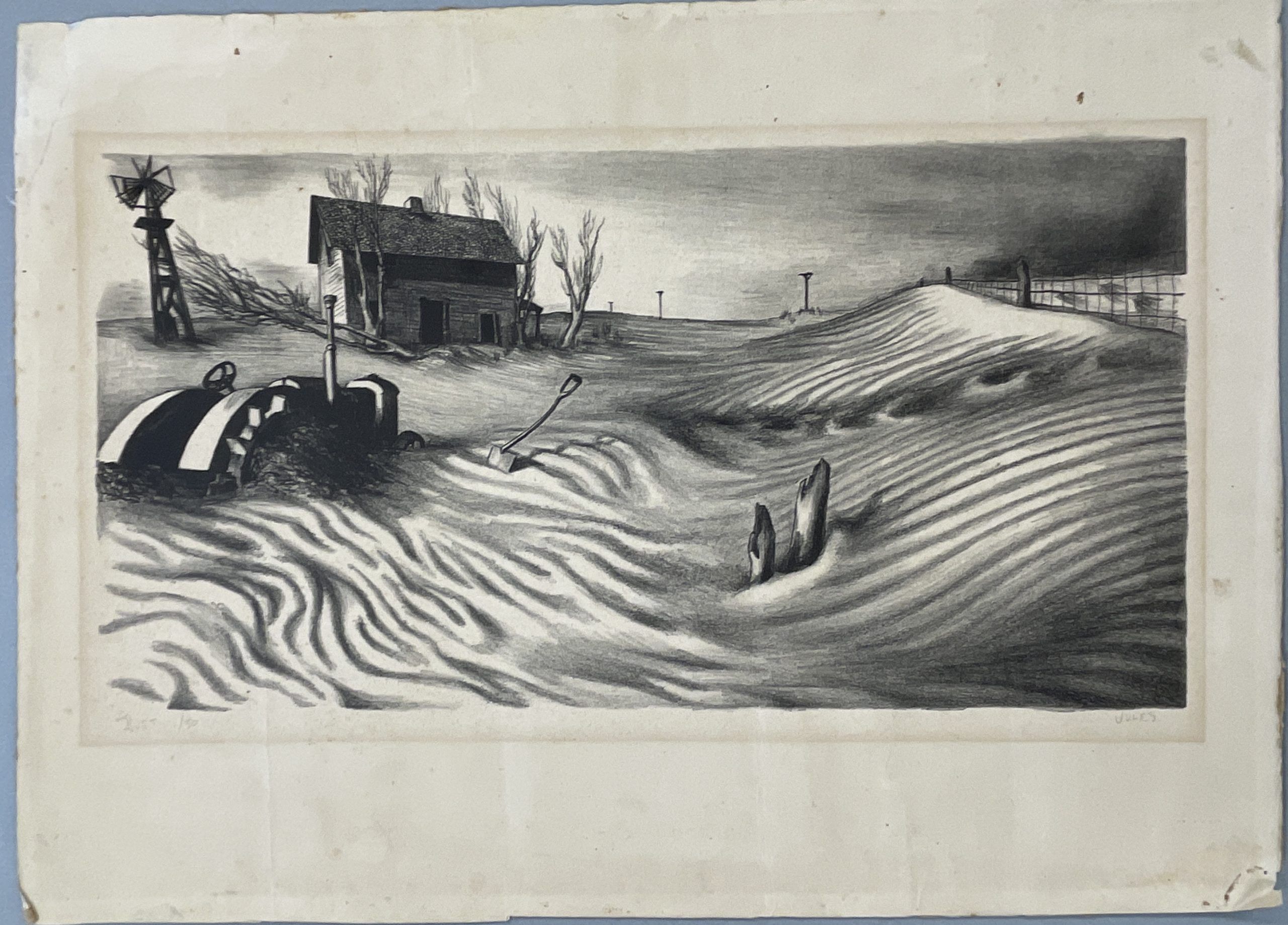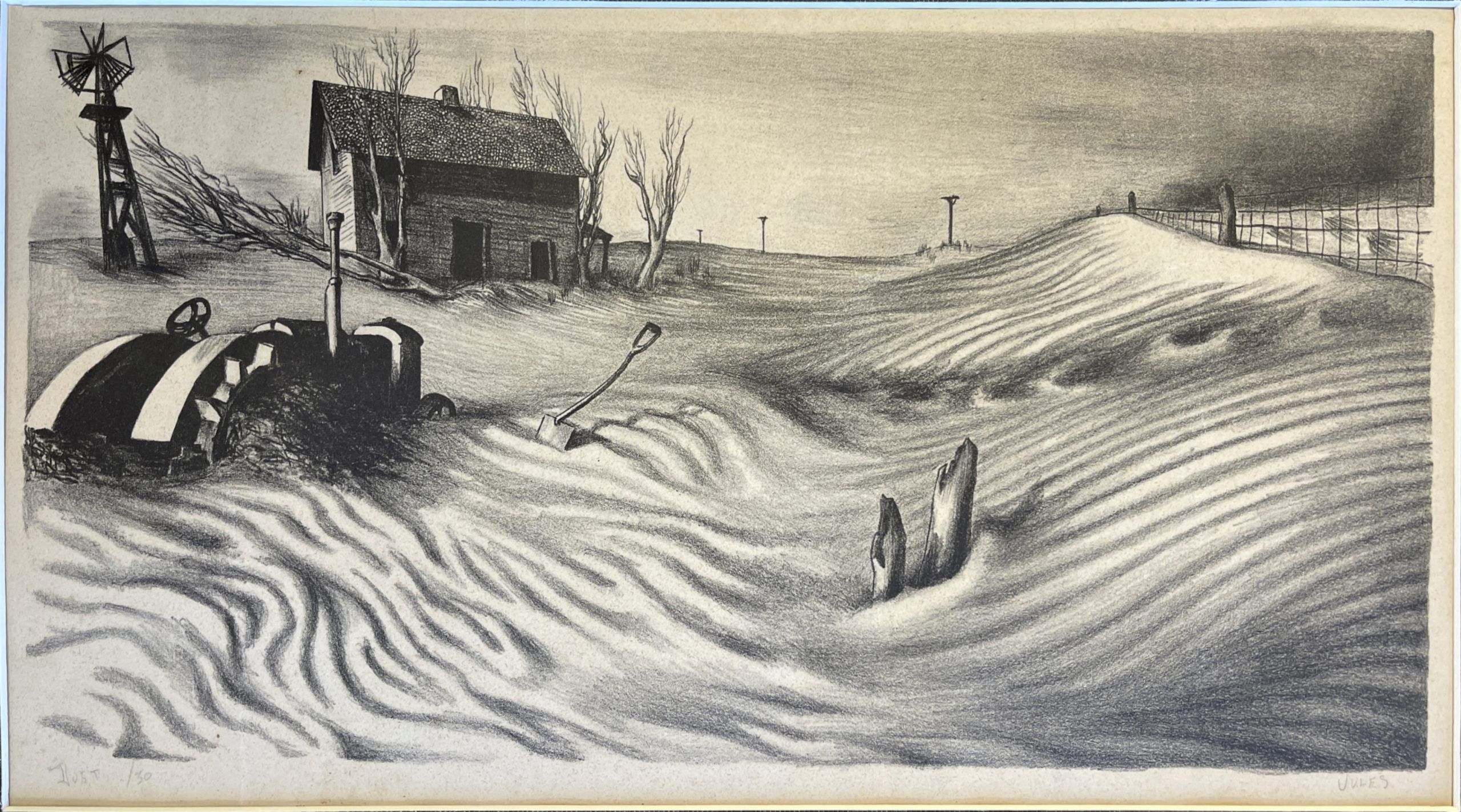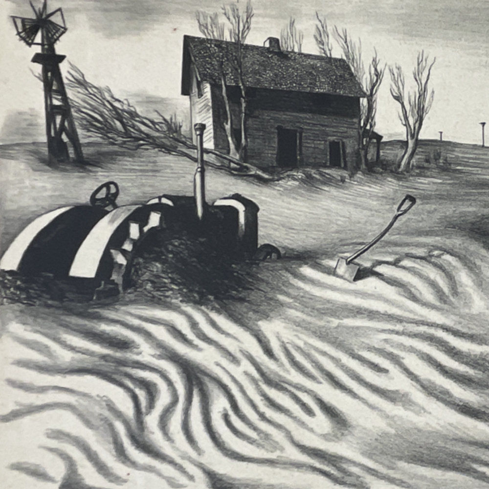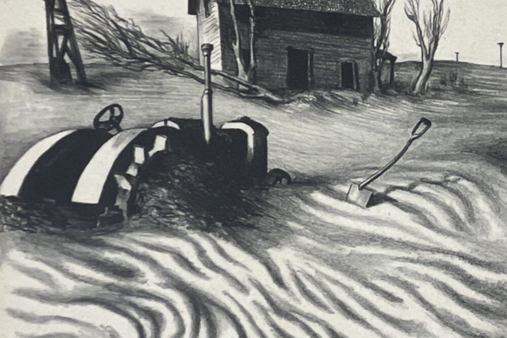 Mervin Jules‘ Dust is one of the most powerful commentaries of the Dust Bowl era. In this work, we see a tractor—supposed to be the salvation of the overworked farmer—sitting unused in fields so overworked that they had nothing left to give. This print, made while Jules was a student in Baltimore, was exhibited in the first national exhibition of the American Artists’ Congress as part of 30 duplicate “socially-conscious” exhibitions held in 30 American cities in December 1936, with the activist agenda of encouraging contact between artists and their audiences and furthering the democratization of art.