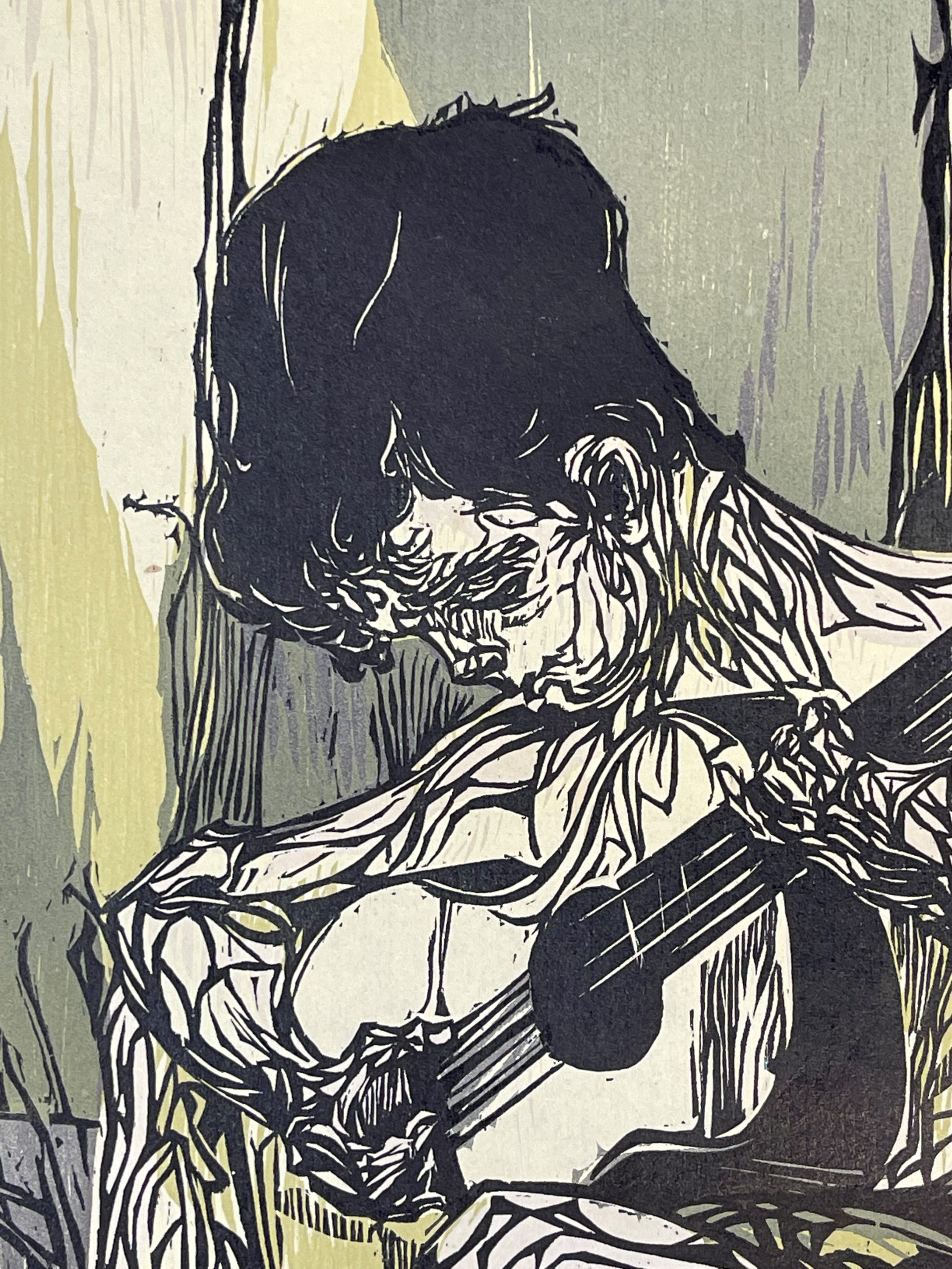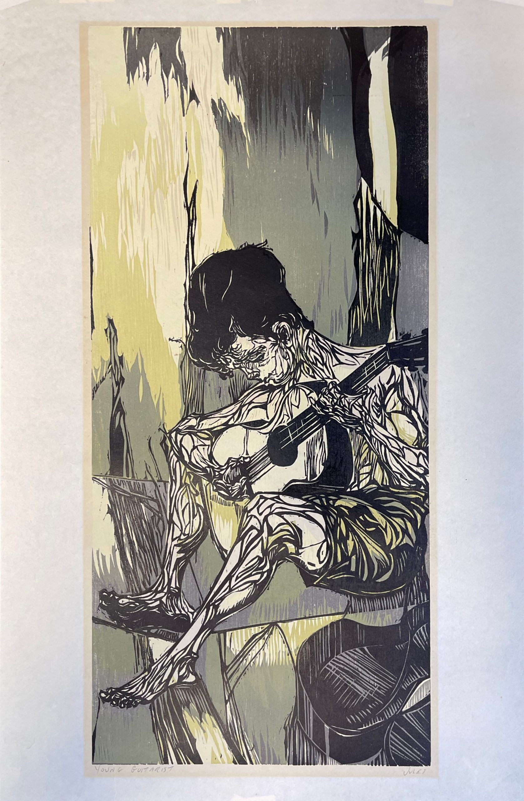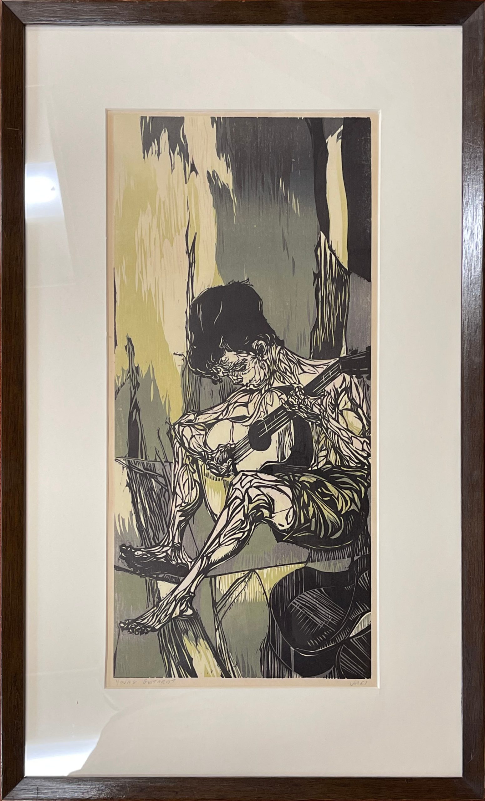 Mervin Jules produced a great many works showing musicians.  This work is a delightful study of the deep concentration of the young guitarist.