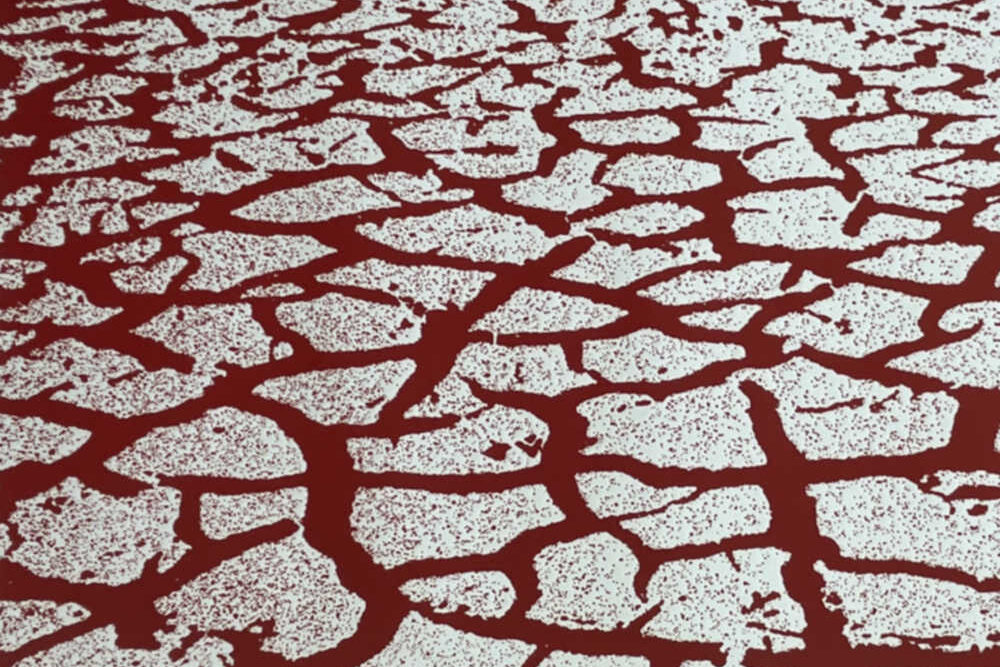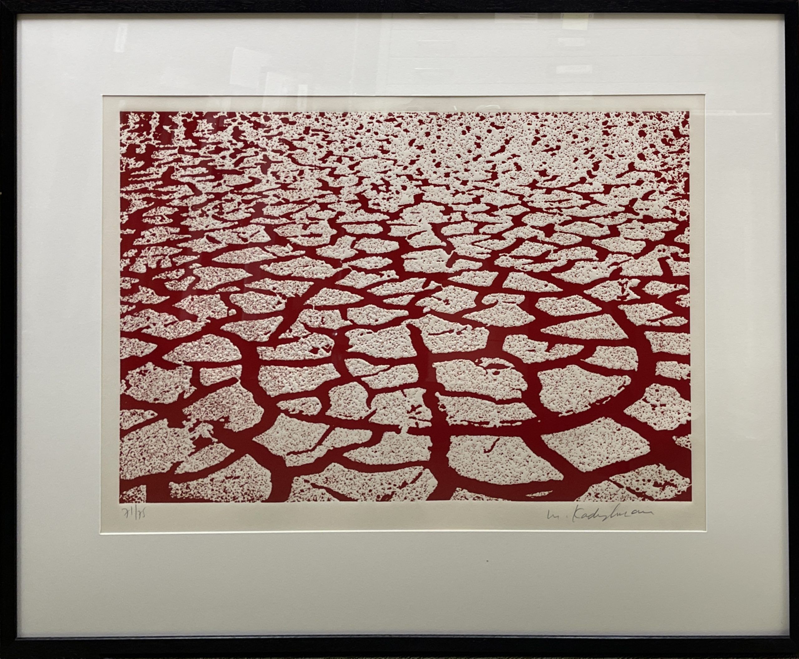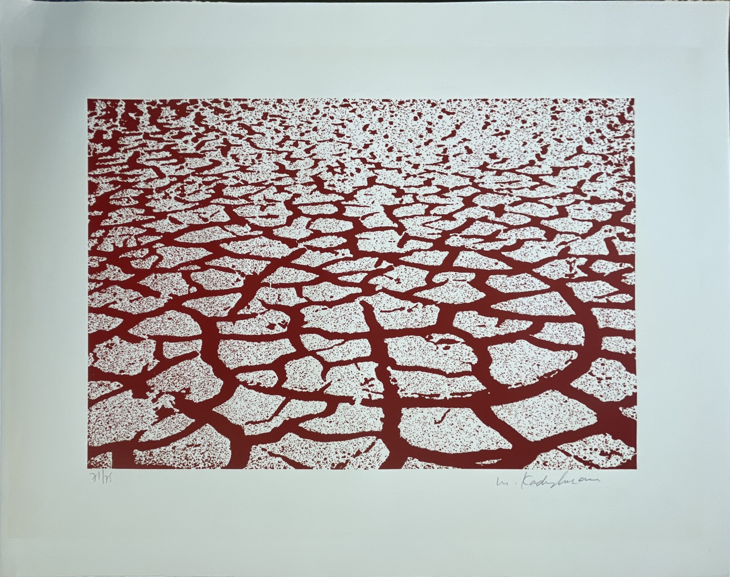 Menashe Kadishman began his artistic career as a minimalist sculptor in London and by the late 1960s he was a pioneer of conceptual art, blurring the boundaries between art and non-art.  In the late 1970s, Kadishman decided that nature had to be brought back into museum halls, which he did with great drama when he displayed a live flock of sheep stained blue at the 1978 Venice Biennale.  (Caring for the sheep was easy for him; he had worked as a shepherd on a kibbutz in his youth.)  Sheep would become a major motif in his art and, more broadly, very little of his work from that time forward lacked naturalistic imagery.  In his Cracked Earth series, Kadishman portrays cracks in the land which despite the cracks (perhaps because of the vibrant colors) seem pregnant with promise; indeed, they are like the conversion of desert sand to farm land which he watched during his lifetime in Israel.