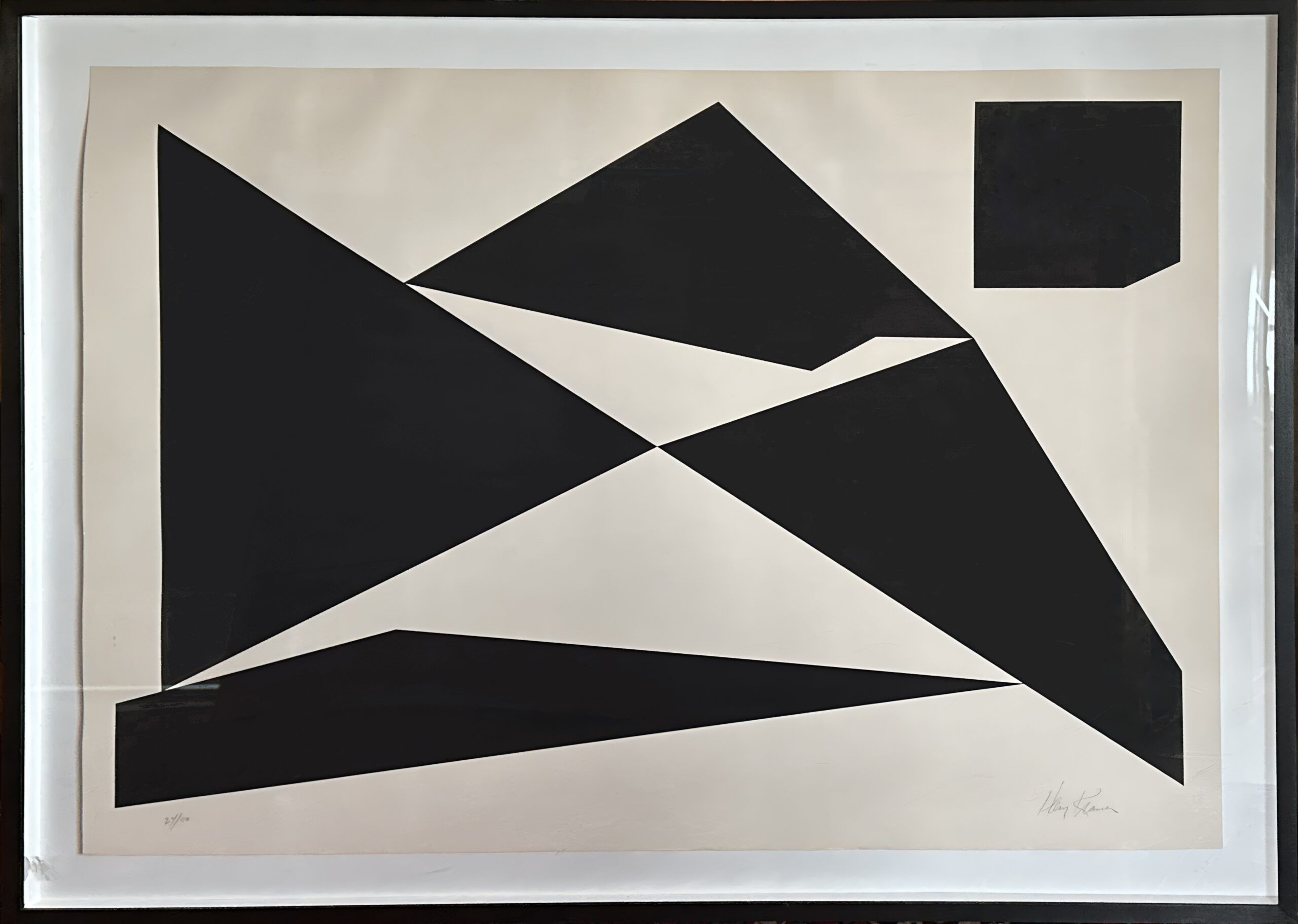 Custom framed in a black-painted wood frame behind Plexiglas.