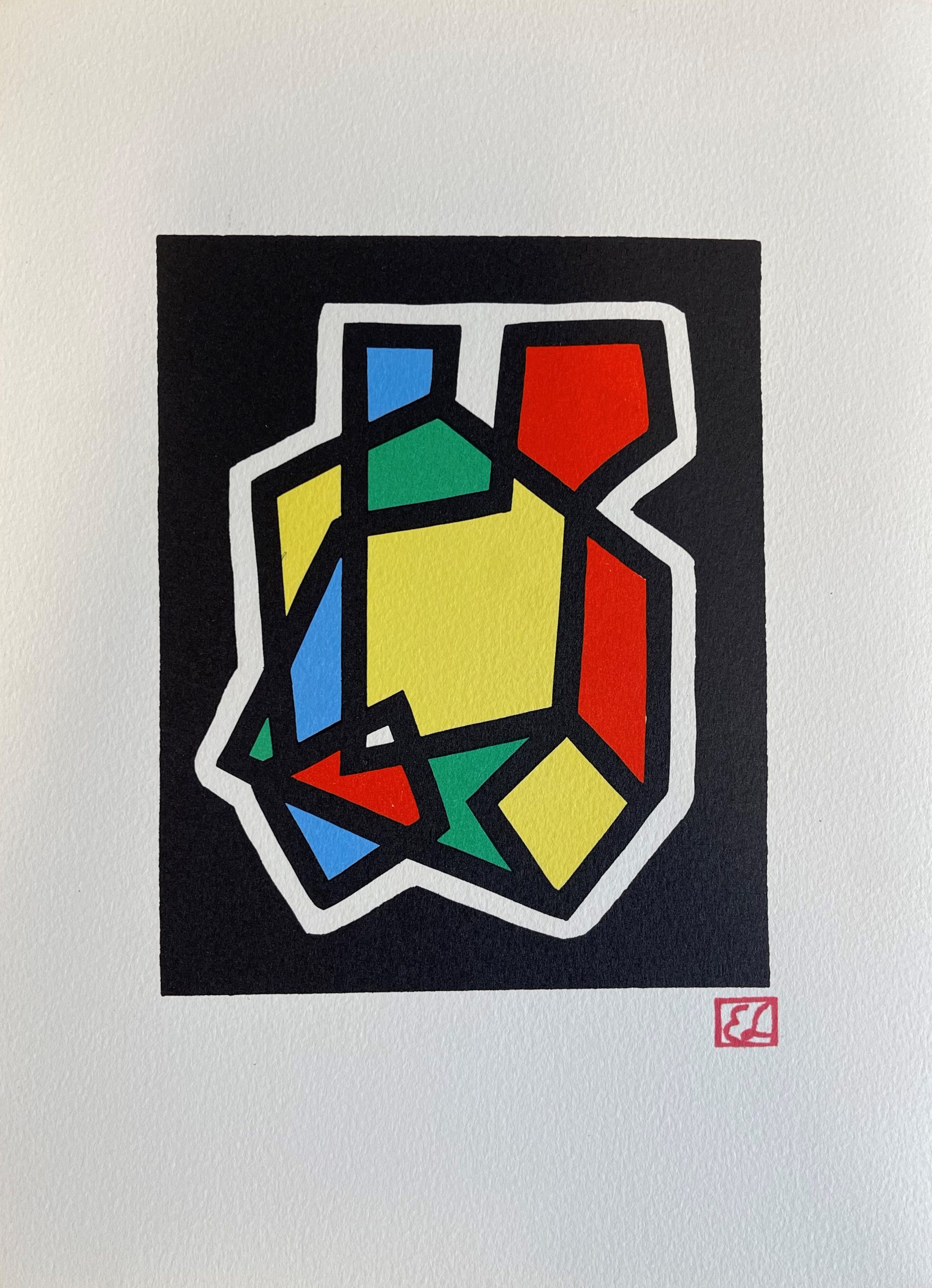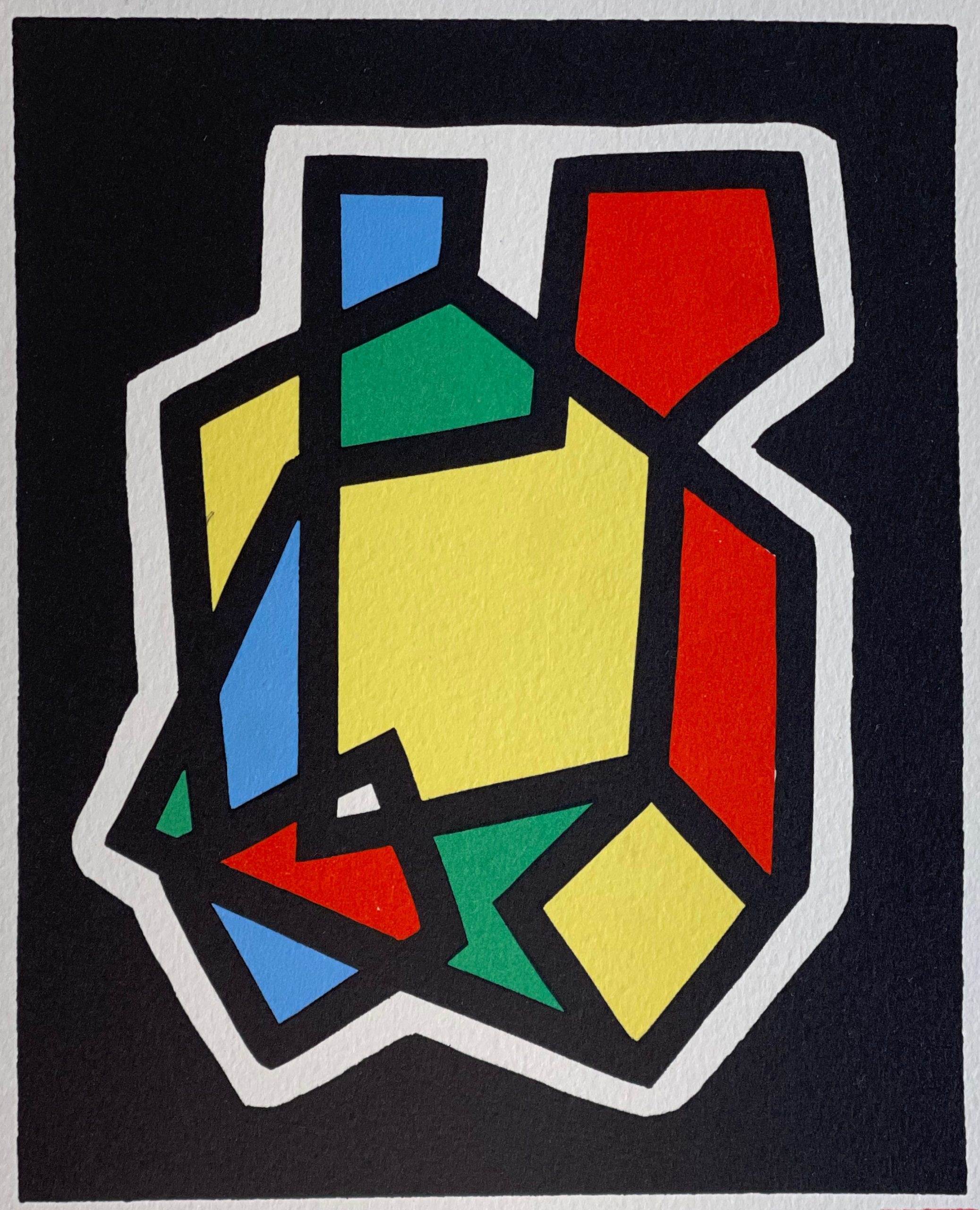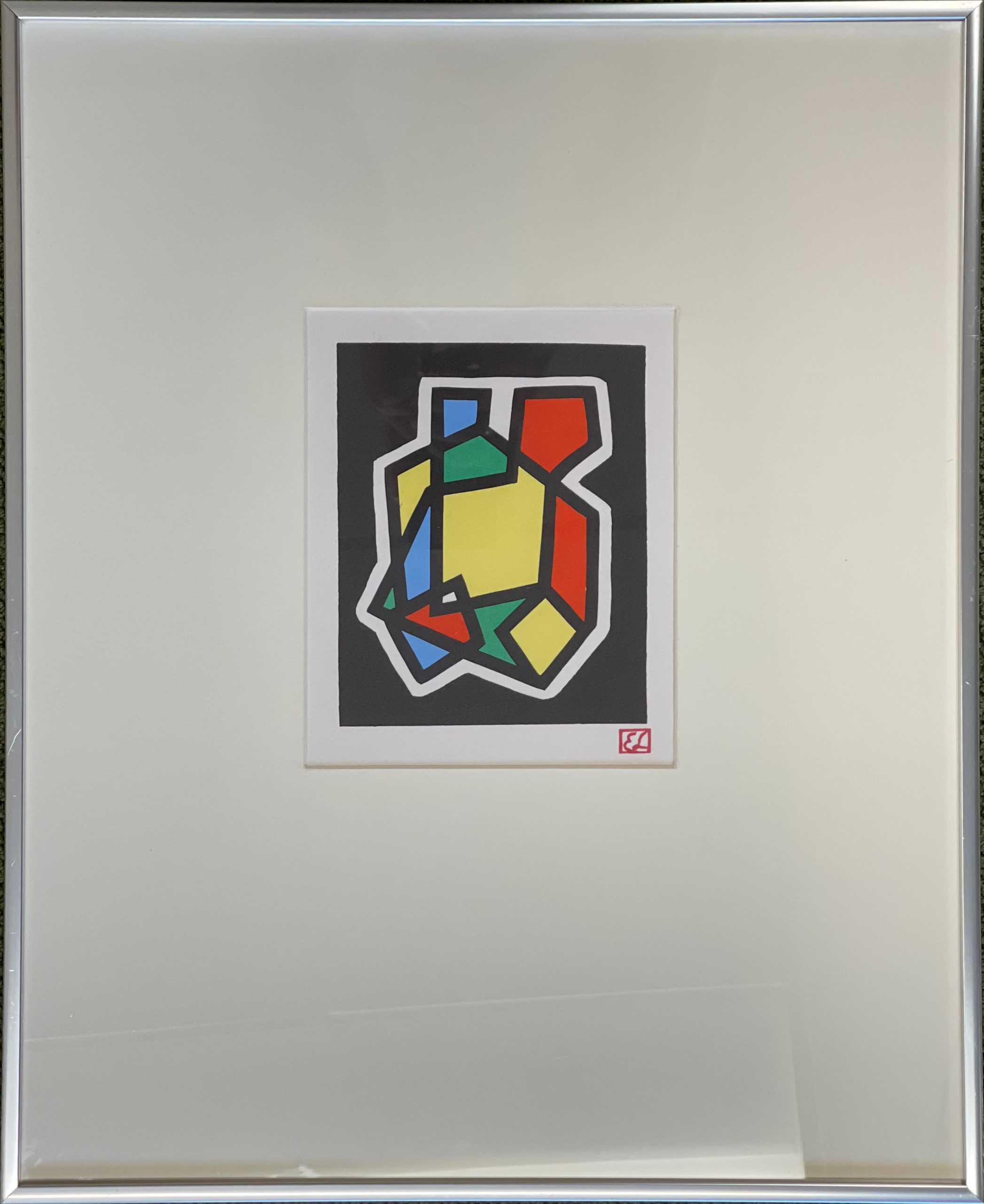 “Harpsichord” marries together the Cubism which is found in Lahner’s earliest works with the look of the stained glass chapel windows that he made in Algiers in the middle years of his career.  It is from a portfolio of Emile Lahner’s abstractions published by Lahner’s long-time dealer, Laszlo Laky.  (Lahner met Laky in Paris when he had a job working as a Hungarian-language guide for Laky; Laky was there looking—but not finding—Parisian artists whose work he could sell in his Carmel gallery. At long last, Lahner confessed to Laky that he was a painter and after seeing Lahner’s work Laky became Lahner’s sole American dealer. Lahner enjoyed great economic and critical success in the American market thanks to Laky’s efforts.)