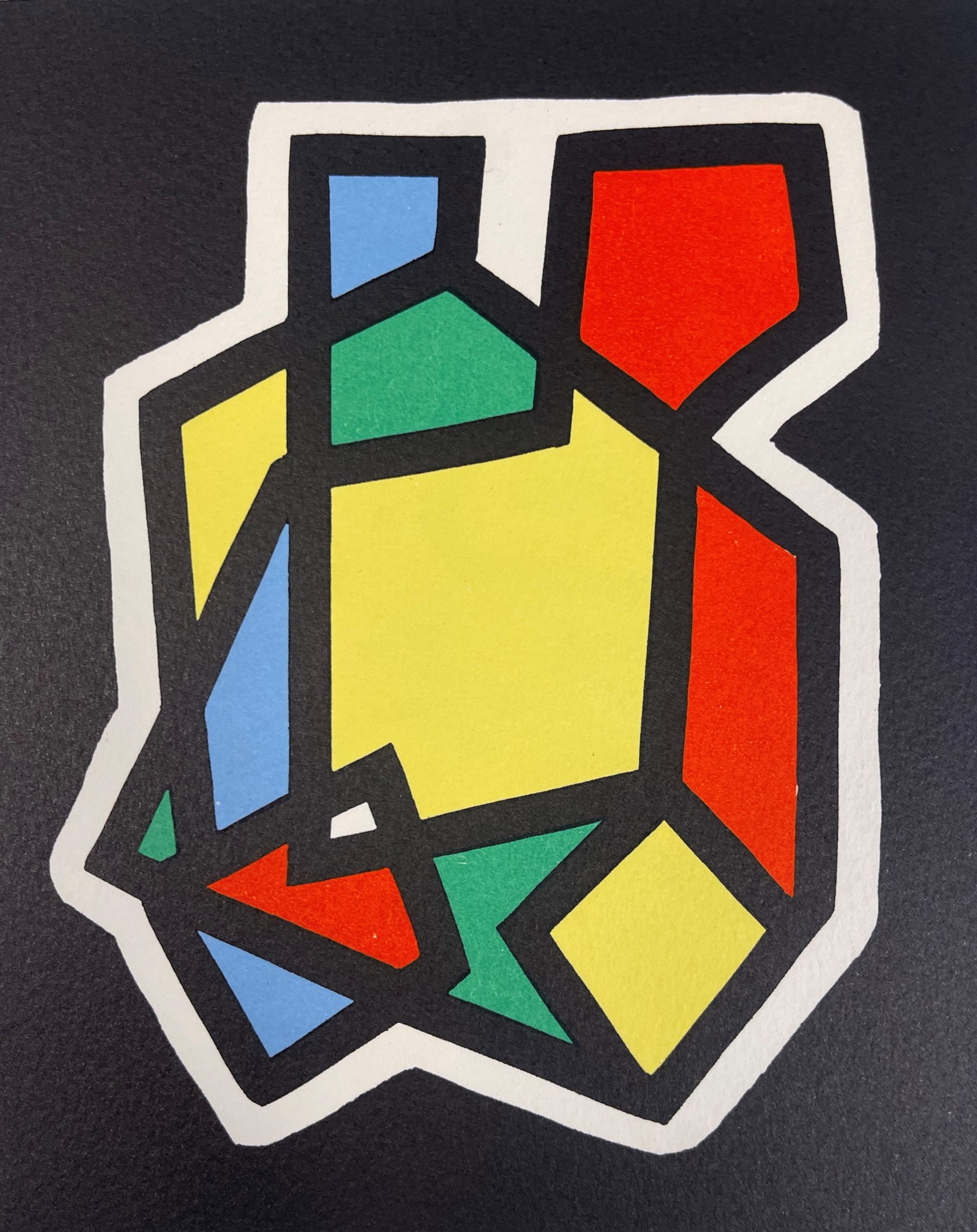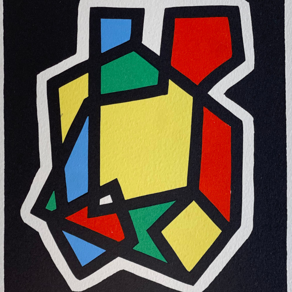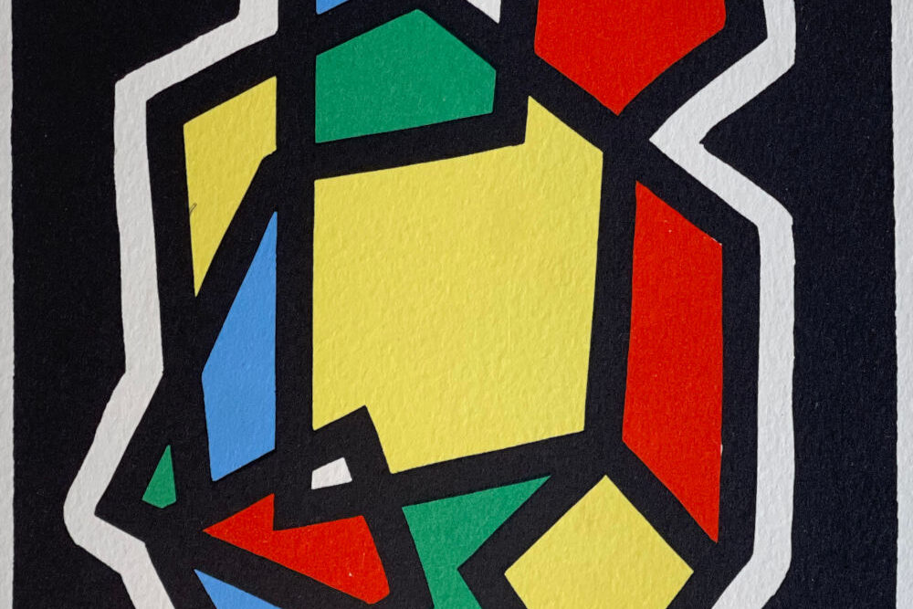 “Harpsichord” marries together the Cubism which is found in Lahner’s earliest works with the look of the stained glass chapel windows that he made in Algiers in the middle years of his career.  It is from a portfolio of Emile Lahner’s abstractions published by Lahner’s long-time dealer, Laszlo Laky.  (Lahner met Laky in Paris when he had a job working as a Hungarian-language guide for Laky; Laky was there looking—but not finding—Parisian artists whose work he could sell in his Carmel gallery. At long last, Lahner confessed to Laky that he was a painter and after seeing Lahner’s work Laky became Lahner’s sole American dealer. Lahner enjoyed great economic and critical success in the American market thanks to Laky’s efforts.)