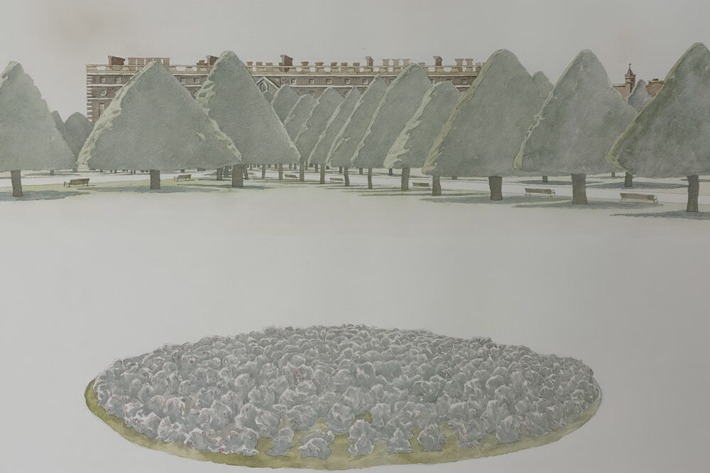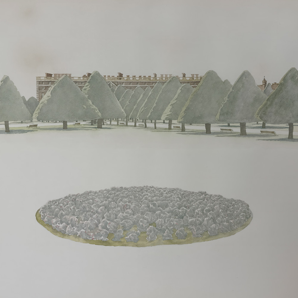Leonard Lehrer’s romantic presentation by watercolor of Hampton Court, the palace at the center of court life during the reign of Henry VIII and the Tudors who followed.