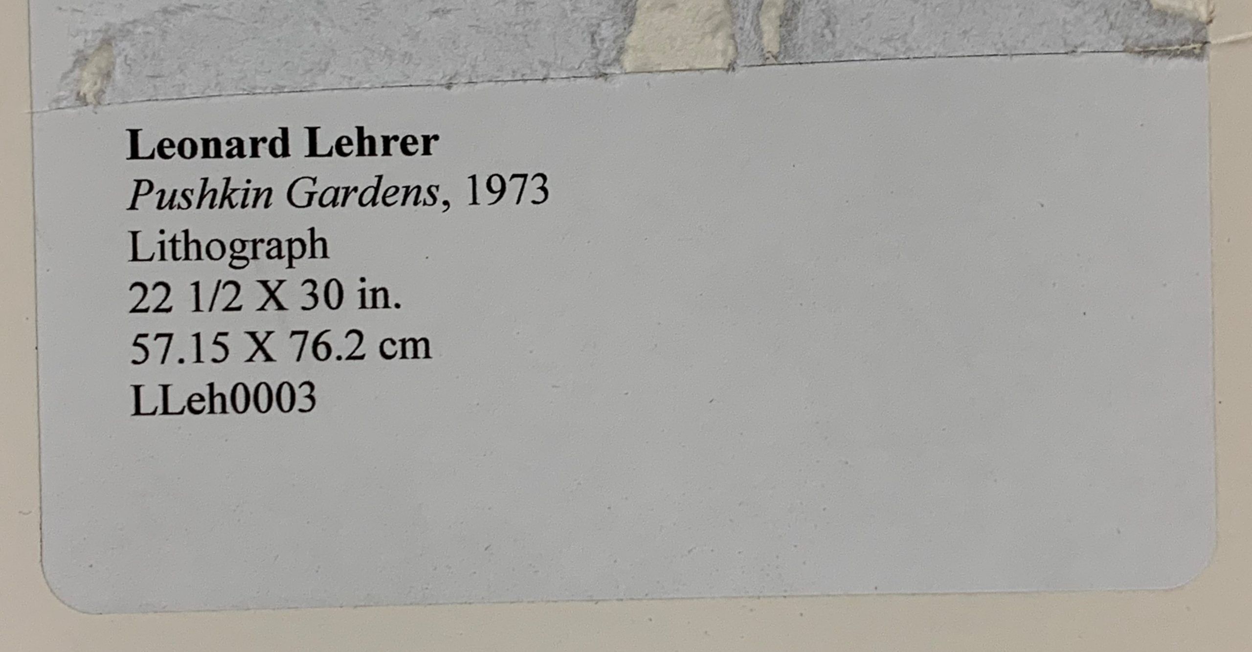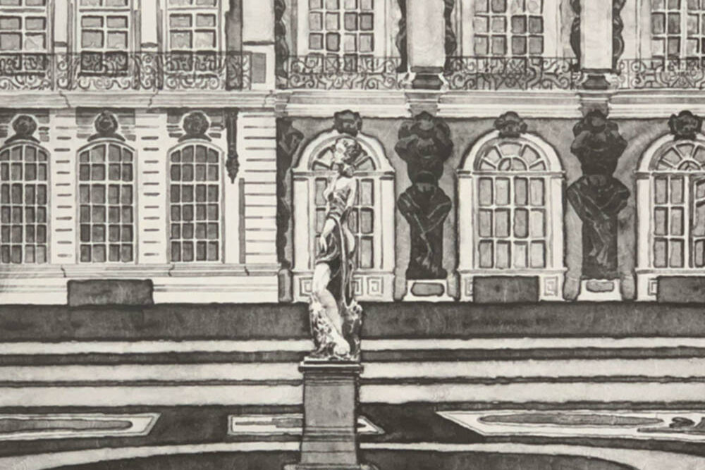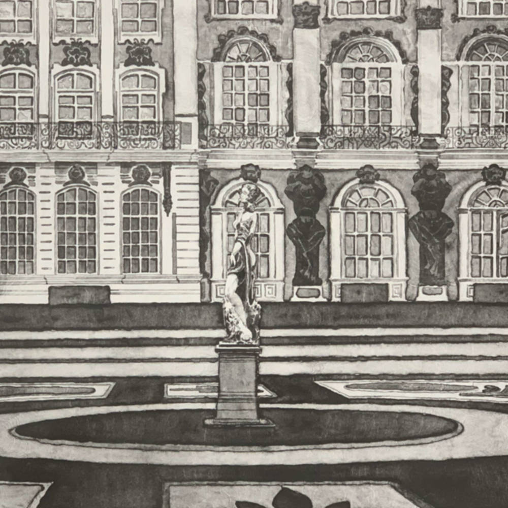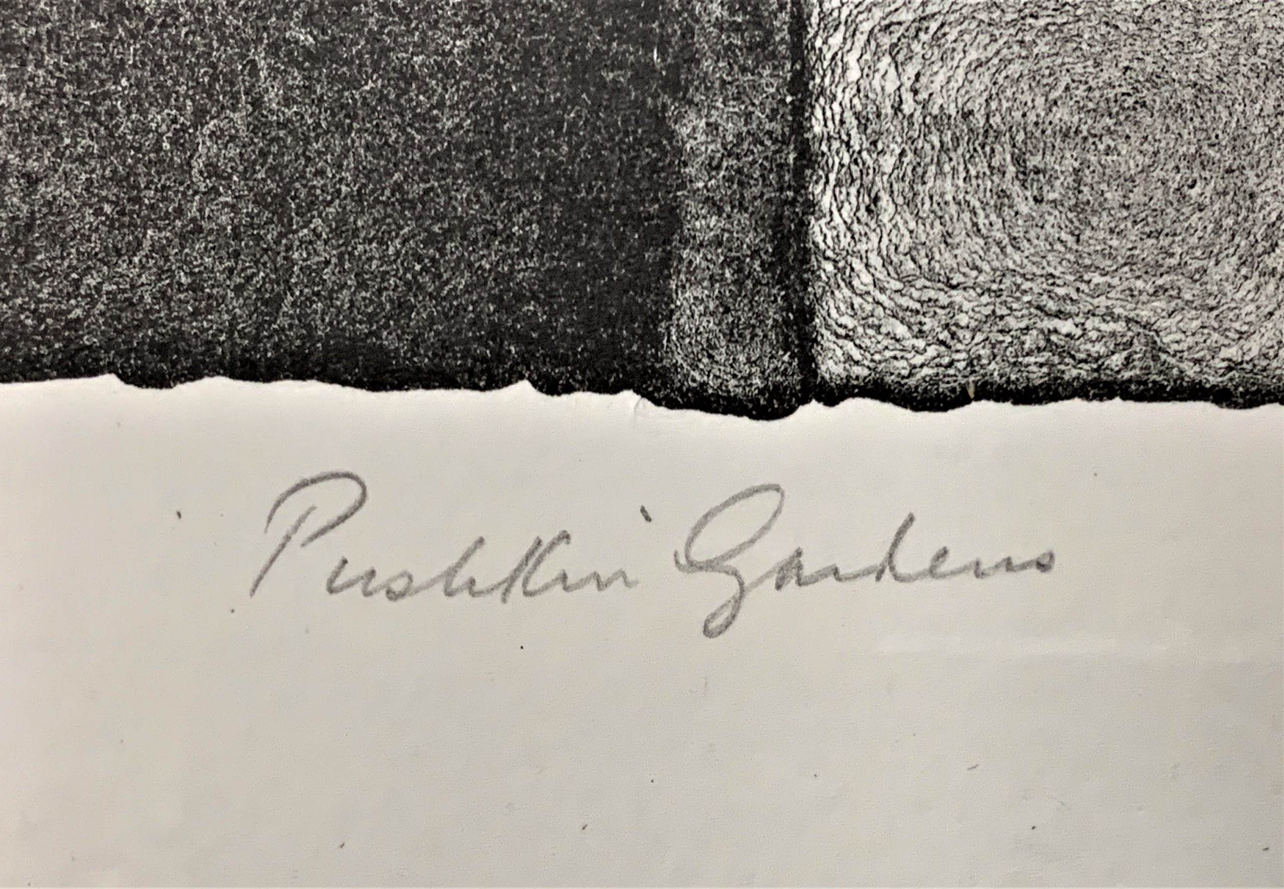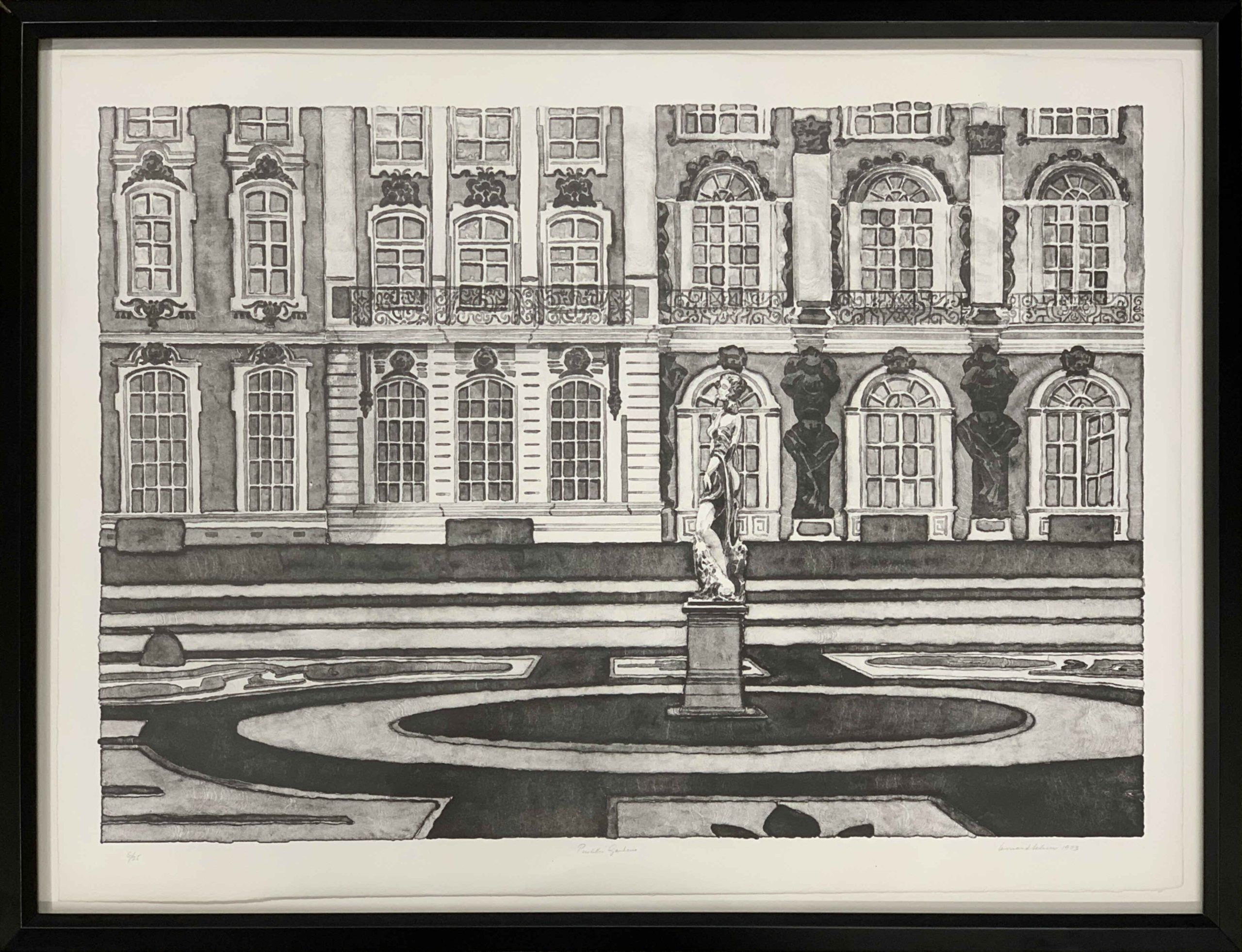This work demonstrates Leonard Lehrer’s primacy as a printmaker. Marrying together bold lines with subtle shading, he creates a remarkable three-dimensionality. This beautiful rendition of the opulent Pushkin Gardens, Russia’s first landscape garden when it was built in about 1770 by Catherine the Great, simultaneously has the character of a line drawing with the aliveness of the hyperrealists. This technique, found in all of Lehrer’s Formal Gardens works and a Lehrer hallmark, is difficult to achieve successfully in the challenging arena of lithography.