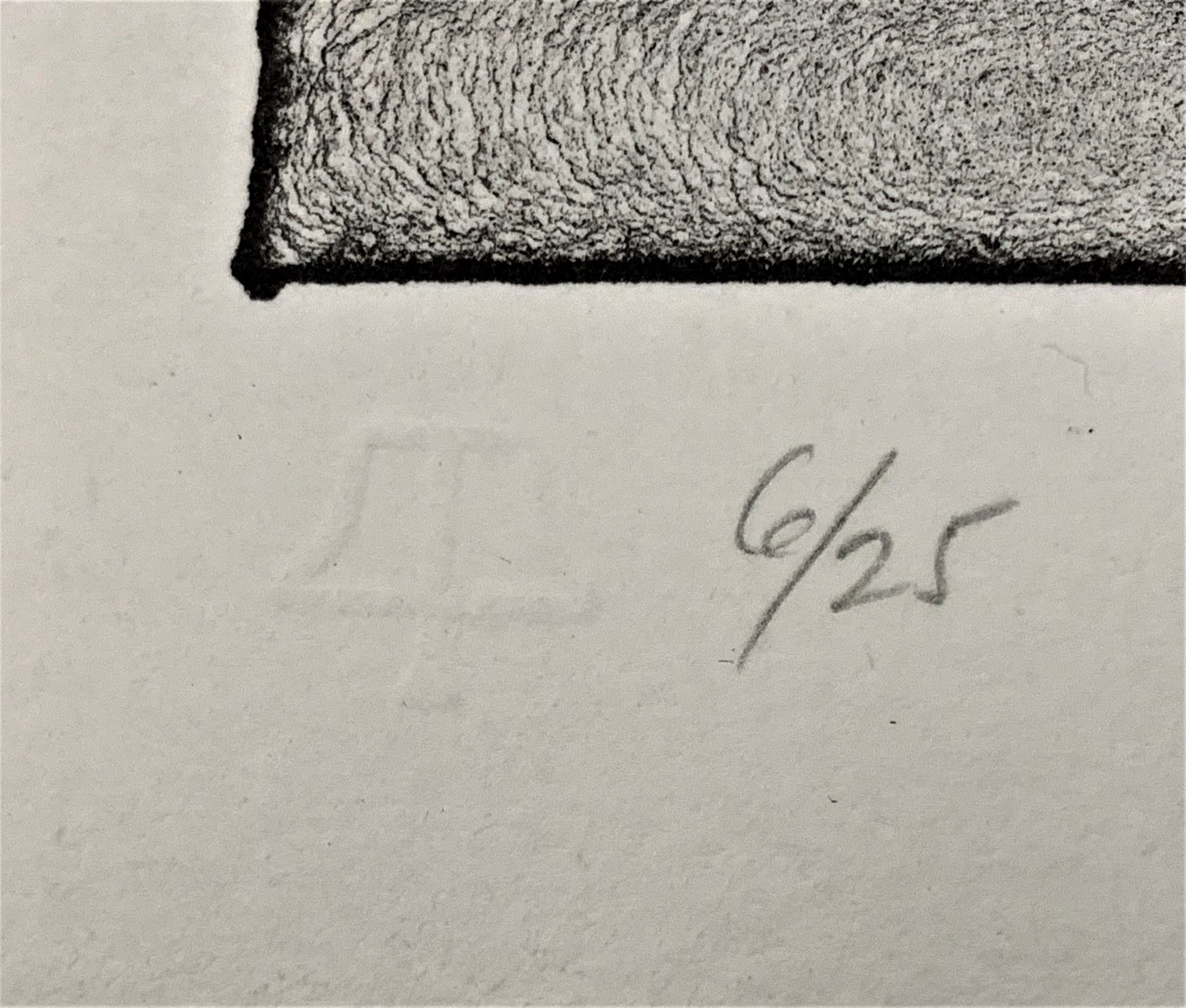 Hand-signed in Pencil by the artist en recto lower right. Titled in pencil by the artist en recto center. Numbered in pencil by the artist en recto lower left.  Bearing the blindstamp of Tamarind Institute.