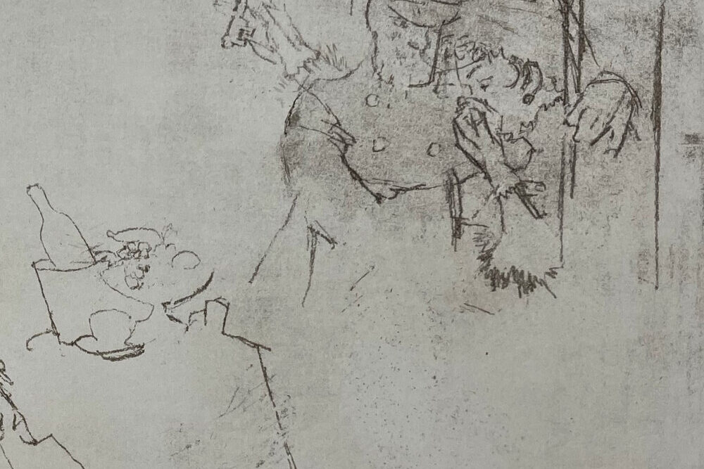 This print is a soft ground etching, made by using a softer and stickier waxy ground than is normally used in etching. Depending on the smoothness of the paper used to make the etching plate, the lines of the print can resemble pencil, chalk, or pastel, and generally are soft and somewhat irregular. Levine used the technique to great effect in this print, yielding a rough and broken line perfectly matched to the seamy characters portrayed in this series of etchings.