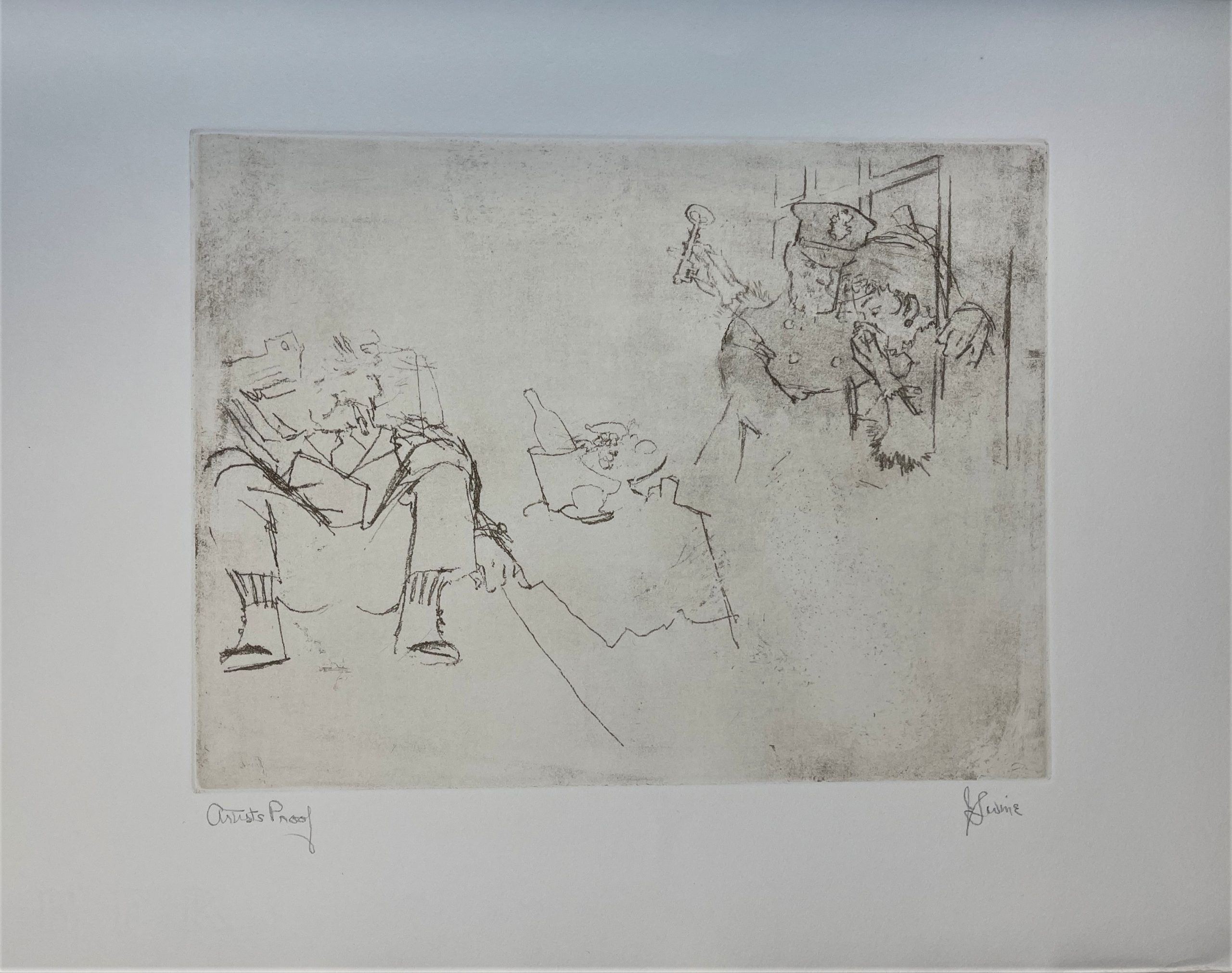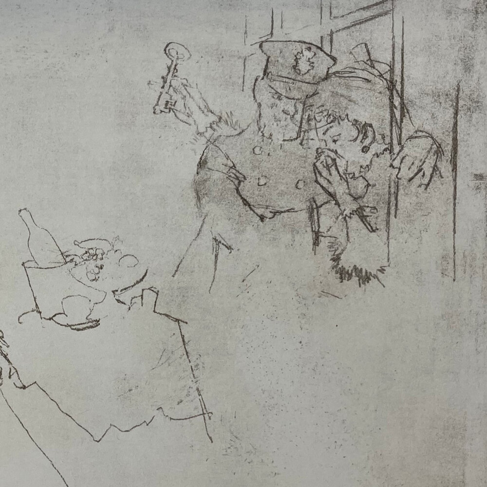 Berthold Brecht’s 1930 film Dreigroschen [The Threepenny Opera] introduced the world to the great musical standards “The Ballad of Mack the Knife” and “Pirate Jenny”, among others. More than that, it was a biting socialist critique of the capitalist world, and in that regard it resonated with Jack Levine, one of the great social critic artists in the mold of Philip Evergood, Leonard Baskin, and George Gropper. Levine was inspired by Dreigroschen—and his memories of truancies from school, occasions in which he would tour the erotic temptations of Boston—to make a suite of pictures, of which this etching is the 13th plate.