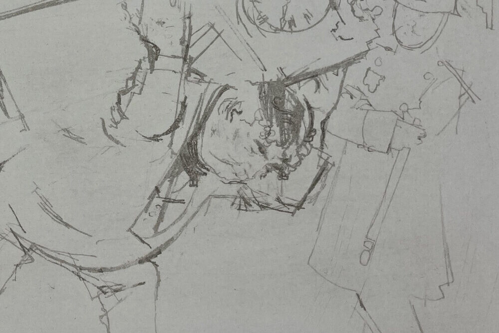 This print is a soft ground etching, made by using a softer and stickier waxy ground than is normally used in etching. Depending on the smoothness of the paper used to make the etching plate, the lines of the print can resemble pencil, chalk, or pastel, and generally are soft and somewhat irregular. Levine used the technique to great effect in this print, yielding a rough and broken line perfectly matched to the seamy characters portrayed in this series of etchings.