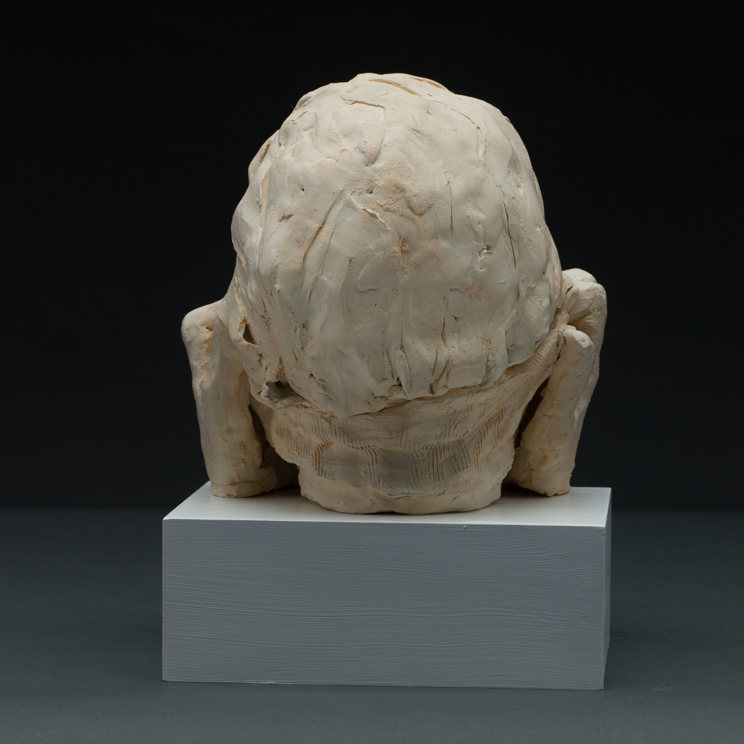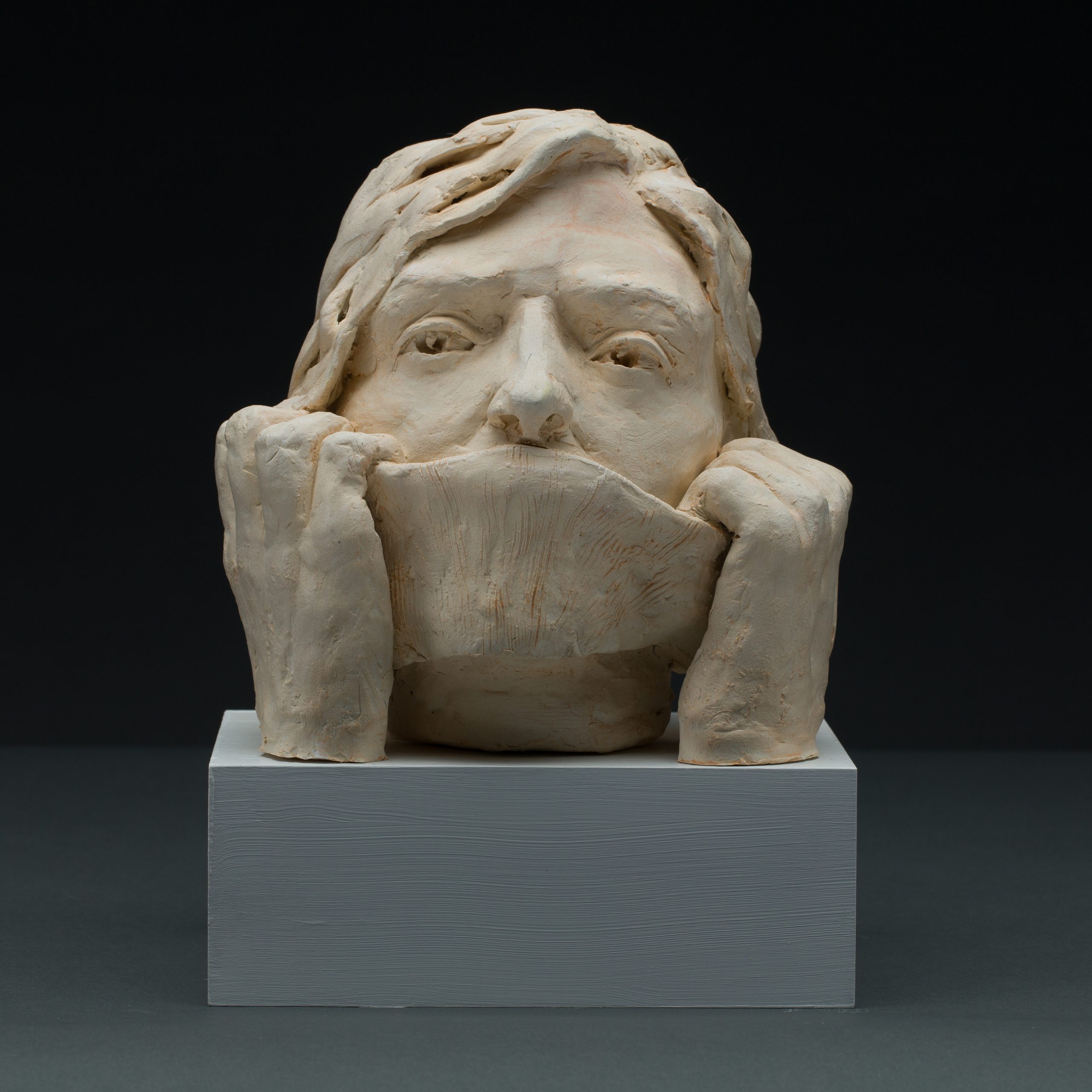 Sculpted high-fire stoneware.  Mounted on a wooden block.